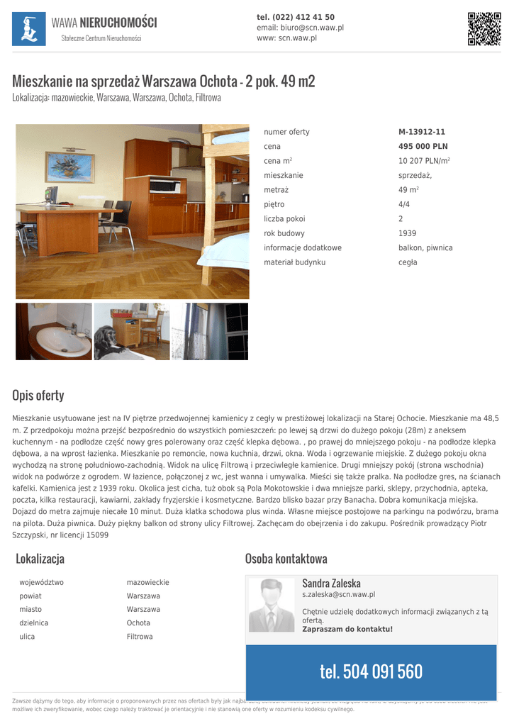 tel. (022) 412 41 50 email: [email protected] www: scn.waw.pl Mieszkanie na sprzedaż Warszawa Ochota - 2 pok. 49 m2 Lokalizacja: mazowieckie, Warszawa, Warszawa, Ochota, Filtrowa numer oferty M-13912-11 cena 495 000 PLN cena m 10 207 PLN/m2 mieszkanie sprzedaż, metraż 49 m2 piętro 4/4 liczba pokoi 2 rok budowy 1939 informacje dodatkowe balkon, piwnica materiał budynku cegła 2 Opis oferty Mieszkanie usytuowane jest na IV piętrze przedwojennej kamienicy z cegły w prestiżowej lokalizacji na Starej Ochocie. Mieszkanie ma 48,5 m. Z przedpokoju można przejść bezpośrednio do wszystkich pomieszczeń: po lewej są drzwi do dużego pokoju (28m) z aneksem kuchennym - na podłodze część nowy gres polerowany oraz część klepka dębowa. , po prawej do mniejszego pokoju - na podłodze klepka dębowa, a na wprost łazienka. Mieszkanie po remoncie, nowa kuchnia, drzwi, okna. Woda i ogrzewanie miejskie. Z dużego pokoju okna wychodzą na stronę południowo-zachodnią. Widok na ulicę Filtrową i przeciwległe kamienice. Drugi mniejszy pokój (strona wschodnia) widok na podwórze z ogrodem. W łazience, połączonej z wc, jest wanna i umywalka. Mieści się także pralka. Na podłodze gres, na ścianach kafelki. Kamienica jest z 1939 roku. Okolica jest cicha, tuż obok są Pola Mokotowskie i dwa mniejsze parki, sklepy, przychodnia, apteka, poczta, kilka restauracji, kawiarni, zakłady fryzjerskie i kosmetyczne. Bardzo blisko bazar przy Banacha. Dobra komunikacja miejska. Dojazd do metra zajmuje niecałe 10 minut. Duża klatka schodowa plus winda. Własne miejsce postojowe na parkingu na podwórzu, brama na pilota. Duża piwnica. Duży piękny balkon od strony ulicy Filtrowej. Zachęcam do obejrzenia i do zakupu. Pośrednik prowadzący Piotr Szczypski, nr licencji 15099 Lokalizacja Osoba kontaktowa Sandra Zaleska województwo mazowieckie powiat Warszawa [email protected] miasto Warszawa dzielnica Ochota ulica Filtrowa Chętnie udzielę dodatkowych informacji związanych z tą ofertą. Zapraszam do kontaktu! tel. 504 091 560 Zawsze dążymy do tego, aby informacje o proponowanych przez nas ofertach były jak najbardziej dokładne. Niekiedy jednak, ze względu na fakt, iż uzyskujemy je od osób trzecich nie jest możliwe ich zweryfikowanie, wobec czego należy traktować je orientacyjnie i nie stanowią one oferty w rozumieniu kodeksu cywilnego.