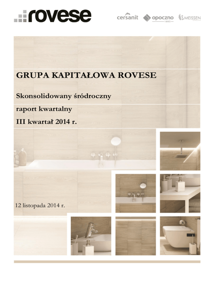 Grupa Kapitałowa Rovese III kwartał 2014 r. GRUPA KAPITAŁOWA ROVESE Skonsolidowany śródroczny raport kwartalny III kwartał 2014 r. r. 12 listopada 2014 r. 12 listopada 2014 r. Strona 1 Grupa Kapitałowa Rovese III kwartał 2014 r. Spis treści Spis treści ......................................................................................................................................................................2 Wprowadzenie .............................................................................................................................................................4 Informacje podstawowe ..............................................................................................................................................4 I. Skrócone skonsolidowane sprawozdanie finansowe na dzień 30 września 2014 r. oraz za okres 9 miesięcy zakończonych 30 września 2014 r. sporządzone według Międzynarodowych Standardów Sprawozdawczości Finansowej w wersji zatwierdzonej przez Unię Europejską ..............5 Wybrane skonsolidowane dane finansowe Grupy Kapałowej Rovese......................................................5 Skonsolidowany bilans .....................................................................................................................................6 Skonsolidowany rachunek zysków i strat .....................................................................................................8 Skonsolidowane sprawozdanie z całkowitych dochodów ..........................................................................9 Zestawienie zmian w skonsolidowanym kapitale własnym .......................................................................10 Skonsolidowane sprawozdanie z przepływów pieniężnych ......................................................................13 II. Skrócone jednostkowe sprawozdanie finansowe na dzień 30 września 2014 r. oraz za okres 9 miesięcy zakończonych 30 wrzesnia 2014 r. sporządzone według Międzynarodowych Standardów Sprawozdawczości Finansowej w wersji zatwierdzonej przez Unię Europejską ..............14 Wybrane jednostkowe dane finansowe Rovese SA ......................................................................................14 Bilans ..................................................................................................................................................................15 Rachunek zysków i strat ..................................................................................................................................17 Sprawozdanie z całkowitych dochodów........................................................................................................18 Zestawienie zmian w kapitale własnym .......................................................................................................19 Sprawozdanie z przepływów pieniężnych ...................................................................................................21 III. Informacja dodatkowa do raportu okresowego (SA-QSr) Grupy Kapitałowej Rovese za III kwartał 2014 r. ...................................................................................................................................................22 Informacja o zasadach przyjętych przy sporządzaniu raportu, w szczególności informację o zmianach stosowanych zasad (polityki) rachunkowości, oraz informacje o istotnych zmianach wielkości szacunkowych, w tym o korektach z tytułu rezerw, rezerwie i aktywach z tytułu odroczonego podatku dochodowego, dokonanych odpisach aktualizujących wartości składników aktywów ........................................................................................................................................22 Segmenty operacyjne .......................................................................................................................................24 Opis czynników i zdarzeń, w szczególności o nietypowym charakterze, mających znaczący wpływ na osiągnięte wyniki finansowe. Zwięzły opis istotnych dokonań lub niepowodzeń Emitenta w okresie, którego dotyczy raport, wraz z wykazem najważniejszych zdarzeń ich dotyczących .......................................................................................................................................................25 Objaśnienia dotyczące sezonowości lub cykliczności działalności Grupy w prezentowanym okresie .................................................................................................................................................................28 Informacje dotyczące emisji, wykupu i spłaty dłużnych i kapitałowych papierów wartościowych Rovese S.A. .............................................................................................................................28 Informacje dotyczące wypłaconej (lub zadeklarowanej) dywidendy, łącznie i w przeliczeniu na jedną akcję Rovese S.A., z podziałem na akcje zwykłe i uprzywilejowane ..............................................28 Wskazanie zdarzeń, które wystąpiły po dniu, na który sporządzono sprawozdania finansowe, nieujętych w tych sprawozdaniach, a mogących w znaczący sposób wpłynąć na przyszłe wyniki finansowe Spółki i Grupy Kapitałowej Rovese ...............................................................................29 Informacja dotycząca zmian zobowiązań warunkowych lub aktywów warunkowych, które nastąpiły od czasu zakończenia ostatniego roku obrotowego ...................................................................29 Opis organizacji Grupy, ze wskazaniem jednostek podlegających konsolidacji .....................................29 1. 2. 3. 4. 5. 6. 7. 8. 9. 12 listopada 2014 r. Strona 2 Grupa Kapitałowa Rovese 10. 11. 12. 13. 14. 15. 16. 17. 18. 19. III kwartał 2014 r. Wskazanie skutków zmian w strukturze jednostki gospodarczej, w tym