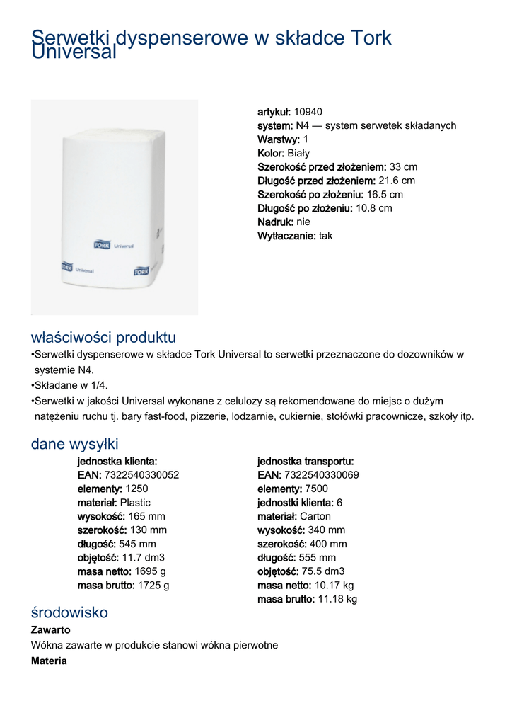Serwetki dyspenserowe w składce Tork Universal artykuł: 10940 system: N4 — system serwetek składanych Warstwy: 1 Kolor: Biały Szerokość przed złożeniem: 33 cm Długość przed złożeniem: 21.6 cm Szerokość po złożeniu: 16.5 cm Długość po złożeniu: 10.8 cm Nadruk: nie Wytłaczanie: tak właściwości produktu •Serwetki dyspenserowe w składce Tork Universal to serwetki przeznaczone do dozowników w systemie N4. •Składane w 1/4. •Serwetki w jakości Universal wykonane z celulozy są rekomendowane do miejsc o dużym natężeniu ruchu tj. bary fast-food, pizzerie, lodzarnie, cukiernie, stołówki pracownicze, szkoły itp. dane wysyłki jednostka klienta: EAN: 7322540330052 elementy: 1250 materiał: Plastic wysokość: 165 mm szerokość: 130 mm długość: 545 mm objętość: 11.7 dm3 masa netto: 1695 g masa brutto: 1725 g jednostka transportu: EAN: 7322540330069 elementy: 7500 jednostki klienta: 6 materiał: Carton wysokość: 340 mm szerokość: 400 mm długość: 555 mm objętość: 75.5 dm3 masa netto: 10.17 kg masa brutto: 11.18 kg środowisko Zawarto Wókna zawarte w produkcie stanowi wókna pierwotne Materia Wókna pierwotne Pulpa zawierajca wókna jest produkowana z drewna mikkiego lub twardego. Proces de lignifikacji odbywa si za pomoc siarczków lub siarczanów, co powoduje e lignina oraz ywice s usuwane z materiau celulozowego. Wybielanie wókien Wybielanie stanowi proces oczyszczania wókien, majcy na celu uzyskanie jasnej pulpy ale równie otrzymanie pulpy o okrelonej czystoci, speniajcej wymagania higieny oraz, w pewnych przypadkach, wymagania bezpieczestwa ywnoci. Obecnie stosuje si róne metody wybielania: ECF (bez stosowania chloru gazowego), z uyciem dwutlenku chloru oraz TCF (bez stosowania chloru i jego zwizków), w której to metodzie wykorzystywany jest ozon, tlen oraz nadtlenek wodoru. Substancje chemiczne Substancje chemiczne stosowane w produkcji, jak równie substancje czynne podlegaj ocenie pod wzgldem bezpieczestwa rodowiska, bezpieczestwa i higieny pracy oraz bezpieczestwa produktu jako takiego. Zastosowane substancje czynne obejmuj: Czynnik suszcy Barwnik = jeli produkt barwiony Czynniki utrwalajce Fluorescencyjny czynnik wybielajcy Klej Zmikczacze Substancje procesowe: Czynnik stabilizujco-zabezpieczajcy Substancja powlekajca Reduktor piany Czynniki dyspergujce, kontrolujce napicie powierzchniowe, pH oraz adunek Substancje wspomagajce retencj Substancje degradujce Substancje wspomagajce odpyw Bezpieczestwo produktu Produkt spenia wymagania prawne w odniesieniu do bezpieczestwa ywnoci. Opakowanie. Opakowanie spenia wymogi Dyrektywy ws. opakowa oraz ich odpadów (94/62/WE): Tak Produkcja Produkt jest wytwarzany w fabryce w Mediona, Hiszpania. Odpady Serwetki mog by przetwarzane w normalnych systemach odpadów komunalnych. Zuyte serwetki nie powinny by przekazywane do systemów recyclingu.