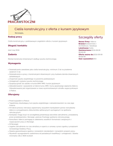 Cieśla konstrukcyjny z oferta z kursem językowym Norwegia, Rodzaj pracy Szczegóły oferty Cieśla konstrukcyjny z podstawowym angielskim oferta z kursem językowym Nazwa firmy: Adecco Branża:Budownictwo / Architektura / Geodezja Lokalizacja:Cieśla Zamieszczono:2016-08-09 00:00:00 Oferta ważna do:2016-09-09 00:00:00 Ilość wyświetleń:943 Długość kontaktu start maj 2016 Zadania Montaż konstrukcji drewnianych według rysunku technicznego. Wymagania ● ● ● ● ● ● Doświadczenie zawodowe jako cieśla konstrukcyjny: minimum 3 lat na przełomie ostatnich 5 lat. Doświadczenie w pracy z konstrukcjami drewnianymi: przy budowie domów drewnianych szkieletowych Znajomość języka angielskiego na poziomie podstawowym Umiejętność czytania rysunku technicznego Dyspozycyjność do udziału w kursie BHP/ HMS i kursie językowym Zakwaterowanie i wyżywienie w trakcie kursu HMS i kursu językowego zapewnia Adecco. Zakwaterowanie jest organizowane w nowo wyremontowanym ośrodku wypoczynkowym w Rabce. Oferujemy ● ● ● ● ● ● ● ● ● Przed wyjazdem w Polsce: Tygodniowy doszkalający kurs języka angielskiego z zakwaterowaniem na czas jego trwania W trakcie procesu rekrutacji zapewniamy wszystkim kandydatom pomoc konsultanta Adecco w przygotowaniu dokumentów aplikacyjnych wymaganych na spotkaniu rekrutacyjnym. Kandydaci mogą liczyć na szczegółową prezentację warunków zatrudnienia, prowadzoną przez przedstawiciela z Norwegii, podczas finalnego spotkania rekrutacyjnego. Konsultanci Adecco pomagają w załatwieniu wszelkich formalności związanych z rozpoczęciem pracy w Norwegii. W Norwegii: Legalne zatrudnienie na czas określony w oparciu o umowę o prace zgodną z przepisami norweskiego Kodeksu Pracy Stawka gwarantowana zgodna z norweskimi standardami i norweskim prawem pracy. Wysokość wynagrodzenia uzależniona od posiadanych kwalifikacji i umiejętności. Stawka minimalna 181,5 NOK brutto/h ● ● ● ● ● Możliwość długoterminowej współpracy Ubezpieczenie od nieszczęśliwych wypadków w miejscu pracy Pomoc z znalezieniu zakwaterowania w Norwegii Możliwość skorzystania z programu Adecco Fordel oferującego m.in. pakiety rabatowe, dofinansowanie szkoleń lub zajęć poza godzinami pracy (np. zajęcia sportowe, sprzęt sportowy). W wyniku zatrudnia w oparciu o norweską umowę pracy pracownikom przysługują inne świadczenia jak np.: pełne ubezpieczenie zdrowotne, odprowadzanie składek emerytalnych, zasiłek na dzieci itp. Etapy rekrutacji ● ● ● ● Adecco Poland Sp. z o.o. należy do międzynarodowej korporacji Adecco S.A. światowego lidera wśród firm doradztwa personalnego, który posiada 5100 placówek w ponad 60 krajach. W Polsce działamy od 1994 roku. Swoją wiedzą i doświadczeniem służymy w ponad 50 lokalizacjach na terenie kraju. W 2015 roku pracę dzięki Adecco Poland znalazło ponad 60 000 osób. Adecco Poland Sp. z o.o. jest Agencją Zatrudnienia nr 364. Aktualnie dla naszego klienta, międzynarodowej firmy z kapitałem zagranicznym poszukujemy osób na stanowisko: Cieśla konstrukcyjny z podstawowym angielskim Norwegia (oferta z kursem językowym)