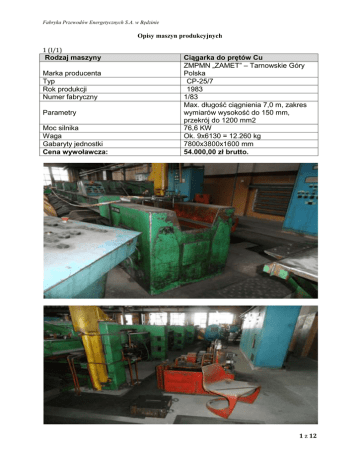 Fabryka Przewodów Energetycznych S.A. w Będzinie Opisy maszyn produkcyjnych 1 (I/1) Rodzaj maszyny Marka producenta Typ Rok produkcji Numer fabryczny Parametry Moc silnika Waga Gabaryty jednostki Cena wywoławcza: Ciągarka do prętów Cu ZMPMN „ZAMET” – Tarnowskie Góry Polska CP-25/7 1983 1/83 Max. długość ciągnienia 7,0 m, zakres wymiarów wysokość do 150 mm, przekrój do 1200 mm2 76,6 KW Ok. 9x6130 = 12.260 kg 7800x3800x1600 mm 54.000,00 zł brutto. 1 z 12 Fabryka Przewodów Energetycznych S.A. w Będzinie Opisy maszyn produkcyjnych 2 (I/2) Rodzaj maszyny Marka producenta Typ Rok produkcji Numer fabryczny Wyposażenie Moc silników Waga Gabaryty jednostki (klatki) Cena wywoławcza: Ciągarka bezpoślizgowa 9 klocowa VEB Drahtzechmaschinenfabrik GRUNA DRESDEN Niemcy UDZSA 1991 1939/890107/1 Przewijarka UDS-632, zaostrzarka drutów Udup, zgrzewarka, rozwijak nr 1759 oraz 9 szt. zdemontowanych silników 9 x 30,0 KW=270KW Ok. 9 x 2800 =25 200 kg 1900 x 1500 x 2200 mm 46.000,00 zł brutto. 2 z 12 Fabryka Przewodów Energetycznych S.A. w Będzinie Opisy maszyn produkcyjnych 3 (I/3) Rodzaj maszyny Marka producenta Typ Rok produkcji Numer fabryczny Wyposażenie Moc silnika Waga zestawu Gabaryty Cena wywoławcza: Prasa hydrauliczna z pompą nacisk 1000T Brak danych – przekazana przez Walcownie Metali, Czechowice-Dziedzice, Polska w 1970 Nie określono 1935 Nie posiada + pompa nurnikowa trzysegmentowa, wanna do schładzania prasówki Cu 162,0 KW Ok. 35.000 kg Ok.8600 x12 000 x5400 mm 42.000,00 zł brutto. 3 z 12 Fabryka Przewodów Energetycznych S.A. w Będzinie Opisy maszyn produkcyjnych 4 (I/4) Rodzaj maszyny Marka producenta Typ Rok produkcji Numer fabryczny Wyposażenie Moc silników Waga Gabaryty jednostki (klatki) Numer fabryczny silników Cena wywoławcza: Ciągarka profili 3 klatkowa do przeciągania profili w zakresie do 12mm Maschinenfabrik HERBORN NIEMCY HG 10/3 1975 maszyny 75/21633/III + rozwijak, numer fabryczny 1756 3x30,0 KW + 15,0 KW Ok. 3x3400+1500 = 11.700 kg 1900x1500x2200 mm 290/106,107,108 36.000,00 zł brutto. 4 z 12 Fabryka Przewodów Energetycznych S.A. w Będzinie Opisy maszyn produkcyjnych 5 (I/5) Rodzaj maszyny Marka producenta Typ Rok produkcji Numer fabryczny Wyposażenie Moc silników Waga Gabaryty jednostki (klatki) Cena wywoławcza: Ciągarka profili 3 klatkowa MALMEDIE MASCHINENFABRIK Gmbh DUSSELDORF NIEMCY EH – 2,5 1975 12412 Silniki Nr fabr.751963,751964,751965 3x30,0 KW + 15,0 KW Ok. 3x3400+1500 = 11.700 kg 1900x1500x2200 mm 33.210,00 zł brutto. 5 z 12 Fabryka Przewodów Energetycznych S.A. w Będzinie Opisy maszyn produkcyjnych 6 (I/6) Rodzaj maszyny Marka producenta Typ Rok produkcji Numer fabryczny Wyposażenie Moc silników Masa Gabaryty Cena wywoławcza: Walcarka sektorów profili Al. „Polkabel” Kraków – Polska 11210 1971 255 + nawijarka NJ 2500, Nr fabryczny 2742 Ok. 2 x 25,0 KW Ok. 8000 kg 3600 x 2500 x 2800 mm 22.140,00 zł brutto. 6 z 12 Fabryka Przewodów Energetycznych S.A. w Będzinie Opisy maszyn produkcyjnych 7 (I/7) Rodzaj maszyny Marka producenta Typ Rok produkcji Numer fabryczny Wyposażenie Moc silników Waga Gabaryty jednostki (klatki) Cena wywoławcza: Ciągarka 2 bębnowa poziomowa Maschinenfabrik HERBORN NIEMCY Wykonawca-Fabryka Kabli „ Załom” Szczecin HG - IV 1968 maszyny 68/21215/I/II 2 klocowa do ciągnienia drutów Al przekrój 15x30 mm 2x30,0 KW + 15,0 KW Ok. 3x3400+1500 = 11.700 kg 1900x1500x2200 mm 22.140,00 zł brutto. 7 z 12 Fabryka Przewodów Energetycznych S.A. w Będzinie Opisy maszyn produkcyjnych 8 (I/8) Rodzaj maszyny Marka producenta Typ Rok produkcji Numer fabryczny Wyposażenie Moc grzewcza Waga Gabaryty jednostki (klatki) Cena wywoławcza: Nagrzewnica indukcyjna wlewków Cu ZMPMN „ZAMET”– STRZYBNICA - POLSKA Brak danych 1974 Nie ustalono Silniki Nr fabr.751963,751964,751965 0,55 KW Ok.4.000 kg 4800x1300x2400 mm 8.000,00 zł brutto. 8 z 12 Fabryka Przewodów Energetycznych S.A. w Będzinie Opisy maszyn produkcyjnych 9 (I/9) Rodzaj maszyny Marka producenta Typ Rok produkcji Numer fabryczny Wyposażenie Waga Gabaryty Moc silnika Cena wywoławcza: Prasa mimośrodowa stała Ponar – Plasomat Częstochowa Zakład Nr 3 - POLSKA PMS – 16S 1979 61 Silniki Nr fabr. 751963,751964, 751965 1200 kg 1050x980x1950mm 4,5 KW 3.400,00 zł brutto. 9 z 12 Fabryka Przewodów Energetycznych S.A. w Będzinie Opisy maszyn produkcyjnych 10 (I/10) 10 z 12 Fabryka Przewodów Energetycznych S.A. w Będzinie Opisy maszyn produkcyjnych 11 (I/11) Rodzaj maszyny Marka producenta Typ Rok produkcji Numer fabryczny Wyposażenie Moc silnika Waga Gabaryty Cena wywoławcza: Zaostrzarka drutów KESERLING SOLINGEN NIEMCY Brak danych 1937 Nie posiada Średnica walców 178 mm 11,0 KW Ok. 800 kg 1850x1100x1470 mm 1.600,00 zł brutto. 11 z 12 Fabryka Przewodów Energetycznych S.A. w Będzinie Opisy maszyn produkcyjnych 12 (I/12) Rodzaj maszyny Marka producenta Typ Rok produkcji Numer fabryczny Moc zainstalowana Waga Gabaryty Cena wywoławcza: Piec muflowy Nie ustalono Brak danych 1979 5536 Ok. 2,5 Kw Ok. 120 kg 950x850x850mm 1.000,00 zł brutto. 12 z 12