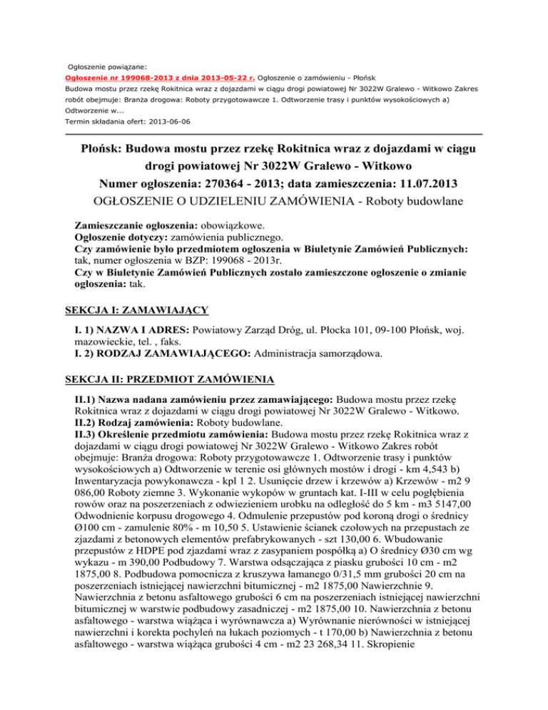 Ogłoszenie powiązane: Ogłoszenie nr 199068-2013 z dnia 2013-05-22 r. Ogłoszenie o zamówieniu - Płońsk Budowa mostu przez rzekę Rokitnica wraz z dojazdami w ciągu drogi powiatowej Nr 3022W Gralewo - Witkowo Zakres robót obejmuje: Branża drogowa: Roboty przygotowawcze 1. Odtworzenie trasy i punktów wysokościowych a) Odtworzenie w... Termin składania ofert: 2013-06-06 Płońsk: Budowa mostu przez rzekę Rokitnica wraz z dojazdami w ciągu drogi powiatowej Nr 3022W Gralewo - Witkowo Numer ogłoszenia: 270364 - 2013; data zamieszczenia: 11.07.2013 OGŁOSZENIE O UDZIELENIU ZAMÓWIENIA - Roboty budowlane Zamieszczanie ogłoszenia: obowiązkowe. Ogłoszenie dotyczy: zamówienia publicznego. Czy zamówienie było przedmiotem ogłoszenia w Biuletynie Zamówień Publicznych: tak, numer ogłoszenia w BZP: 199068 - 2013r. Czy w Biuletynie Zamówień Publicznych zostało zamieszczone ogłoszenie o zmianie ogłoszenia: tak. SEKCJA I: ZAMAWIAJĄCY I. 1) NAZWA I ADRES: Powiatowy Zarząd Dróg, ul. Płocka 101, 09-100 Płońsk, woj. mazowieckie, tel. , faks. I. 2) RODZAJ ZAMAWIAJĄCEGO: Administracja samorządowa. SEKCJA II: PRZEDMIOT ZAMÓWIENIA II.1) Nazwa nadana zamówieniu przez zamawiającego: Budowa mostu przez rzekę Rokitnica wraz z dojazdami w ciągu drogi powiatowej Nr 3022W Gralewo - Witkowo. II.2) Rodzaj zamówienia: Roboty budowlane. II.3) Określenie przedmiotu zamówienia: Budowa mostu przez rzekę Rokitnica wraz z dojazdami w ciągu drogi powiatowej Nr 3022W Gralewo - Witkowo Zakres robót obejmuje: Branża drogowa: Roboty przygotowawcze 1. Odtworzenie trasy i punktów wysokościowych a) Odtworzenie w terenie osi głównych mostów i drogi - km 4,543 b) Inwentaryzacja powykonawcza - kpl 1 2. Usunięcie drzew i krzewów a) Krzewów - m2 9 086,00 Roboty ziemne 3. Wykonanie wykopów w gruntach kat. I-III w celu pogłębienia rowów oraz na poszerzeniach z odwiezieniem urobku na odległość do 5 km - m3 5147,00 Odwodnienie korpusu drogowego 4. Odmulenie przepustów pod koroną drogi o średnicy Ø100 cm - zamulenie 80% - m 10,50 5. Ustawienie ścianek czołowych na przepustach ze zjazdami z betonowych elementów prefabrykowanych - szt 130,00 6. Wbudowanie przepustów z HDPE pod zjazdami wraz z zasypaniem pospółką a) O średnicy Ø30 cm wg wykazu - m 390,00 Podbudowy 7. Warstwa odsączająca z piasku grubości 10 cm - m2 1875,00 8. Podbudowa pomocnicza z kruszywa łamanego 0/31,5 mm grubości 20 cm na poszerzeniach istniejącej nawierzchni bitumicznej - m2 1875,00 Nawierzchnie 9. Nawierzchnia z betonu asfaltowego grubości 6 cm na poszerzeniach istniejącej nawierzchni bitumicznej w warstwie podbudowy zasadniczej - m2 1875,00 10. Nawierzchnia z betonu asfaltowego - warstwa wiążąca i wyrównawcza a) Wyrównanie nierówności w istniejącej nawierzchni i korekta pochyleń na łukach poziomych - t 170,00 b) Nawierzchnia z betonu asfaltowego - warstwa wiążąca grubości 4 cm - m2 23 268,34 11. Skropienie międzywarstwowe nawierzchni bitumicznej emulsją asfaltową szybkorozpadową w ilości 0,3 kg/m2 - m2 23 268,34 12. Nawierzchnia z betonu asfaltowego - warstwa ścieralna gr. 3 cm - m2 22 906,50 Roboty wykończeniowe 13. Uzupełnienie poboczy drogi pospółką o grubości warstwy 7 cm - m2 15 528,00 Urządzenia bezpieczeństwa ruchu 14. Ustawienie pionowych znaków drogowych - szt 18,00 Branża mostowa Roboty przygotowawcze 1. Roboty geodezyjne a) Odtworzenie w terenie osi głównych mostu wraz z punktami wysokościowymi - km 0,050 b) Inwentaryzacja powykonawcza - kpl 1 Roboty ziemne 2. Wykopy w gruncie kat I-III a) Wykopy w gruncie kat. I-III w celu odkopania istniejącego przepustu i pod ławy fundamentowe nowego mostu na odkład - m3 250,00 b) Pompowanie wody z wykopu na czas wykonania wykopów oraz wykonania, zaizolowania i zasypania ław fundamentowych. Przyjęto 200 m-g - m-g 200,00 3. Odtworzenie nasypu na dojazdach do mostu z poszerzeniem z gruntu z odkładu z ewentualnym rozplantowaniem na miejscu nadmiaru - m3 250,00 Podbudowy 4. Oczyszczenie i skropienie warstw konstrukcyjnych nawierzchni lepiszczem bitumicznym - m2 180 5. Podbudowa z kruszywa łamanego stabilizowanego mechanicznie ze sprowadzeniem do warstw o grubości 20 cm - m2 80,60 Nawierzchnie 6. Nawierzchnia z BA o grubości warstwy 4,5 cm - warstwa wiążąca - m2 120,00 7. Nawierzchnia z BA o grubości 4,0 cm - warstwa ścieralna - m2 120,00 Roboty wykończeniowe 8. Umocnienie skarp nasypów przy skrzydełkach a) Umocnienie stożków nasypu elementami betonowymi drobnowymiarowymi na podsypce cementowo - piaskowej o gr. warstwy 3 cm - m2 18,00 b) Fundament podwalinowy do podtrzymania umocnienia z krawężnika betonowego 15x30 cm - m 13,00 9. Umocnienie powierzchniowe skarp nasypów, poza umocnieniami elementami betonowymi przez humusowanie z obsianiem trawą - m2 48,00 Urządzenia bezpieczeństwa ruchu 10. Tymczasowan organizacja ruchu na czas budowy mostu - kpl 1,00 Elementy ulic 11. Krawężnik betonowy zanikający 20x30 cm na ławie fundamentowej z oporem - m 5,00 12. Chodnik z kostki betonowej o grubości 6 cm - m2 12,30 13. Obrzeża betonowe chodnikowe 8x30 cm - m 14,00 Zbrojenie 14. Stal zbrojeniowa kl. A-IIIN a) Na ławy fundamentowe - kg 3229,00 b) Na konstrukcję ramy mostu wraz ze skrzydełkami - kg 4 006,00 c) Na płyty przejściowe - kg 1 076,00 Beton 15. Beton kl. C 25/30 (B 30) i wyżej a) Na ławy fundamentowe kl. C 30/37 (B35) - m3 40,74 b) Na konstrukcję ramy mostu ze skrzydełkami kl. C 30/37 (B35) - m3 40,41 c) Na Płyty przejściowe kl. C 25/30 (B30) - m3 8,14 16. Beton niekonwstrukcyjny klasy poniżej c 20/25 - C 12/15 /(B15) a) Beton kl. C 12/15 (B15) na korek pod ławy fundamentowe i płyty przejściowe- m3 7,72 Nawierzchnie i izolacje 17. Izolacje cienkie z roztworów asfaltowych na zimno na powierzchniach betonowych stykających się z gruntem - m2 193,00 18. Izolacja z papy termozgrzewalnej na płycie nadbetonu na stykach prefabrykatów pasami szer. 0,33 m (1/3 szerokości rolki 