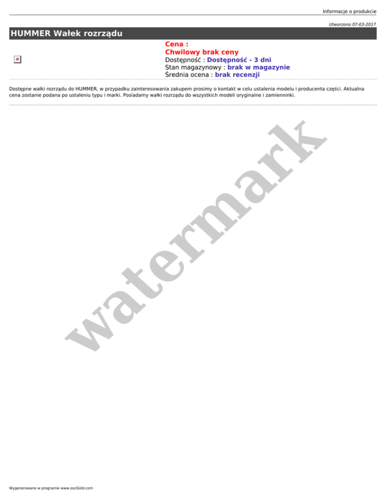 Informacje o produkcie Utworzono 07-03-2017 HUMMER Wałek rozrządu Cena : Chwilowy brak ceny Dostępność : Dostępność - 3 dni Stan magazynowy : brak w magazynie Średnia ocena : brak recenzji w at er m ar k Dostępne wałki rozrządu do HUMMER, w przypadku zainteresowania zakupem prosimy o kontakt w celu ustalenia modelu i producenta części. Aktualna cena zostanie podana po ustaleniu typu i marki. Posiadamy wałki rozrządu do wszystkich modeli oryginalne i zamienninki. Wygenerowano w programie www.oscGold.com