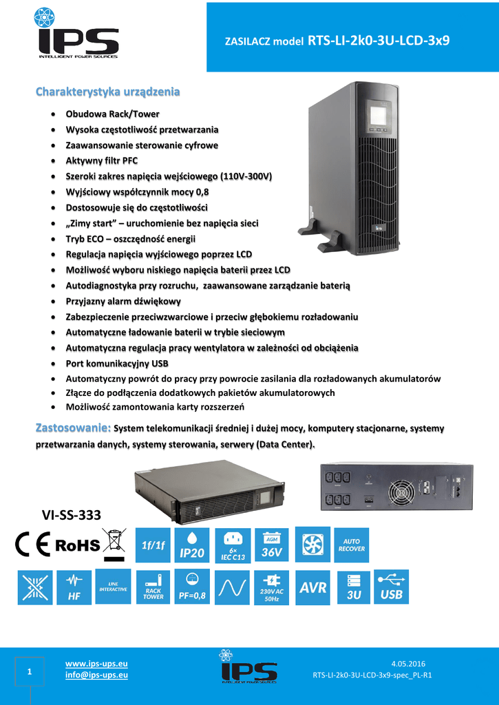ZASILACZ model RTS-LI-2k0-3U-LCD-3x9 Charakterystyka urządzenia Obudowa Rack/Tower Wysoka częstotliwość przetwarzania Zaawansowanie sterowanie cyfrowe Aktywny filtr PFC Szeroki zakres napięcia wejściowego (110V-300V) Wyjściowy współczynnik mocy 0,8 Dostosowuje się do częstotliwości „Zimy start” – uruchomienie bez napięcia sieci Tryb ECO – oszczędność energii Regulacja napięcia wyjściowego poprzez LCD Możliwość wyboru niskiego napięcia baterii przez LCD Autodiagnostyka przy rozruchu, zaawansowane zarządzanie baterią Przyjazny alarm dźwiękowy Zabezpieczenie przeciwzwarciowe i przeciw głębokiemu rozładowaniu Automatyczne ładowanie baterii w trybie sieciowym Automatyczna regulacja pracy wentylatora w zależności od obciążenia Port komunikacyjny USB Automatyczny powrót do pracy przy powrocie zasilania dla rozładowanych akumulatorów Złącze do podłączenia dodatkowych pakietów akumulatorowych Możliwość zamontowania karty rozszerzeń Zastosowanie: System telekomunikacji średniej i dużej mocy, komputery stacjonarne, systemy przetwarzania danych, systemy sterowania, serwery (Data Center). VI-SS-333 1 www.ips-ups.eu [email protected] 4.05.2016 RTS-LI-2k0-3U-LCD-3x9-spec_PL-R1 ZASILACZ model RTS-LI-2k0-3U-LCD-3x9 Parametry techniczne RTS-LI-2k0-3U-LCD-3x9 MODEL Moc znamionowa (pozorna/czynna) 2kVA/1800W WEJŚCIE Napięcie wejściowe Zakres napięcia wejściowego Współczynnik mocy 230Vac Pełna moc (230Vac) ± 26% , 45-55Hz ± 0,5%Hz ≥ 0,9 WYJŚCIE Napięcie wyjściowe Częstotliwość napięcia wyjściowego 220V/230V/240VAC ± 265 ustawienie dostępne poprzez LCD – tryb bateryjny 220V/230V/240VAC ± 265 ustawienie dostępne poprzez LCD – sieciowy Zsynchronizowana w trybie sieciowym, 50/60Hz ± 0,2Hz w trybie bateryjnym Kształt napięcia wyjściowego Czysty sinus Zniekształcenia harmoniczne ≤ 5% (obciążenie liniowe), Czas przełączenia na UPS Gniazda wyjściowe Z trybu AC do bateryjnego: 8ms 6x IEC C13 SPRAWNOŚĆ Tryb sieciowy/AC Tryb bateryjny ≤ 98% ≤ 85% (obciążenie liniowe) BATERIA Napięcie stałe Konfiguracja Prąd ładowania (standardowy) Prąd ładowania (opcja) Czas podtrzymania (min. )100%/75%/50% Czas ładowania Dodatkowe kasety bateryjne (opcja) 36V 3x12V/9Ah 1A 1-5A (standardowo 1A) 2 min / 4min / 7min 8 godzin dla 90% pojemności KU-BAT-2URT-3x9-36 (max 4szt), KU-BAT-2URT-6x9-24 (max 2szt), ALARMY Niski poziom baterii Przeciążenie Tryb bateryjny Sygnał krótki co sekundę o czasie 0,16sek i 0,16sek przerwy Długi sygnał o czasie 2sek i 0,5sek przerwy Krótki dźwięk co 5 sekund, wygaszony po 60sek PARAMETRY ŚRODOWISKOWE Wilgotność względna w czasie pracy Poziom hałasu 20~90% RH @ 0~40°C (bez kondensacji) ≤ 5 dB (1m) KOMUNIKACJA W standardzie USB SNMP (opcja) Styki bezpotencjałowe (opcja) Wsparcie dla Windows®98/2000/2003/XP/Vista/2008/Windows®7/Windows®8 Zarządzenie z poziomu managera SNMP i przeglądarki www Możliwość dołożenia karty WYMIARY I WAGA Waga netto/brutto (kg) Wymiary szer./gł./wys. (mm) w/l(d)/h Wymiary opakowania szer./gł./wys. (mm) 2 www.ips-ups.eu [email protected] 21,3/24,5 440x410(430)x132 505x611x235 4.05.2016 RTS-LI-2k0-3U-LCD-3x9-spec_PL-R1 ZASILACZ model RTS-LI-2k0-3U-LCD-3x9 NORMY Dyrektywa niskonapięciowa EN62040-1:2008+A1:2013 Kompatybilność elektromagnetyczna EN62040-2:2006 EN61000-3-2:2014 Class A Rysunek techniczny: Akcesoria standardowe: Akcesoria dodatkowe (opcje): - akumulatory 12V/9Ah - port USB - akumulator MW 7.2-12, MWH 9-12, MWL 9-12L - przewód USB - kasetka bateryjna serii KU-BAT - oprogramowanie UPSmart - karta SNMP - uchwyty RACK - karta przekaźnikowa AS400 - uchwyty wolnostojące - przewód IECC14-IECC13 - przewód zasilający - instrukcja obsługi 3 www.ips-ups.eu [email protected] 4.05.2016 RTS-LI-2k0-3U-LCD-3x9-spec_PL-R1
