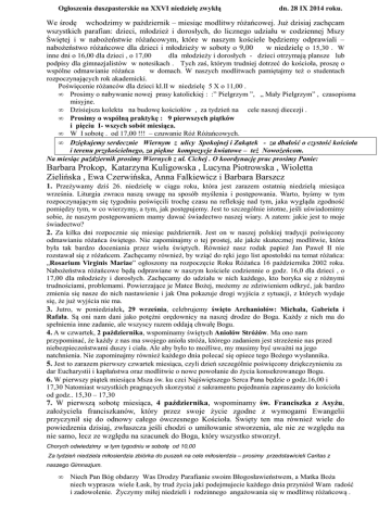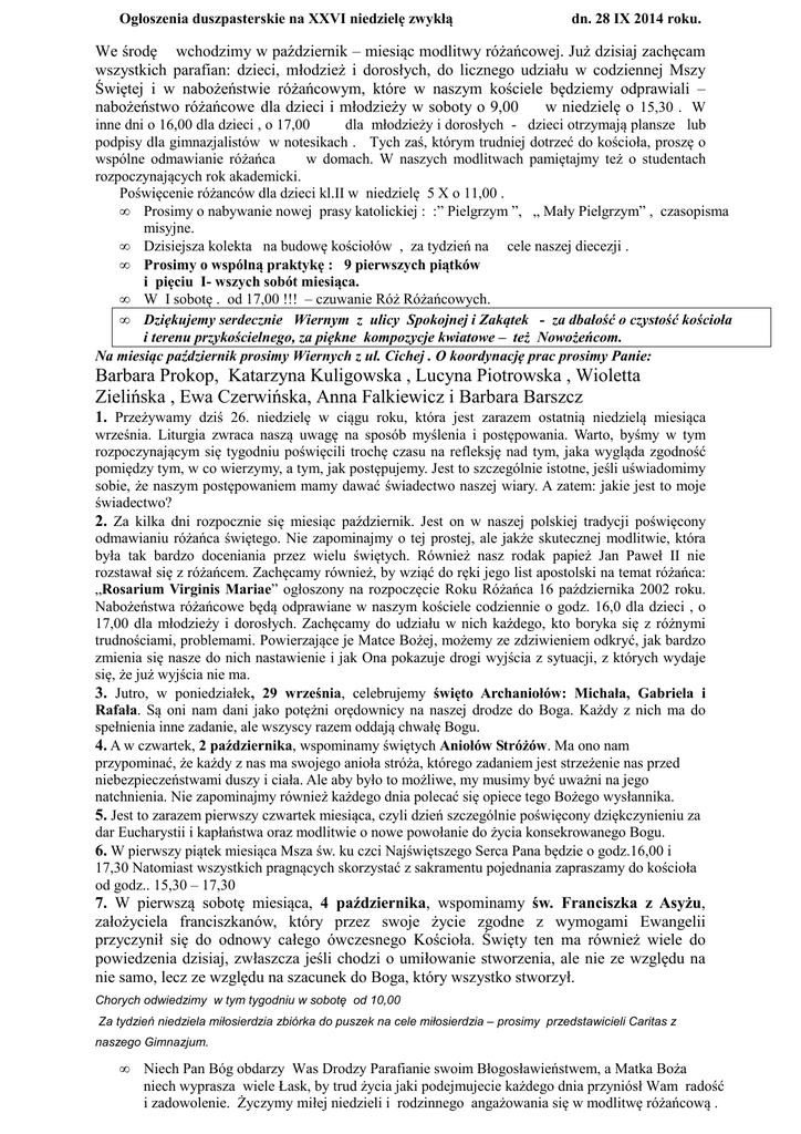Ogłoszenia duszpasterskie na XXVI niedzielę zwykłą dn. 28 IX 2014 roku. We środę wchodzimy w październik – miesiąc modlitwy różańcowej. Już dzisiaj zachęcam wszystkich parafian: dzieci, młodzież i dorosłych, do licznego udziału w codziennej Mszy Świętej i w nabożeństwie różańcowym, które w naszym kościele będziemy odprawiali – nabożeństwo różańcowe dla dzieci i młodzieży w soboty o 9,00 w niedzielę o 15,30 . W inne dni o 16,00 dla dzieci , o 17,00 dla młodzieży i dorosłych - dzieci otrzymają plansze lub podpisy dla gimnazjalistów w notesikach . Tych zaś, którym trudniej dotrzeć do kościoła, proszę o wspólne odmawianie różańca w domach. W naszych modlitwach pamiętajmy też o studentach rozpoczynających rok akademicki. Poświęcenie różanców dla dzieci kl.II w niedzielę 5 X o 11,00 . • Prosimy o nabywanie nowej prasy katolickiej : :” Pielgrzym ”, „ Mały Pielgrzym” , czasopisma misyjne. • Dzisiejsza kolekta na budowę kościołów , za tydzień na cele naszej diecezji . • Prosimy o wspólną praktykę : 9 pierwszych piątków i pięciu I- wszych sobót miesiąca. • W I sobotę . od 17,00 !!! – czuwanie Róż Różańcowych. • Dziękujemy serdecznie Wiernym z ulicy Spokojnej i Zakątek - za dbałość o czystość kościoła i terenu przykościelnego, za piękne kompozycje kwiatowe – też Nowożeńcom. Na miesiąc październik prosimy Wiernych z ul. Cichej . O koordynację prac prosimy Panie: Barbara Prokop, Katarzyna Kuligowska , Lucyna Piotrowska , Wioletta Zielińska , Ewa Czerwińska, Anna Falkiewicz i Barbara Barszcz 1. Przeżywamy dziś 26. niedzielę w ciągu roku, która jest zarazem ostatnią niedzielą miesiąca września. Liturgia zwraca naszą uwagę na sposób myślenia i postępowania. Warto, byśmy w tym rozpoczynającym się tygodniu poświęcili trochę czasu na refleksję nad tym, jaka wygląda zgodność pomiędzy tym, w co wierzymy, a tym, jak postępujemy. Jest to szczególnie istotne, jeśli uświadomimy sobie, że naszym postępowaniem mamy dawać świadectwo naszej wiary. A zatem: jakie jest to moje świadectwo? 2. Za kilka dni rozpocznie się miesiąc październik. Jest on w naszej polskiej tradycji poświęcony odmawianiu różańca świętego. Nie zapominajmy o tej prostej, ale jakże skutecznej modlitwie, która była tak bardzo doceniania przez wielu świętych. Również nasz rodak papież Jan Paweł II nie rozstawał się z różańcem. Zachęcamy również, by wziąć do ręki jego list apostolski na temat różańca: „Rosarium Virginis Mariae” ogłoszony na rozpoczęcie Roku Różańca 16 października 2002 roku. Nabożeństwa różańcowe będą odprawiane w naszym kościele codziennie o godz. 16,0 dla dzieci , o 17,00 dla młodzieży i dorosłych. Zachęcamy do udziału w nich każdego, kto boryka się z różnymi trudnościami, problemami. Powierzające je Matce Bożej, możemy ze zdziwieniem odkryć, jak bardzo zmienia się nasze do nich nastawienie i jak Ona pokazuje drogi wyjścia z sytuacji, z których wydaje się, że już wyjścia nie ma. 3. Jutro, w poniedziałek, 29 września, celebrujemy święto Archaniołów: Michała, Gabriela i Rafała. Są oni nam dani jako potężni orędownicy na naszej drodze do Boga. Każdy z nich ma do spełnienia inne zadanie, ale wszyscy razem oddają chwałę Bogu. 4. A w czwartek, 2 października, wspominamy świętych Aniołów Stróżów. Ma ono nam przypominać, że każdy z nas ma swojego anioła stróża, którego zadaniem jest strzeżenie nas przed niebezpieczeństwami duszy i ciała. Ale aby było to możliwe, my musimy być uważni na jego natchnienia. Nie zapominajmy również każdego dnia polecać się opiece tego Bożego wysłannika. 5. Jest to zarazem pierwszy czwartek miesiąca, czyli dzień szczególnie poświęcony dziękczynieniu za dar Eucharystii i kapłaństwa oraz modlitwie o nowe powołanie do życia konsekrowanego Bogu. 6. W pierwszy piątek miesiąca Msza św. ku czci Najświętszego Serca Pana będzie o godz.16,00 i 17,30 Natomiast wszystkich pragnących skorzystać z sakramentu pojednania zapraszamy do kościoła od godz.. 15,30 – 17,30 7. W pierwszą sobotę miesiąca, 4 października, wspominamy św. Franciszka z Asyżu, założyciela franciszkanów, który przez swoje życie zgodne z wymogami Ewangelii przyczynił się do odnowy całego ówczesnego Kościoła. Święty ten ma również wiele do powiedzenia dzisiaj, zwłaszcza jeśli chodzi o umiłowanie stworzenia, ale nie ze względu na nie samo, lecz ze względu na szacunek do Boga, który wszystko stworzył. Chorych odwiedzimy w tym tygodniu w sobotę od 10,00 Za tydzień niedziela miłosierdzia zbiórka do puszek na cele miłosierdzia – prosimy przedstawicieli Caritas z naszego Gimnazjum. • Niech Pan Bóg obdarzy Was Drodzy Parafianie swoim Błogosławieństwem, a Matka Boża niech wyprasza wiele Łask, by trud życia jaki podejmujecie każdego dnia przyniósł Wam radość i zadowolenie. Życzymy miłej niedzieli i rodzinnego angażowania się w modlitwę różańcową .