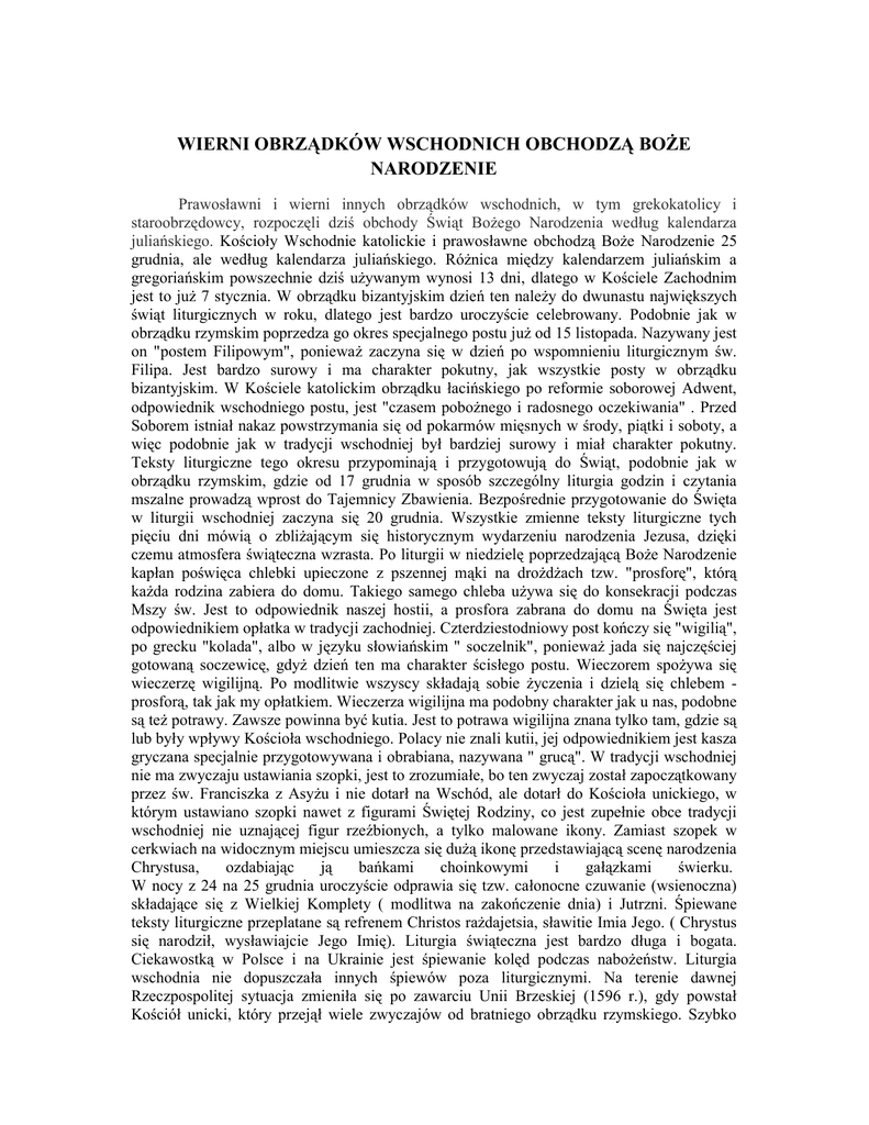 WIERNI OBRZĄDKÓW WSCHODNICH OBCHODZĄ BOśE NARODZENIE Prawosławni i wierni innych obrządków wschodnich, w tym grekokatolicy i staroobrzędowcy, rozpoczęli dziś obchody Świąt BoŜego Narodzenia według kalendarza juliańskiego. Kościoły Wschodnie katolickie i prawosławne obchodzą BoŜe Narodzenie 25 grudnia, ale według kalendarza juliańskiego. RóŜnica między kalendarzem juliańskim a gregoriańskim powszechnie dziś uŜywanym wynosi 13 dni, dlatego w Kościele Zachodnim jest to juŜ 7 stycznia. W obrządku bizantyjskim dzień ten naleŜy do dwunastu największych świąt liturgicznych w roku, dlatego jest bardzo uroczyście celebrowany. Podobnie jak w obrządku rzymskim poprzedza go okres specjalnego postu juŜ od 15 listopada. Nazywany jest on "postem Filipowym", poniewaŜ zaczyna się w dzień po wspomnieniu liturgicznym św. Filipa. Jest bardzo surowy i ma charakter pokutny, jak wszystkie posty w obrządku bizantyjskim. W Kościele katolickim obrządku łacińskiego po reformie soborowej Adwent, odpowiednik wschodniego postu, jest "czasem poboŜnego i radosnego oczekiwania" . Przed Soborem istniał nakaz powstrzymania się od pokarmów mięsnych w środy, piątki i soboty, a więc podobnie jak w tradycji wschodniej był bardziej surowy i miał charakter pokutny. Teksty liturgiczne tego okresu przypominają i przygotowują do Świąt, podobnie jak w obrządku rzymskim, gdzie od 17 grudnia w sposób szczególny liturgia godzin i czytania mszalne prowadzą wprost do Tajemnicy Zbawienia. Bezpośrednie przygotowanie do Święta w liturgii wschodniej zaczyna się 20 grudnia. Wszystkie zmienne teksty liturgiczne tych pięciu dni mówią o zbliŜającym się historycznym wydarzeniu narodzenia Jezusa, dzięki czemu atmosfera świąteczna wzrasta. Po liturgii w niedzielę poprzedzającą BoŜe Narodzenie kapłan poświęca chlebki upieczone z pszennej mąki na droŜdŜach tzw. "prosforę", którą kaŜda rodzina zabiera do domu. Takiego samego chleba uŜywa się do konsekracji podczas Mszy św. Jest to odpowiednik naszej hostii, a prosfora zabrana do domu na Święta jest odpowiednikiem opłatka w tradycji zachodniej. Czterdziestodniowy post kończy się "wigilią", po grecku "kolada", albo w języku słowiańskim " soczelnik", poniewaŜ jada się najczęściej gotowaną soczewicę, gdyŜ dzień ten ma charakter ścisłego postu. Wieczorem spoŜywa się wieczerzę wigilijną. Po modlitwie wszyscy składają sobie Ŝyczenia i dzielą się chlebem prosforą, tak jak my opłatkiem. Wieczerza wigilijna ma podobny charakter jak u nas, podobne są teŜ potrawy. Zawsze powinna być kutia. Jest to potrawa wigilijna znana tylko tam, gdzie są lub były wpływy Kościoła wschodniego. Polacy nie znali kutii, jej odpowiednikiem jest kasza gryczana specjalnie przygotowywana i obrabiana, nazywana " grucą". W tradycji wschodniej nie ma zwyczaju ustawiania szopki, jest to zrozumiałe, bo ten zwyczaj został zapoczątkowany przez św. Franciszka z AsyŜu i nie dotarł na Wschód, ale dotarł do Kościoła unickiego, w którym ustawiano szopki nawet z figurami Świętej Rodziny, co jest zupełnie obce tradycji wschodniej nie uznającej figur rzeźbionych, a tylko malowane ikony. Zamiast szopek w cerkwiach na widocznym miejscu umieszcza się duŜą ikonę przedstawiającą scenę narodzenia Chrystusa, ozdabiając ją bańkami choinkowymi i gałązkami świerku. W nocy z 24 na 25 grudnia uroczyście odprawia się tzw. całonocne czuwanie (wsienoczna) składające się z Wielkiej Komplety ( modlitwa na zakończenie dnia) i Jutrzni. Śpiewane teksty liturgiczne przeplatane są refrenem Christos raŜdajetsia, sławitie Imia Jego. ( Chrystus się narodził, wysławiajcie Jego Imię). Liturgia świąteczna jest bardzo długa i bogata. Ciekawostką w Polsce i na Ukrainie jest śpiewanie kolęd podczas naboŜeństw. Liturgia wschodnia nie dopuszczała innych śpiewów poza liturgicznymi. Na terenie dawnej Rzeczpospolitej sytuacja zmieniła się po zawarciu Unii Brzeskiej (1596 r.), gdy powstał Kościół unicki, który przejął wiele zwyczajów od bratniego obrządku rzymskiego. Szybko zaczęły powstawać róŜne pieśni religijne, w tym kolędy, które przeniknęły takŜe do prawosławia. Są to nieraz te same kolędy tylko w róŜnych językach. Uroczyste Nieszpory kończą pierwszy dzień świąt słowami: "CóŜ Ci ofiarujemy Chryste, za to, Ŝe jako człowiek przyszedłeś dla nas na ziemię? KaŜde z Twych stworzeń przynosi Ci dar wdzięczności: aniołowie - śpiew, firmament niebieski - gwiazdę, Mędrcy - podarki, pasterze - zdziwienie, ziemia - grotę, pustynia - Ŝłób, a my - Matkę Dziewicę. Przedwieczny BoŜe, zmiłuj się nad nami!". Drugi dzień Świąt obchodzony jest przez chrześcijan wschodnich jako święto maryjne, nazwane po grecku "synaksis" a w języku słowiańskim " Sobór Bogurodzicy", czyli świąteczne zgromadzenie się ludzi, by uczcić BoŜą Rodzicielkę i złoŜyć Jej gratulacje. Jest to nawiązanie do zwyczaju składania gratulacji matce przez krewnych i znajomych po urodzeniu dziecka. W tradycji zachodniej dzień ten jest poświęcony św. Szczepanowi Męczennikowi. W niedzielę po BoŜym Narodzeniu czci się św. Józefa jako opiekuna i przybranego ojca Jezusa. Nowy Rok cywilny nie ma Ŝadnych własnych tekstów liturgicznych, natomiast ten dzień obchodzony jest jako pamiątka nadania imienia Jezusowi. Od 2 stycznia zaczyna się przygotowanie do Objawienia Pańskiego. Teksty naboŜeństw mówią nam, Ŝe Chrystus zbliŜa się nad Jordan. W wigilię Objawienia Pańskiego obowiązuje ścisły post. W sam dzień 6 stycznia celebruje się chrzest Jezusa w Jordanie, pokłon oddany Jezusowi przez Trzech Mędrców i gody w Kanie Galilejskiej. Liturgia akcentuje najbardziej objawienie się Zbawiciela światu w wodach Jordanu. Najbardziej charakterystycznym elementem uroczystości 6 stycznia jest poświęcenie wody. Tego dnia po liturgii wyrusza z cerkwi procesja z