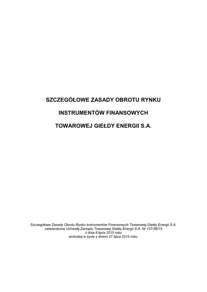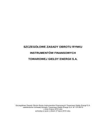 SZCZEGÓŁOWE ZASADY OBROTU RYNKU INSTRUMENTÓW FINANSOWYCH TOWAROWEJ GIEŁDY ENERGII S.A. Szczegółowe Zasady Obrotu Rynku Instrumentów Finansowych Towarowej Giełdy Energii S.A. zatwierdzone Uchwałą Zarządu Towarowej Giełdy Energii S.A. Nr 137/36/15 z dnia 8 lipca 2015 roku wchodzą w życie z dniem 27 lipca 2015 roku. Dział 1. POSTANOWIENIA OGÓLNE §1 Niniejsze Szczegółowe Zasady Obrotu Rynku Instrumentów Finansowych Towarowej Giełdy Energii S.A. („Szczegółowe Zasady Obrotu”) zostały zatwierdzone przez Zarząd Towarowej Giełdy Energii S.A. celem określenia szczegółowych zasad obrotu instrumentami finansowymi na Rynku Instrumentów Finansowych, zgodnie z § 15 Regulaminu obrotu Rynku Instrumentów Finansowych Towarowej Giełdy Energii S.A. („Regulamin RIF”). §2 Zarząd Towarowej Giełdy Energii S.A. ma prawo do zmiany niniejszych Szczegółowych Zasad Obrotu w całości lub w części, w każdym czasie, pod warunkiem zawiadomienia Członków Giełdy o treści tych zmian co najmniej na 2 tygodnie przed dniem ich wejścia w życie. §3 Do terminów użytych w niniejszych Szczegółowych Zasadach Obrotu stosuje się przepisy i definicje określone w Regulaminie RIF. Dział 2. SZCZEGÓŁOWE ZASADY DZIAŁANIA CZŁONKÓW GIEŁDY Rozdział 1. Wymagania w zakresie członkostwa oraz dopuszczenia do działania na Rynku Instrumentów Finansowych. §4 1. Zawarcie umowy o członkostwo następuje zgodnie z przepisami Regulaminu RIF, na wniosek zainteresowanego podmiotu, którego wzór stanowi Załącznik Nr 1 do niniejszych Szczegółowych Zasad Obrotu. 2. Złożenie przez podmiot zainteresowany uzyskaniem członkostwa na RIF wniosku, o którym mowa w ust. 1, traktowane jest jako złożenie oferty zawarcia umowy o członkostwo. 3. Zawarcie umowy o członkostwo następuje z momentem podjęcia przez Zarząd TGE uchwały o przyznaniu statusu Członka Giełdy. §5 1. Dopuszczenie Członka Giełdy do działania na RIF następuje zgodnie z przepisami Regulaminu RIF, na wniosek zainteresowanego podmiotu, którego wzór stanowi Załącznik Nr 2 do niniejszych Szczegółowych Zasad Obrotu. 2. Zarząd TGE dopuszcza wnioskodawcę do działania na RIF, jeżeli wnioskodawca: Strona 2 z 29 a) spełnia wymagania w zakresie rozliczania i rozrachunku transakcji zawieranych na RIF, określone w Regulaminie RIF lub przez Izbę Rozliczeniową, b) zobowiąże się do przestrzegania przepisów obowiązujących na RIF, c) upoważni co najmniej jedną osobę do reprezentowania go w transakcjach giełdowych, d) posiada podstawowe środki organizacyjno–techniczne wymagane do obsługi obrotu instrumentami finansowymi notowanymi na giełdzie, e) daje rękojmię należytego wykonywania obowiązków Członka Giełdy. §6 Udokumentowanie przez podmiot ubiegający się o dopuszczenie do działania na RIF możliwości prawidłowego rozliczania i rozrachunku transakcji giełdowych, odbywa się poprzez przekazanie Giełdzie: a) potwierdzenia Izby Rozliczeniowej o posiadaniu przez Członka Giełdy statusu uczestnika rozliczającego, lub b) potwierdzenia Izby Rozliczeniowej o powierzeniu rozliczenia i rozrachunku transakcji zawieranych przez ten podmiot uczestnikowi rozliczającemu. §7 Członek Giełdy jest zobowiązany do spełniania kryteriów organizacyjno-technicznych określonych w Szczegółowych warunkach dostępu do systemów informatycznych giełdy dla Rynku Instrumentów Finansowych TGE. Rozdział 2. Maklerzy giełdowi. §8 1. Osobą reprezentującą Członka Giełdy w transakcjach giełdowych jest makler giełdowy upoważniony do zawierania transakcji w imieniu Członka Giełdy. 2. Makler giełdowy powinien spełniać następujące warunki: a) być wpisanym na listę maklerów papierów wartościowych prowadzoną przez KNF, b) być zatrudnionym przez Członka Giełdy lub być członkiem jego władz, c) posiadać odpowiednie kwalifikacje i doświadczenie na poziomie zapewniającym przestrzeganie zasad uczciwego i bezpiecznego obrotu, d) odbyć szkolenie organizowane przez Giełdę z zakresu znajomości przepisów obowiązujących na RIF, w tym przepisów dotyczących zawierania transakcji i praktycznej obsługi systemów informatycznych, zakończone pomyślnym wynikiem egzaminu. 3. Warunek określony w ust. 2 lit. a) nie ma zastosowania dla maklerów giełdowych: Strona 3 z 29 a) wyznaczonych przez Członków Giełdy będących zagranicznymi firmami inwestycyjnymi, prowadzącymi działalność na giełdzie bez konieczności otwierania oddziału na terytorium Polski, lub b) wyznaczonych przez Członków Giełdy będących podmiotami nabywającymi lub zbywającymi instrumenty finansowe wyłącznie we własnym imieniu i na własny rachunek. 4. Makler giełdowy może reprezentować wyłącznie jednego Członka Giełdy. §9 1. Członek Giełdy ponosi całkowitą odpowiedzialność za działalność maklera giełdowego związaną z wykonywaniem jego obowiązków dotyczących obrotu giełdowego. 2. Makler giełdowy odpowiedzialny jest w szczególności za przekazywanie na giełdę zleceń zgodnie z regulacjami obowiązującymi na RIF. Przez przekazanie zlecenia rozumie się w szczególności jego weryfikację i autoryzację zgodnie z regulacjami Członka Giełdy, w sposób umożliwiający Członkowi Giełdy przyporządkowanie zlecenia do danej osoby reprezentującej Członka Giełdy w transakcjach giełdowych. § 10 Członek Giełdy zobowiązany jest do stworzenia i realizacji procedur dotyczących przekazywania zleceń na giełdę. Procedury powinny obejmować w szczególności: a) tryb przyznawania uprawnień maklerom giełdowym, w tym zasady dokonywania weryfikacji ich kwalifikacji i doświadczenia, b) zasady przekazywania zleceń na giełdę, c) zasady filtrowania zleceń obejmujące ustalanie limitów dotyczących wprowadzanych zleceń oraz zasady wprowadzania limitów, d) zasady dostępu do systemów informatycznych giełdy. § 11 1. Członek Giełdy zobowiązany jest stosować następujące kryt