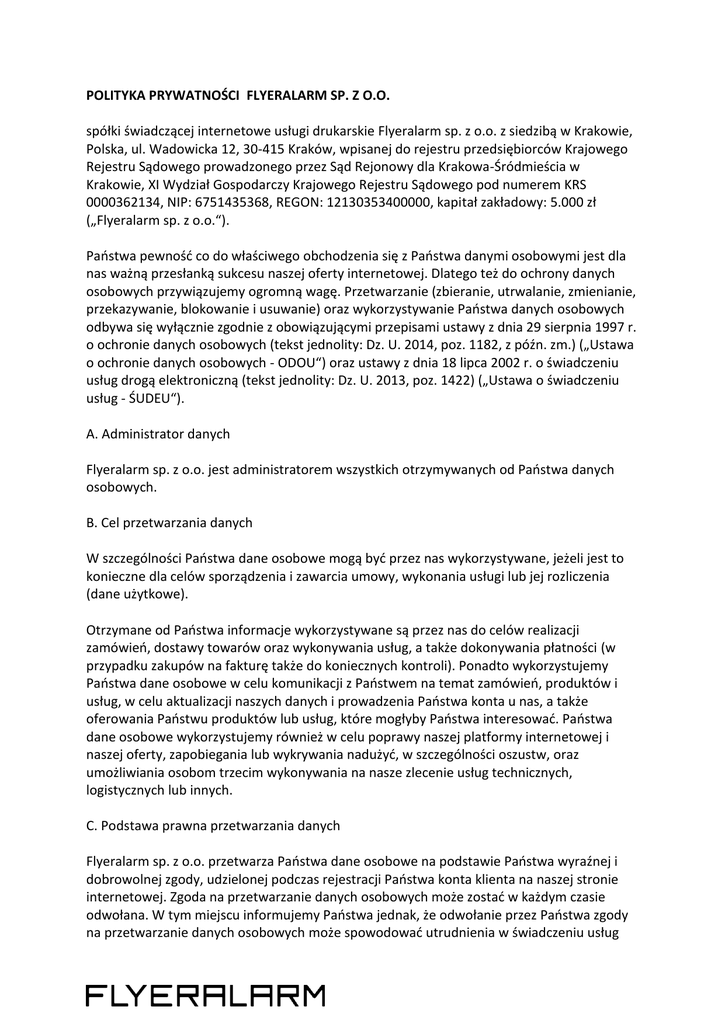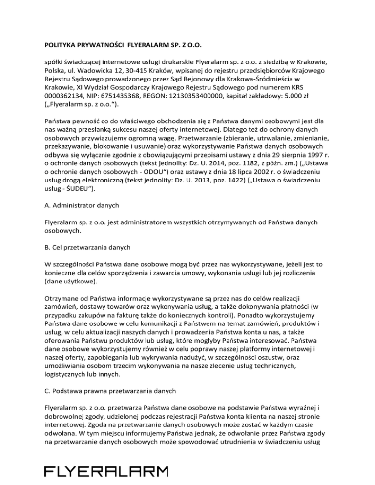 POLITYKA PRYWATNOŚCI FLYERALARM SP. Z O.O. spółki świadczącej internetowe usługi drukarskie Flyeralarm sp. z o.o. z siedzibą w Krakowie, Polska, ul. Wadowicka 12, 30-415 Kraków, wpisanej do rejestru przedsiębiorców Krajowego Rejestru Sądowego prowadzonego przez Sąd Rejonowy dla Krakowa-Śródmieścia w Krakowie, XI Wydział Gospodarczy Krajowego Rejestru Sądowego pod numerem KRS 0000362134, NIP: 6751435368, REGON: 12130353400000, kapitał zakładowy: 5.000 zł („Flyeralarm sp. z o.o.“). Państwa pewność co do właściwego obchodzenia się z Państwa danymi osobowymi jest dla nas ważną przesłanką sukcesu naszej oferty internetowej. Dlatego też do ochrony danych osobowych przywiązujemy ogromną wagę. Przetwarzanie (zbieranie, utrwalanie, zmienianie, przekazywanie, blokowanie i usuwanie) oraz wykorzystywanie Państwa danych osobowych odbywa się wyłącznie zgodnie z obowiązującymi przepisami ustawy z dnia 29 sierpnia 1997 r. o ochronie danych osobowych (tekst jednolity: Dz. U. 2014, poz. 1182, z późn. zm.) („Ustawa o ochronie danych osobowych - ODOU“) oraz ustawy z dnia 18 lipca 2002 r. o świadczeniu usług drogą elektroniczną (tekst jednolity: Dz. U. 2013, poz. 1422) („Ustawa o świadczeniu usług - ŚUDEU“). A. Administrator danych Flyeralarm sp. z o.o. jest administratorem wszystkich otrzymywanych od Państwa danych osobowych. B. Cel przetwarzania danych W szczególności Państwa dane osobowe mogą być przez nas wykorzystywane, jeżeli jest to konieczne dla celów sporządzenia i zawarcia umowy, wykonania usługi lub jej rozliczenia (dane użytkowe). Otrzymane od Państwa informacje wykorzystywane są przez nas do celów realizacji zamówień, dostawy towarów oraz wykonywania usług, a także dokonywania płatności (w przypadku zakupów na fakturę także do koniecznych kontroli). Ponadto wykorzystujemy Państwa dane osobowe w celu komunikacji z Państwem na temat zamówień, produktów i usług, w celu aktualizacji naszych danych i prowadzenia Państwa konta u nas, a także oferowania Państwu produktów lub usług, które mogłyby Państwa interesować. Państwa dane osobowe wykorzystujemy również w celu poprawy naszej platformy internetowej i naszej oferty, zapobiegania lub wykrywania nadużyć, w szczególności oszustw, oraz umożliwiania osobom trzecim wykonywania na nasze zlecenie usług technicznych, logistycznych lub innych. C. Podstawa prawna przetwarzania danych Flyeralarm sp. z o.o. przetwarza Państwa dane osobowe na podstawie Państwa wyraźnej i dobrowolnej zgody, udzielonej podczas rejestracji Państwa konta klienta na naszej stronie internetowej. Zgoda na przetwarzanie danych osobowych może zostać w każdym czasie odwołana. W tym miejscu informujemy Państwa jednak, że odwołanie przez Państwa zgody na przetwarzanie danych osobowych może spowodować utrudnienia w świadczeniu usług przez Flyeralarm sp. z o.o. Ponadto Flyeralarm sp. z o.o. przetwarza Państwa dane osobowe w sytuacji, gdy jest to konieczne dla celów wykonania umowy lub wypełnienia prawnie usprawiedliwionych celów zgodnie z ODOU. D. Rodzaje danych Dane osobowe stanowią informacje umożliwiające identyfikację danej osoby. 1) Konto klienta Przy rejestracji konta klienta należy podać następujące dane osobowe, które będą przetwarzane przez Flyeralarm sp. z o.o.: tytuł (Pan lub Pani) nazwa firmy imię i nazwisko ulica oraz numer domu kod pocztowy miasto kraj (przydzielony z góry) numer telefonu adres e-mail i powtórzenie adresu e-mail hasło i powtórzenie hasła Rodzaje danych, których podanie przy rejestracji klienta jest obowiązkowe, oznaczone są gwiazdką. 2) Odwiedziny na naszej stronie internetowej Podczas Państwa odwiedzin na naszej stronie internetowej zapisujemy na okres 7 dni roboczych nazwę domeny wzgl. adres IP, z którego odebrano żądanie, pobierano przez użytkownika pliki (nazwa pliku i URL), kod odpowiedzi http, stronę odsyłającą Państwo do nas oraz datę i czas Państwa odwiedzin. Zapisane dane służą do identyfikacji zakłóceń lub nadużyć naszej oferty internetowej i naszych usług/urządzeń telekomunikacyjnych, o ile jest to konieczne do ustanawiania kolejnych połączeń i/lub do celów rozliczeniowych. Nie wykorzystujemy powyższych danych do tworzenia osobistego profilu użytkownika, jeżeli nie udzielili Państwo na to wyraźnej zgody bądź o ile brak odmiennych regulacji w tym zakresie w dalszej części niniejszej polityki prywatności. W przypadku zakłóceń lub nadużyć zastrzegamy sobie prawo ich zgłaszania organom ścigania. Wykorzystywanie lub przekazywanie osobom trzecim danych użytkowników, wykraczające poza wyżej wymieniony zakres, nie ma miejsca. Userlike: Na tej stronie internetowej dostępne jest oprogramowanie do prowadzenia czatu na żywo w technologii Userlike UG (www.userlike.com). Userlike używa plików cookie, które są zapisywane na komputerze użytkownika i które umożliwiają rozmowę w formie czatu w czasie rzeczywistym na stronie internetowej. Jeśli zdecydowałeś się korzystać z Userlike, przebieg rozmowy wraz z historią odwiedzanych stron będzie przez Userlike gromadzony, przetwarzany i zapisywany na serwerach w Niemczech. Ponadto zapisywane będą informacje dotyczące lokalizacji na podstawie adresu IP użytkownika. Powiązanie zgromadzonych danych z ewentualnymi danymi rejestracji ma miejsce tylko wtedy, gdy będą one udostępnione dobrowolnie przez użytkownika np. w ramach komunikacji na czacie na żywo. To samo tyczy się danych osobowych użytkownika. Szczegółowe informacje dotyczące przetwarzania danych użytkownika przez Userlike, a także jego praw i możliwości ustawień dotyczących ochrony danych osobowych znajdują się w Polityce Prywatności Userlike (www.userlike.com/en/privacy_policy/) E. Aplikacje mobilne/cookies/podobne technologie 1) Aplikacje mobilne Jeżeli pobierają Państwo od nas lub od firm z nami powiązanych aplikacje (np. ap