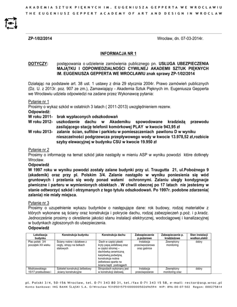 ZP-1/02/2014 Wrocław, dn. 07-03-2014r. INFORMACJA NR 1 DOTYCZY: postępowania o udzielenie zamówienia publicznego pn. USŁUGA UBEZPIECZENIA MAJĄTKU I ODPOWIEDZIALNOŚCI CYWILNEJ AKADEMII SZTUK PIĘKNYCH IM. EUGENIUSZA GEPPERTA WE WROCŁAWIU znak sprawy ZP-1/02/2014 Działając na podstawie art. 38 ust. 1 ustawy z dnia 29 stycznia 2004r. Prawo zamówień publicznych (Dz. U. z 2013r. poz. 907 ze zm.), Zamawiający - Akademia Sztuk Pięknych im. Eugeniusza Gepperta we Wrocławiu udziela odpowiedzi na zadane przez Wykonawcę pytania: Pytanie nr 1 Prosimy o wykaz szkód w ostatnich 3 latach ( 2011-2013) uwzględnieniem rezerw. Odpowiedź: W roku 2011- brak wypłaconych odszkodowań W roku 2012- uszkodzenie dachu w Akademiku spowodowane kradzieżą przewodu zasilającego stację telefonii komórkowej PLAY w kwocie 943,95 zł W roku 2013- zalanie ścian, sufitów i parkietu w pomieszczeniach pawilonu D w wyniku nieszczelności podgrzewcza przepływowego wody w kwocie 13.978,52 zł,rozbicie szyby elewacyjnej w budynku CSU w kwocie 19.950 zł Pytanie nr 2 Prosimy o informację na temat szkód jakie nastąpiły w mieniu ASP w wyniku powodzi które dotknęły Wrocław. Odpowiedź W 1997 roku w wyniku powodzi zostały zalane budynki przy ul. Traugutta 21, ul.Pobożnego 9 (akademik) oraz przy pl. Polskim 3/4. Zalanie nastąpiło w wyniku poniesienia się wód gruntowych i przelania się wody ponad wałami ochronnymi. Zalaniu uległy kondygnacje piwniczne i parteru w wymienionych obiektach . W chwili obecnej po 17 latach nie jesteśmy w stanie odtworzyć szkód i otrzymanych z tego tytułu odszkodowań. Po 1997r. podobne zdarzenia( zalania) nie miały miejsca. Pytanie nr 3 Prosimy o uzupełnienie wykazu budynków o następujące dane: rok budowy, rodzaj materiałów z których wykonane są ściany oraz konstrukcja i pokrycie dachu, rodzaj zabezpieczeń p.poż. i p.kradz. Jednocześnie prosimy o określenie jakości stanu instalacji elektrycznej, wodociągowej i kanalizacyjnej w budynkach zgłoszonych do ubezpieczenia. Odpowiedź Lokalizacja budynku Plac polski 3/4 początek XX wieku Modrzewskiego 15/17 przebudowa i Konstrukcja budynku Ściany nośne i działowe z cegły, stropy na belkach stalowych Szkielet konstrukcji żelbetowy ,ściany konstrukcyjne Konstrukcja dachu Dach w części płaski kryty papą asfaltową oraz w części stromej – dachówką ceramiczną karpiówką podwójną konstrukcja nośna żelbetowa oparta na ściana bądź podciągach Stropodach wykonany jest w konstrukcji stalowej, Zabezpieczenie p.pożarowe Instalacja przeciwpożarowa oraz gaśnice Zabezpieczenie p. kradzieżowe Zewnętrzny monitoring Stan instalacji wodkan,elektr dobry Instalacja przeciwpożarze Zewnętrzny monitoring oraz dobry modernizacja 2001 zewnętrzne ceglane. stropy monolityczne żelbetowe ,posadowienia na ławach żelbetonowych Traugutta 19/21 ob. A Początek XX Ściany nośne i działowe z cegły; stropy na belkach drewnianych, klatka schodowa o konstrukcji stalowej Ściany nośne i działowe z cegły; stropy na belkach stalowych, klatka schodowa monolityczna Ściany nośne i działowe z cegły; stropy na belkach stalowych, klatka schodowa monolityczna Ściany nośne i działowe z cegły; stropy wylewane betonowe, klatka schodowa monolityczna Traugutta 19/21 ob. B Początek XX Traugutta 19/21 ob. C początek XX wieku Traugutta 19/21 ob. D wybudowany w latach pięćdziesiątych XX wieku Traugutta 19/21bud. CSU.CI oddany do użytkowania w 2013r Pobożnego 9, Początek XX Luboradów Ob. A wybudowany w latach pięćdziesiątych XX wieku ocieplony wełną mineralną i od wewnątrz wyłożony płytami gipswokartonowymi. Pokrycie stanowi blach miedziana na deskach i łatach drewnianych Dach płaski kryty papą asfaltową o konstrukcji nośnej drewnianej oraz gaśnice system instalacji przeciwwłamaniowej Gaśnice przenośne Zewnętrzny monitoring zadawalający Dach płaski kryty papą asfaltową o konstrukcji nośnej drewnianej Gaśnice przenośne Zewnętrzny monitoring zadawalający Dach płaski kryty papą asfaltową o konstrukcji nośnej drewnianej Gaśnice przenośne Brak zadawalający Dach płaski kryty papą asfaltową o konstrukcji nośnej drewnianej Gaśnice przenośne brak zadawalający Konstrukcja stalowa szkieletowa, stropy monolityczne żelbetowe. ściany zewnętrzne-elewacje szklane, ścianki działowe ceglane, klatki schodowe betonowe Ściany nośne i działowe z cegły; stropy na belkach stalowych dach betonowy kryty papą kompletne zabezpieczenie przeciwpożarowe jest zewnętrzny i wewnętrzny monitoring oraz system instalacji przeciwkradzieżowej b. dobry Stropodach wentylowany ; konstrukcja nośna z belek stalowych; pokrycie papa asfaltowa Instalacja przeciwpożarom ,gaśnice dobry Ściany nośne i działowe z cegły; stropy na belkach drewnianych Dach drewniany dwuspadowy kryty blachą stalową trapezową ocieplony wełną mineralną; od wewnątrz płyta gipsowo-katrtonowa gaśnice jest zewnętrzny i wewnętrzny monitoring oraz system instalacji przeciwkradzieżowej brak zadawalający Pytanie nr 4 Prosimy o wykaz dokonanych remontów w budynkach, których wiek przekracza 50 lat. Odpowiedź Lokalizacja budynku Plac Polski 3/4 Traugutta 19/21 ob. A Traugutta 19/21 ob. B Traugutta 19/21 ob. C Traugutta 19/21 ob. D Pobożnego 9 Luboradów Ob. A Wykaz przeprowadzonych remontów Przebudowa I i II piętra od strony ul. Modrzewskiego . Remont wszystkich toalet męskich i damskich .Przebudowa holu wejściowego wraz z portiernią . Wymiana stolarki okiennej i drzwiowej w całym budynku. Przebudowa elewacji od strony ul. Modrzewskiego, pl. Polskiego oraz od strony dziedzińca. Sukcesywna wymiana instalacji elektrycznych w ramach przeprowadzanych doraźnych remontów .Przebudowa auli i serwerowni. Dobudowa dźwigu zewnętrznego od strony dziedzińca. Sukcesywne i doraźne roboty malarskie w pomieszczeniach dydaktycznych i administracyjnych Remont toalet męskich i damskich. Dobudowa dźwigu od stron