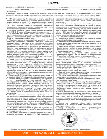 UMOWA zawarta w dniu 2012-02-28 pomiędzy: ___________________________, z siedzibą: _______________, ______________, NIP: _________, którą reprezentuje ________________, (osoba wyjeżdżająca na kurs: ____________) – zwany w dalszej części „Uczestnikiem”), a Katarzyną Onyśk-Lisowską i Sławomirem Lisowskim, wspólnikami T&T S.C. z siedzibą w: ul. Paderewskiego 3/11, 04-450 Warszawa, NIP: 952-18-73-043, reprezentowaną przez Sławomira Lisowskiego – wspólnika, zwaną w dalszej części umowy „T&T”. 1. T&T zobowiązuje się do rezerwacji w imieniu Uczestnika miejsca na kursie językowym w wybranej szkole językowej za granicą będącej w ofercie T&T, wykupienia wszelkich innych świadczeń zamówionych przez Uczestnika i dostępnych w ofercie T&T oraz uzyskania wszelkich niezbędnych dokumentów dotyczących wyjazdu i uczestnictwo w kursie (oprócz wizy, o którą Uczestnik winien wystąpić we własnym zakresie). 2. Formularz zgłoszenia i oferta cenowa przesłana e-mailem w dniu 2012-02-28 stanowią integralną część niniejszej umowy. 3. W przypadku braku miejsc na wybranym przez Uczestnika kursie T&T przedstawi Uczestnikowi nową ofertę. W razie jej nie przyjęcia Uczestnik otrzyma pełen zwrot kosztów wniesionych na rzecz T&T i szkoły językowej za granicą. 4. Warunkiem dokonania rezerwacji jest przesłanie do T&T prawidłowo wypełnionego formularza zgłoszenia, podpisanie niniejszej umowy i dokonanie wpłaty należności w wysokości 100% należności za: kurs, zakwaterowanie i świadczenia dodatkowe oraz pełnej opłaty za bilet lotniczy /lub autokarowy /lub kolejowy oraz ubezpieczenie (jeśli te świadczenia zostaną zamówione). Druga część należności winna być zapłacona najpóźniej na trzy tygodnie przed datą wyjazdu na kurs (pod rygorem odwołania rezerwacji i utraty wpłaconych kwot). Inne terminy płatności winny być uzgadniane pisemnie z T&T. W przypadku zgłoszeń dokonywanych później niż trzy tygodnie przed wyjazdem terminy wpłat będą ustalane z T&T. 5. Wpłaty za kurs i inne świadczenia mogą być dokonane w złotówkach i/lub w walucie obcej (obowiązującej w kraju wyjazdu) na konto wskazane przez T&T. Wstępny kosztorys zostanie sporządzony w dniu otrzymania kompletnych dokumentów zgłoszeniowych. Z chwilą dokonania ostatniej wpłaty pracownik T&T przygotuje szczegółowy kosztorys wyjazdu wg kursu danej waluty (kurs sprzedaży dewiz – rozliczenia z klientami) ogłaszanego przez PKO BP S.A. w dniu dokonania ostatniej wpłaty. Wszelkie nadpłaty lub niedopłaty zostaną rozliczone przed uzgodnioną datą wyjazdu na kurs. 6. Uczestnik / osoba reprezentująca Uczestnika wyraża zgodę na wystawienie faktur VAT dotyczących wyjazdu bez jego/jej podpisu. 7. Wszelkie zmiany związane z wyjazdem winny być uzgadniane z T&T i przedstawiane w formie pisemnej pod rygorem nieuwzględnienia ich przez T&T. W przypadku zmiany przez Uczestnika terminu wyjazdu, środka transportu, szkoły itp., po dokonaniu stosownych rezerwacji i wykupieniu biletu na przejazd, ewentualne koszty naliczone z tego tytułu przez szkołę lub przewoźnika obciążają Uczestnika. Za zmiany, które skutkują naliczeniem przez szkołę lub przewoźnika dodatkowych opłat, T&T pobiera opłaty w wysokości naliczonej przez szkołę lub przewoźnika. 8. Wszelkie niezbędne dokumenty rejestracyjne a w szczególności potwierdzenie rejestracji na kursie, adres i warunki zakwaterowania oraz bilet na przejazd i polisa ubezpieczeniowa (jeśli świadczenia te zostaną zamówione) zostaną przekazane Uczestnikowi najpóźniej na 7 dni przed uzgodnioną datą wyjazdu na kurs. Jeśli po dostarczeniu dokumentów nastąpią jakiekolwiek zmiany w organizacji kursu i/lub przejazdu Uczestnik zostanie o nich niezwłocznie powiadomiony. 9. T&T ponosi odpowiedzialność z tytułu nie wykonania lub nienależytego wykonania z winy umyślnej warunków określonych w niniejszej umowie. 10. W przypadku nie wywiązania się szkoły językowej za granicą z warunków określonych w ofercie T&T, T&T zobowiązuje się niezwłocznie interweniować po zgłoszeniu nieprawidłowości przez Uczestnika. Zostaną wzięte pod uwagę jedynie uzasadnione zastrzeżenia. 11. Uczestnik kursu zobowiązany jest do przestrzegania prawa oraz norm zachowania obowiązujących w szkole i miejscu zakwaterowania. W przypadku ich naruszenia Uczestnik może być usunięty z danej szkoły i odesłany (na jego koszt) do Polski. W takim przypadku nie przysługuje zwrot za niewykorzystany okres pobytu i bilet powrotny. Uczestnik ponosi odpowiedzialność prawną i materialną za wszelkie szkody spowodowane przez siebie w czasie podróży i pobytu na kursie. 12. T&T nie ponosi odpowiedzialności za: a) opóźnienia w podróży, uszkodzenie lub zagubienie bagażu (odpowiedzialność ponosi przewoźnik), b) zagubienie przez Uczestnika dokumentów, pieniędzy, biletu i rzeczy wartościowych (zalecane jest przechowywanie ich w szkole lub u rodziny), c) nieszczęśliwe wypadki zaistniałe w czasie trwania kursu i koszty leczenia poniesione przez Uczestnika (na życzenie Uczestnika T&T wykupi w jego imieniu ubezpieczenie WARTA Travel – na czas podróży i pobytu), d) nie wyrażenie zgody przez władze graniczne na przekroczenie granicy (np. w związku z pozostawaniem Uczestnika w konflikcie z prawem lub z innego powodu), e) inne skutki spowodowane działaniem siły wyższej (np. powódź, huragan itp.). 13. W przypadku konieczności rezygnacji z kursu przez Uczestnika (przed rozpoczęciem kursu i po dokonaniu stosownych rezerwacji), Uczestnik ponosi następujące koszty rezygnacji: a) do 50 dni przed rozpoczęciem kursu – opłaty wpisowe / rejestracyjne na rzecz szkoły + 400 PLN, b) od 49 do 28 dnia przed rozpoczęciem kursu – opłaty wpisowe / rejestracyjne na rzecz szkoły + 800 PLN, c) od 27 do 18 dnia przed rozpoczęciem kursu – opłaty wpisowe / rejestracyjne na rzecz szkoły + 2 500 PLN, d) od 17 do 6 d