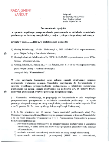 RADA GMINY ŁAŃCUT Załącznik d o uchwały N r K / 6 0 / 1 5 R a d y G m i n y Łańcut z dnia 7 lipca 2015 r. Porozumienie (projekt) w s p r a w i e wspólnego p r z e p r o w a d z e n i a postępowania o u d z i e l e n i e zamówienia p u b l i c z n e g o n a dostawę e n e r g i i e l e k t r y c z n e j w t r y b i e p r z e t a r g u n i e o g r a n i c z o n e g o zawarte w dniu 2015 r . w Białobrzegach pomiędzy : 1) Gminą Białobrzegi, 3 7 - 1 1 4 Białobrzegi 4 , N I P 8 1 5 - 1 6 - 3 2 - 8 3 1 reprezentowaną p r z e z Wójta G m i n y - F r a n c i s z k a Masłonia, 2 ) Gminą Łańcut, u l . M i c k i e w i c z a 2 a , N I P 8 1 5 - 1 6 - 3 2 - 2 2 2 reprezentowaną p r z e z Wójta G m i n y - Z b i g n i e w a Łozę, 3 ) Gminą Żołynia, u l . R y n e k 2 2 , 3 7 - 1 1 0 Żołynia, N I P 8 1 5 - 1 6 - 3 3 - 4 9 2 reprezentowaną p r z e z Wójta G m i n y - A n d r z e j a B e n e d y k a , z w a n y m i dalej " U c z e s t n i k a m i " . W celu uzyskania korzystnej ceny z a k u p u energii elektrycznej poprzez zwiększenie w o l u m e n u z a k u p u , U c z e s t n i c y przystępują d o P o r o z u m i e n i a w s p r a w i e wspólnego p r z e p r o w a d z e n i a postępowania o u d z i e l e n i e zamówienia p u b l i c z n e g o n a z a k u p e n e r g i i e l e k t r y c z n e j n a p o d s t a w i e a r t . 16 u s t a w y P r a w o zamówień p u b l i c z n y c h w t r y b i e p r z e t a r g u n i e o g r a n i c z o n e g o . § 1 . U c z e s t n i c y oświadczają, że przystępują d o P o r o z u m i e n i a w c e l u wspólnego p r z e p r o w a d z e n i a postępowania o u d z i e l e n i e zamówienia p u b l i c z n e g o w trybie przetargu nieograniczonego n a zakup energii elektrycznej n a okres o d 01 stycznia 2016 r. d o 3 1 g r u d n i a 2 0 1 7 r . , tworząc Grupę Zakupową E n e r g i i E l e k t r y c z n e j . § 2 . 1 . N a p o d s t a w i e a r t . 1 6 u s t a w y P r a w o zamówień p u b l i c z n y c h , d a l e j P z p , U c z e s t n i c y wyznaczają Gminę Białobrzegi d o p r z e p r o w a d z e n i a w i m i e n i u Uczestników i n a i c h r z e c z czynności w y m i e n i o n y c h w § 1 P o r o z u m i e n i a . Czynności t e polegać będą w szczególności n a : 1) powołaniu k o m i s j i p r z e t a r g o w e j d o p r z e p r o w a d z e n i a postępowania o u d z i e l e n i e zamówienia, w skład której m a p r a w o wejść p o j e d n y m p r z e d s t a w i c i e l u każdego z Uczestników, 2 ) u s t a l e n i u wartości s z a c u n k o w e j zamówienia n a z a k u p e n e r g i i e l e k t r y c z n e j , 3) opracowaniu dokumentacji p r z e t a r g o w e j ( S I W Z w r a z z załącznikami, 4) 5) 6) 7) ogłoszenia o zamówieniu, ogłoszenia o w y b o r z e n a j k o r z y s t n i e j s z e j o f e r t y , protokół z postępowania, ogłoszenie o u d z i e l e n i u zamówienia), o p r a c o w a n i u wyjaśnień n a z a p y t a n i a oferentów d o treści S I W Z , o c e n i e spełnienia p r z e z oferentów warunków udziału w postępowaniu o r a z b a d a n i u i o c e n i e złożonych o f e r t , wyborze najkorzystniejszej oferty, przechowywaniu i zabezpieczeniu dokumentacji przetargowej . 2 . U c z e s t n i c y udzielą G m i n i e Białobrzegi odrębnego pełnomocnictwa d o czynności, o których m o w a w u s t . 1 z p r a w e m d o u d z i e l a n i a d a l s z y c h pełnomocnictw. 3 . G m i n a Białobrzegi o p r a c u j e Harmonogram prac zmierzających d o p r z y g o t o w a n i a postępowania o u d z i e l e n i e wspólnego zamówienia n a z a k u p e n e r g i i elektrycznej. § 3 . G m i n a Białobrzegi d o k o n a w y b o r u p o d m i o t u , z z a c h o w a n i e m obowiązującej w G m i n i e p r o c e d u r y u d z i e l a n i a zamówień p u b l i c z n y c h d o wartości 3 0 t y s . e u r o . , d o p r z e p r o w a d z e n i a czynności o których m o w a w § 1 i § 2 P o r o z u m i e n i a , z w a n e g o d a l e j " R e a l i z a t o r e m ". §4. 1 . U c z e s t n i c y dostarczą R e a l i z a t o r o w i niezbędne i n f o r m a c j e , d o k u m e n t y , szczegółowe w y k a z y dotyczące p r z e d m i o t u zamówienia, stanowiące podstawę d o oszacowania wartości s z a c u n k o w e j p r z e d m i o t u zamówienia i sporządzenia dokumentacji przetargowej. 2 . Z m i a n y w z a k r e s i e p r z e d m i o t u zamówienia, o którym m o w a w u s t . 1 mogą być zgłaszane p r z e z U c z e s t n i k a w t e r m i n i e n i e późniejszym niż 3 0 d n i o d p l a n o w a n e g o t e r m i n u p r z e k a z a n i a ogłoszenia o zamówieniu d o p u b l i k a c j i . 3. O odstąpieniu o d u c z e s t n i c z e n i a w e wspólnym zamówieniu U c z e s t n i k zobowiązany j e s t poinformować p i s e m n i e pozostałych zamawiających - Uczestników w t e r m i n i e n i e późniejszym niż 3 0 d n i o d p l a n o w a n e g o t e r m i n u p r z e k a z a n i a ogłoszenia o zamówieniu do publikacji. 4 . W p r z y p a d k u wystąpienia okoliczności, o których m o w a w u s t . 3 U c z e s t n i k zobowiązany będzie d o p o k r y c i a e w e n t u a l n y c h kosztów związanych z p o n o w n y m opracowaniem i przygotowaniem dokumentacji przetargowej. § 5 . W a r u n k i e m uwzględnienia U c z e s t n i k a w postępowaniu p r z e t a r g o w y m j e s t p r z e k a z a n i e d o G m i n y Białobrzegi nieodwołalnego oświadczenia o z a b e z p i e c z e n i u środków f i n a n s o w y c h n a realizację z a d a n i a w z a k r e s i e , w j a k i m z a k u p e n e r g i i elektrycznej dotyczy danego Uczestnika oraz jednostek przez niego reprezentowanych . § 6 . T e r m i n wszczęcia p r o c e d u r y w y b o r u w y k o n a w c y u s t a l o n y z o s t a n i e s k o m p l e t o w a n i u dokumentów niezbędnych d o o s z a c o w a n i a wartości zamówienia. po § 7 . 1 . W w y n i k u p r z e p r o w a d z o n e g o 