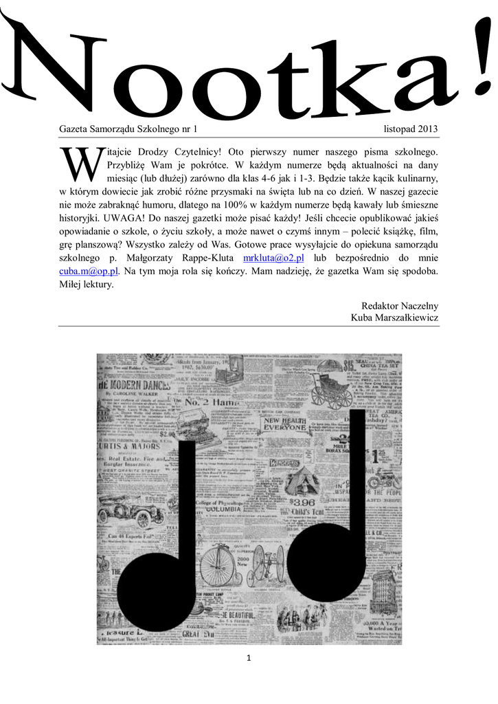 Gazeta Samorządu Szkolnego nr 1 listopad 2013 W itajcie Drodzy Czytelnicy! Oto pierwszy numer naszego pisma szkolnego. Przybliżę Wam je pokrótce. W każdym numerze będą aktualności na dany miesiąc (lub dłużej) zarówno dla klas 4-6 jak i 1-3. Będzie także kącik kulinarny, w którym dowiecie jak zrobić różne przysmaki na święta lub na co dzień. W naszej gazecie nie może zabraknąć humoru, dlatego na 100% w każdym numerze będą kawały lub śmieszne historyjki. UWAGA! Do naszej gazetki może pisać każdy! Jeśli chcecie opublikować jakieś opowiadanie o szkole, o życiu szkoły, a może nawet o czymś innym – polecić książkę, film, grę planszową? Wszystko zależy od Was. Gotowe prace wysyłajcie do opiekuna samorządu szkolnego p. Małgorzaty Rappe-Kluta [email protected] lub bezpośrednio do mnie [email protected]. Na tym moja rola się kończy. Mam nadzieję, że gazetka Wam się spodoba. Miłej lektury. Redaktor Naczelny Kuba Marszałkiewicz 1 W TYM NUMERZE: s. 2 – aktualności s. 2 – kącik kulinarny s. 3 – humor na miesiąc s. 4 – zbiórka darów dla schroniska AKTUALNOŚCI: 4.12.2013 – kl. I – III będą miały spotkanie z p. Marią Strzałkowską – poznańską poetką piszącą wierszyki łamiące języki. 28.11.2013 – kl. IV – VI , godz. 17-20 mają dyskotekę andrzejkową. DO ODWOŁANIA – zbiórka koców i karmy dla psów i kotów ze schroniska. Dary przynosimy do przedstawicieli samorządu klasowego (więcej informacji s.4). KĄCIK KULINARNY: „andrzejkowy rarytas” Zapewne każdy z was umie coś upichcić w kuchni. Ja jestem wręcz uzależniona od pieczenia ciasteczek, babeczek. ciast lub tortów. Ci którzy mnie znają dobrze o tym wiedzą. ;) Dzisiaj, z powodu zbliżających się Andrzejek chcę wam pokazać przepis na ciasteczka z wróżbą. Składniki : 270 g mąki ok. 90 g cukru pudru 1 łyżka cukru z wanilią 3 jajka 1 łyżka oleju 1 łyżka wody troszkę cukru pudru Przepis : Czas: ok. 30 minut Ilość porcji: ok. 50 szt. ciasteczek Przygotowanie : Z podanych składników zagniatam ciasto, w razie potrzeby dodaję troszkę mąki lub wody. Ciasto wałkuję dość cienko (polecam podzielić na dwie części bo ciasta jest sporo). Wycinam szklanką kółka. Na każdym kółku kładę zrolowana karteczkę z wróżbą i zlepiam jak pieroga oraz formuję rogalik. Układam na blaszce do pieczenia wyłożonej papierem i wstawiam do nagrzanego do 180°C piekarnika na ok. 15-20 minut. Mniejszym rożkom wystarczy 15, większym, grubszym 20 minut, poznacie po tym, że zaczynają się rumienić. Po wystudzeniu lekko posypuję cukrem pudrem. Smacznego. Oktawia Firlej 6a :) 2 HUMOR NA MIESIĄC Ląduje polski samolot na lotnisku w Chicago. Pilotom cudem udaje się uniknąć katastrofy i tylko ich nadzwyczajne umiejętności oraz znakomity system hamulcowy Boeinga pozwoliły na zatrzymanie samolotu przed krańcem pasa startowego... - To jest chyba najkrótszy pas startowy ze wszystkich pasów jakie w życiu widziałem - mówi pierwszy pilot. - Nooo... - odpowiada drugi - ale za to jaki szeroki... będzie z dziesięć kilometrów. Blondynka wraca roztrzęsiona do domu i mówi do swojego chłopaka: - W ogóle nie da się jeździć po tym mieście! Skręcam w lewo - drzewo, zawracam drzewo, wszędzie drzewo. Naciskam hamulec, próbuję cofnąć, odwracam się drzewo... - Spokojnie kochanie, to tylko choinka zapachowa. Żył sobie kiedyś chłopiec, który uwielbiał czytać. Czytał wszystko, co mógł dostać w swoje ręce, uwielbiał chodzić do swojej ulubionej księgarni. Pewnego dnia, chłopiec uświadomił sobie, że przeczytał wszystko, co sklep ma do zaoferowania. Podszedł do właściciela i spytał, czy może kupić jakąś książkę, której nie zna. Właściciel powiedział, że tak. Sięgnął po książkę. Sprzedał ją ucieszonemu chłopcu po obniżonej cenie 50 zł. Ostrzegł go jednak, alby nigdy nie spoglądał na tylną okładkę książki. Cóż, chłopak wrócił do domu i zadowolony zaczął czytać powieść. Zawsze jednak zastanawiał się, co znajduje się z tyłu książki. Pewnego dnia pokusa była zbyt silna. Chłopiec spojrzał na tylną okładkę nowej pozycji i po chwili upuścił ją w przerażeniu. Tam, tłustym drukiem było napisane: CENA : 19,99 Jak nazywa się fanka czekolady i internetu? - Emilka Jaki nick w grze ustawia sobie Ola? - Nikola dowcipy zebrały Marianna i Marysia – 6 b 3 DLACZEGO WARTO POMAGAĆ ZWERZĘTOM W SCHRONISKACH Zasługują na lepsze życie Mamy satysfakcję z dobrego uczynku Możemy zyskać wiernego przyjaciela Zwierzęta, które przez innych zostały skrzywdzone, mogą być dzięki nam szczęśliwe CO MOŻEMY IM PODAROWAĆ karmę koce stare kołdry legowiska obroże, zabawki … im więcej dajesz tym więcej otrzymujesz Opracowanie: Igor –5a Zbieramy dary dla poznańskiego schroniska przy Bukowskiej 4