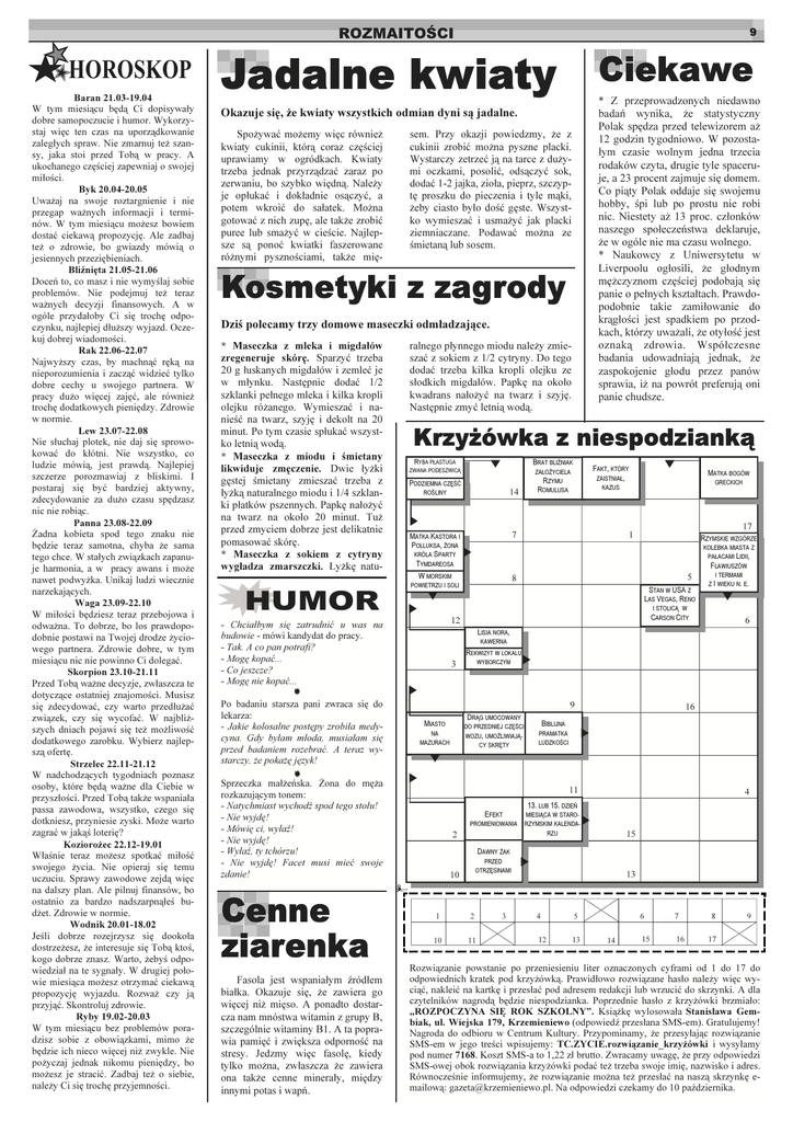 ROZMAITOŚCI HOROSKOP Baran 21.03-19.04 W tym miesiącu będą Ci dopisywały dobre samopoczucie i humor. Wykorzystaj więc ten czas na uporządkowanie zaległych spraw. Nie zmarnuj też szansy, jaka stoi przed Tobą w pracy. A ukochanego częściej zapewniaj o swojej miłości. Byk 20.04-20.05 Uważaj na swoje roztargnienie i nie przegap ważnych informacji i terminów. W tym miesiącu możesz bowiem dostać ciekawą propozycję. Ale zadbaj też o zdrowie, bo gwiazdy mówią o jesiennych przeziębieniach. Bliźnięta 21.05-21.06 Doceń to, co masz i nie wymyślaj sobie problemów. Nie podejmuj też teraz ważnych decyzji finansowych. A w ogóle przydałoby Ci się trochę odpoczynku, najlepiej dłuższy wyjazd. Oczekuj dobrej wiadomości. Rak 22.06-22.07 Najwyższy czas, by machnąć ręką na nieporozumienia i zacząć widzieć tylko dobre cechy u swojego partnera. W pracy dużo więcej zajęć, ale również trochę dodatkowych pieniędzy. Zdrowie w normie. Lew 23.07-22.08 Nie słuchaj plotek, nie daj się sprowokować do kłótni. Nie wszystko, co ludzie mówią, jest prawdą. Najlepiej szczerze porozmawiaj z bliskimi. I postaraj się być bardziej aktywny, zdecydowanie za dużo czasu spędzasz nic nie robiąc. Panna 23.08-22.09 Żadna kobieta spod tego znaku nie będzie teraz samotna, chyba że sama tego chce. W stałych związkach zapanuje harmonia, a w pracy awans i może nawet podwyżka. Unikaj ludzi wiecznie narzekających. Waga 23.09-22.10 W miłości będziesz teraz przebojowa i odważna. To dobrze, bo los prawdopodobnie postawi na Twojej drodze życiowego partnera. Zdrowie dobre, w tym miesiącu nic nie powinno Ci dolegać. Skorpion 23.10-21.11 Przed Tobą ważne decyzje, zwłaszcza te dotyczące ostatniej znajomości. Musisz się zdecydować, czy warto przedłużać związek, czy się wycofać. W najbliższych dniach pojawi się też możliwość dodatkowego zarobku. Wybierz najlepszą ofertę. Strzelec 22.11-21.12 W nadchodzących tygodniach poznasz osoby, które będą ważne dla Ciebie w przyszłości. Przed Tobą także wspaniała passa zawodowa, wszystko, czego się dotkniesz, przyniesie zyski. Może warto zagrać w jakąś loterię? Koziorożec 22.12-19.01 Właśnie teraz możesz spotkać miłość swojego życia. Nie opieraj się temu uczuciu. Sprawy zawodowe zejdą więc na dalszy plan. Ale pilnuj finansów, bo ostatnio za bardzo nadszarpnąłeś budżet. Zdrowie w normie. Wodnik 20.01-18.02 Jeśli dobrze rozejrzysz się dookoła dostrzeżesz, że interesuje się Tobą ktoś, kogo dobrze znasz. Warto, żebyś odpowiedział na te sygnały. W drugiej połowie miesiąca możesz otrzymać ciekawą propozycję wyjazdu. Rozważ czy ją przyjąć. Skontroluj zdrowie. Ryby 19.02-20.03 W tym miesiącu bez problemów poradzisz sobie z obowiązkami, mimo że będzie ich nieco więcej niż zwykle. Nie pożyczaj jednak nikomu pieniędzy, bo możesz je stracić. Zadbaj też o siebie, należy Ci się trochę przyjemności. 9 Jadalne kwiaty Ciekawe * Z przeprowadzonych niedawno badań wynika, że statystyczny Polak spędza przed telewizorem aż 12 godzin tygodniowo. W pozostałym czasie wolnym jedna trzecia rodaków czyta, drugie tyle spaceruje, a 23 procent zajmuje się domem. Co piąty Polak oddaje się swojemu hobby, śpi lub po prostu nie robi nic. Niestety aż 13 proc. członków naszego społeczeństwa deklaruje, że w ogóle nie ma czasu wolnego. * Naukowcy z Uniwersytetu w Liverpoolu ogłosili, że głodnym mężczyznom częściej podobają się panie o pełnych kształtach. Prawdopodobnie takie zamiłowanie do krągłości jest spadkiem po przodkach, którzy uważali, że otyłość jest oznaką zdrowia. Współczesne badania udowadniają jednak, że zaspokojenie głodu przez panów sprawia, iż na powrót preferują oni panie chudsze. Okazuje się, że kwiaty wszystkich odmian dyni są jadalne. Spożywać możemy więc również kwiaty cukinii, którą coraz częściej uprawiamy w ogródkach. Kwiaty trzeba jednak przyrządzać zaraz po zerwaniu, bo szybko więdną. Należy je opłukać i dokładnie osączyć, a potem wkroić do sałatek. Można gotować z nich zupę, ale także zrobić puree lub smażyć w cieście. Najlepsze są ponoć kwiatki faszerowane różnymi pysznościami, także mię- sem. Przy okazji powiedzmy, że z cukinii zrobić można pyszne placki. Wystarczy zetrzeć ją na tarce z dużymi oczkami, posolić, odsączyć sok, dodać 1-2 jajka, zioła, pieprz, szczyptę proszku do pieczenia i tyle mąki, żeby ciasto było dość gęste. Wszystko wymieszać i usmażyć jak placki ziemniaczane. Podawać można ze śmietaną lub sosem. Kosmetyki z zagrody Dziś polecamy trzy domowe maseczki odmładzające. * Maseczka z mleka i migdałów zregeneruje skórę. Sparzyć trzeba 20 g łuskanych migdałów i zemleć je w młynku. Następnie dodać 1/2 szklanki pełnego mleka i kilka kropli olejku różanego. Wymieszać i nanieść na twarz, szyję i dekolt na 20 minut. Po tym czasie spłukać wszystko letnią wodą. * Maseczka z miodu i śmietany likwiduje zmęczenie. Dwie łyżki gęstej śmietany zmieszać trzeba z łyżką naturalnego miodu i 1/4 szklanki płatków pszennych. Papkę nałożyć na twarz na około 20 minut. Tuż przed zmyciem dobrze jest delikatnie pomasować skórę. * Maseczka z sokiem z cytryny wygładza zmarszczki. Łyżkę natu- HUMOR ralnego płynnego miodu należy zmieszać z sokiem z 1/2 cytryny. Do tego dodać trzeba kilka kropli olejku ze słodkich migdałów. Papkę na około kwadrans nałożyć na twarz i szyję. Następnie zmyć letnią wodą. Krzyżówka z niespodzianką PODZIEMNA CZĘŚĆ ROŚLINY 14 MATKA KASTORA I POLLUKSA, ŻONA KRÓLA SPARTY TYMDAREOSA 7 W MORSKIM POWIETRZU I SOLI Fasola jest wspaniałym źródłem białka. Okazuje się, że zawiera go więcej niż mięso. A ponadto dostarcza nam mnóstwa witamin z grupy B, szczególnie witaminy B1. A ta poprawia pamięć i zwiększa odporność na stresy. Jedzmy więc fasolę, kie