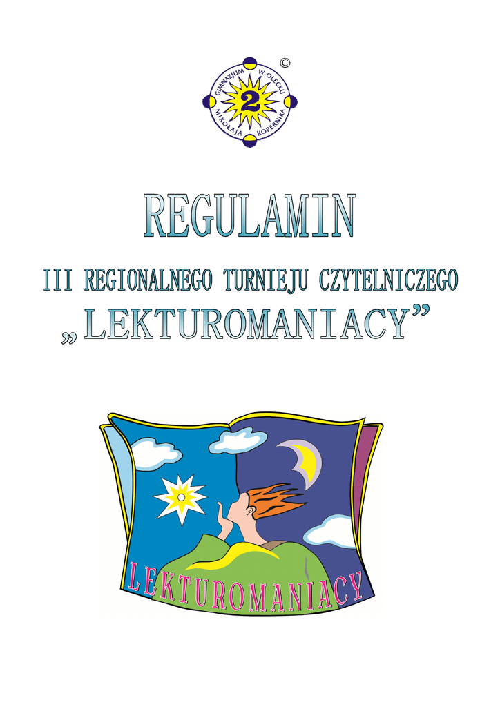 I ORGANIZATOR: Gimnazjum nr 2 im. Mikołaja Kopernika w Olecku II CELE KONKURSU: rozbudzanie i rozwijanie zainteresowań czytelniczych uczniów; pogłębianie wiedzy z zakresu literatury powszechnej ze szczególnym uwzględnieniem dzieł literackich ważnych dla kultury polskiej; rozwijanie kluczowych kompetencji związanych z odbiorem tekstów kultury na trzech płaszczyznach: tekstu czytanego, obrazu, scenki teatralnej; ukazanie wieloaspektowego wymiaru przedsięwzięcia poprzez wyłonienie talentów artystycznych (aktorskich, recytatorskich, plastycznych); promowanie uczniów uzdolnionych humanistycznie; zaszczepienie i pogłębienie nawyków czytelniczych; nawiązanie współpracy ze szkołami z regionu, wymiana doświadczeń i dobrych praktyk; integracja środowiska Krainy EGO w wymiarze kulturowym; III KONTAKT: Gimnazjum nr 2 im. Mikołaja Kopernika w Olecku ul. Słowiańska 1 19-400 Olecko tel.: 87 520 20 86 fax: 87 520 16 79 www.gim2.olecko.edu.pl e-mail: [email protected] osoby odpowiedzialne: Mariola Zdancewicz, Katarzyna Werstak IV ORGANIZACJA KONKURSU: Adresatami konkursu są uczniowie klas I-III gimnazjów powiatów: oleckiego, ełckiego i gołdapskiego, którzy przygotowują się ze szczegółowej znajomości lektur wskazanych w niniejszym regulaminie. Konkurs ma charakter dwuetapowy: I etap - eliminacje szkolne - przeprowadza gimnazjum tak, aby wyłonić 3-osobowe drużyny. Informacje o wynikach I etapu należy przesłać, według zamieszczonego wzoru do 2 marca 2015r. na adres organizatora (pocztą,e-mailem, faxem). Prosimy o wyłonienie uczestników „rezerwowych”, aby uniknąć absencji z powodów niezależnych i losowych. II etap - etap regionalny, 9 kwietnia 2015r., godz. 10.00. Regionalny Ośrodek Kultury „Mazuty Garbate” w Olecku Plac Wolności 22 l9-400 Olecko Finał konkursu ma charakter turnieju, podczas którego uczniowie będą musieli wykazać się umiejętnościami sprawdzanymi na egzaminie gimnazjalnym: I - Odbiór wypowiedzi i wykorzystanie zawartych w nich informacji, II - Analiza i interpretacja tekstów kultury. Uczeń doskonali sprawność analizy i interpretacji tekstów kultury; [...] wykorzystuje podane pojęcia w refleksji o literaturze i wartościach, III - Tworzenie wypowiedzi. Ponadto każdy zespół przygotowuje wcześniej: Recytację fragmentu jednego ze wskazanych utworów (do wyboru): „Balladyna” Juliusza Słowackiego, „Skąpiec” Moliera, „Antygona” Sofoklesa (10-15 wersów) – (kryteria oceny: znajomość tekstu, właściwe tempo mówienia, wyraźne mówienie, wyraziste mówienie) Plakat zachęcający do przeczytania wybranej lektury (kryteria oceny: czytelność i atrakcyjność informacji, poprawność merytoryczna, połączenie obrazu i pisma w jedną całość, oryginalność ujęcia tematu, oryginalność kompozycji i zastosowane techniki plastyczne) Film przedstawiający dowolną scenę z wybranego utworu. Drużyna zobowiązana jest do krótkiego wprowadzenia w tematykę wybranej sceny filmowej oraz uzasadnienie jej wyboru. Film należy przesłać w formie pliku elektronicznego na adres e-mail szkoły, celem wykluczenia problemów odczytu pliku, na tydzień przed konkursem, tj. do 2 kwietnia 2015r. IV NAGRODY: Uczestnicy III Regionalnego Turnieju Czytelniczego otrzymają atrakcyjne nagrody. Członkowie zwycięskiej drużyny otrzymają tablety z nowoczesną aplikacja e-booka. Pozostałym uczestnikom zostaną wręczone nagrody książkowe. Przewidywana jest również Nagroda Publiczności. POSTANOWIENIA KOŃCOWE Finalistów obowiązuje skromny strój galowy. Nie wolno korzystać z żadnych pomocy naukowych, jakichkolwiek urządzeń elektronicznych (telefony, komórkowe, notesy, słowniki elektroniczne itp.). Zwycięzcami konkursu zostają uczniowie trzech drużyn, które otrzymają największą ilość punktów w turnieju. Ogłoszenie wyników i wręczenie nagród laureatom nastąpi tego samego dnia, po zakończeniu wszystkich konkurencji i podliczeniu punktów przez Jury Konkursowe. Gimnazja, przesyłając informacje o uczestnikach, wyrażają zgodę na przetwarzanie przez organizatora danych osobowych w celach wynikających z Regulaminu konkursu, umieszczania imiennych wyników i zdjęć na stronie internetowej organizatora oraz w prasie lokalnej zgodnie z ustawą z dnia 29 sierpnia 1997 r. o ochronie danych osobowych (Dz. U. z 2002, Nr 101, poz. 926 z późn. zm.). Organizator zastrzega sobie prawo wykorzystania prac uczestników konkursu do celów naukowych i edukacyjnych oraz ich nieodpłatnej publikacji - we fragmentach lub w całości - z zachowaniem praw autorskich. WYKAZ LEKTUR (ze szczególnym uwzględnieniem znajomości fundamentalnych dla kultury polskiej utworów oznaczonych gwiazdką): 1. W. Szekspir Romeo i Julia 2. A. Fredro Zemsta * 3. A. Mickiewicz Dziady cz. II* 4. A. de Saint-Exupery Mały Książę 5. Molier Skąpiec 6. H. Sienkiewicz Krzyżacy* 7. A. Kamiński Kamienie na szaniec 8. M. Białoszewski Pamiętnik z powstania warszawskiego (fragmenty) 9. N. Gaiman Nigdziebądź 10. E-E. Schmitt Oskar i pani Róża 11. J. Słowacki Balladyna 12. Sławomir Mrożek Wesele w Atomicach 13. Sofokles Antygona 14. T. Tryzna Panna Nikt