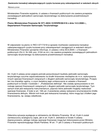 Zawieranie transakcji zabezpieczających ryzyko kursowe przy zobowiązaniach w walutach obcych Wpisany przez Ministerstwo Finansów wyjaśnia, iż ustawa o finansach publicznych nie zawiera przepisów zezwalających jednostkom samorządu terytorialnego na dokonywanie przedmiotowych transakcji. Pismo Ministerstwa Finansów Nr ST1-4834-15/WWRI/08/418 z dnia 14.5.2008 r., Departament Finansów Samorządu Terytorialnego W odpowiedzi na pismo nr RIO-I-0717/218 w sprawie możliwości zawierania transakcji zabezpieczających ryzyko kursowe przy zobowiązaniach zaciąganych w walutach obcych Ministerstwo Finansów uprzejmie informuje, iż ustawa z dnia 30.6.2005 r. o finansach publicznych (Dz.U. Nr 249, poz. 2104 ze zm.) nie zawiera przepisów zezwalających jednostkom samorządu terytorialnego na dokonywanie przedmiotowych transakcji. Art. 9 pkt 3 ustawy przez pojęcie potrzeb pożyczkowych budżetu jednostki samorządu terytorialnego rozumie zapotrzebowanie na środki finansowe niezbędne do m.in. wykonywania innych operacji finansowych związanych z długiem jednostki samorządu terytorialnego. Przepis ten ma charakter ogólny, o czym świadczy jego umieszczenie w ustawie o finansach publicznych w Dziale I rozdziale I - „Podstawowe definicje". Nie zostały sprecyzowane w nim rodzaje operacji finansowych związanych z długiem jednostki samorządu terytorialnego. Tym samym brak jest wskazania instrumentarium, poprzez które jednostki mogłyby realizować operacje finansowe. Z kolei w art. 168 ust. 2 powołanej ustawy wskazano enumeratywnie źródła finansowania deficytu. Wśród nich brak jest wskazania transakcji, które mogą być źródłem jego finansowania, np. swapy odsetkowe. Odwrotna sytuacja występuje w odniesieniu do Ministra Finansów. W art. 8 pkt 4 został zamieszczony analogiczny zapis, jak w art. 9 pkt 3. Jednakże w Dziale II ustawy doprecyzowano, jakiego rodzaju operacje finansowe mogą być dokonywane przez Ministra Finansów reprezentującego Skarb Państwa. W art. 71 pkt 3 ustawy o finansach publicznych 1/2 Zawieranie transakcji zabezpieczających ryzyko kursowe przy zobowiązaniach w walutach obcych Wpisany przez upoważnia się Ministra Finansów do przeprowadzenia operacji związanych z finansowymi instrumentami pochodnymi, do których zaliczamy m.in. swapy walutowe czy też swapy odsetkowe. Z kolei art. 72 ust. 3 stanowi, że zarządzanie aktywami finansowymi obejmuje wykonywanie operacji i działań na rynkach finansowych w celu obniżenia ryzyka i kosztów obsługi długu Skarbu Państwa. Również w art. 141 znajdują się zapisy wskazujące na możliwości dokonywania przez Ministra Finansów transakcji finansowych na instrumentach pochodnych. Należy również zauważyć, że przepisy dające uprawnienie Ministrowi Finansów do przeprowadzania operacji związanych z finansowymi instrumentami pochodnymi dotyczą szeroko rozumianego zarządzania długiem Skarbu Państwa. Dlatego też w celu stworzenia podstawy prawnej dla dokonywania transakcji finansowych na instrumentach pochodnych dotyczących nie tylko długu, ale również aktywów Skarbu Państwa wprowadza się, od 2006 r., w ustawie budżetowej na dany rok upoważnienie dla Ministra Finansów do dokonywania przedmiotowych transakcji finansowych na instrumentach pochodnych, zmieniających strukturę przepływów. Biorąc pod uwagę powyższe, należy podkreślić, iż w ustawie z dnia 30.6.2005 r. o finansach publicznych brak jest przepisów, które dawałyby wprost uprawnienie jednostkom samorządu terytorialnego do dokonywania operacji finansowych zabezpieczających ryzyko stopy procentowej, czy też ryzyko walutowe. Przedstawiona opinia nie ma charakteru wiążącego. Ministerstwo Finansów informuje, iż nie posiada ustawowych kompetencji do dokonywania obowiązującej wykładni przepisów ustawy o finansach publicznych. 2/2