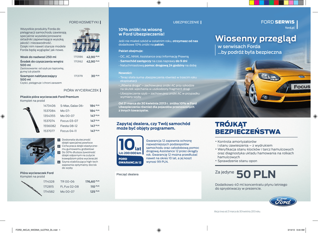 FORD KOSMETYKI 10% zniżki na wiosnę w Ford Ubezpieczenia! Wszystkie produkty Forda do pielęgnacji samochodu zawierają specjalnie wyselekcjonowane składniki zapewniające wysoką jakość i niezawodność. Dzięki nim nawet starsze modele Forda będą wyglądać jak nowe. Jeśli nie miałeś szkód w ostatnim roku, otrzymasz od nas dodatkowe 10% zniżki na pakiet. Pakiet obejmuje: Wosk do nadwozi 250 ml 1713186 42,90 PLN Środek do czyszczenia wnętrz 500 ml 1713162 42,90 PLN Szampon nabłyszczający 500 ml 1713179 30 PLN Zastosowanie: od szyb po tapicerkę, gumę lub plastik Czyści, pielęgnuje i chroni zarazem PIÓRA WYCIERACZEK Płaskie pióra wycieraczek Ford Premium Komplet na przód 1473406 S-Max, Galax 06- 184 PLN 1537084 Mo 07- 184 PLN 1354355 Mo 00-07 147 PLN 1537074 Focus 03-07 147 PLN 1556082 Fiesta 08-12 147 PLN 1537077 Focus 04-11 147 PLN • OC, AC, NNW, Assistance oraz Informację Prawną 4 3 Pióra wycieraczek Ford Komplet na przód 176,60 PLN TR 00-06 1712815 Fi, Fus 02-08 110 PLN 1714582 Mo 00-07 125 PLN w serwisach Forda …by podróż była bezpieczna Nowości: • Teraz stała suma ubezpieczenia również w trzecim roku eksploatacji • „Równa droga” – zachowujesz zniżki AC przy szkodzie na skutek wjechania w uszkodzony fragment drogi • Ubezpieczenie szyb – zachowujesz zniżki AC w przypadku wymiany szyby Od 21 marca do 30 kwietnia 2013 r. zniżka 10% w Ford Ubezpieczenia również dla pojazdów przenoszonych z innych towarzystw. Zapytaj dealera, czy Twój samochód może być objęty programem. Gwarancja 12 zapewnia ochronę najważniejszych podzespołów samochodu oraz całodobową pomoc drogową Assistance 12 przez okrągły rok. Gwarancję 12 można przedłużać nawet na okres 10 lat, a jej koszt wynosi 99 PLN. Pieczęć dealera 1714328 Wiosenny przegląd • Natychmiastową pomoc drogową 24 godziny na dobę dzięki specjalnej powłoce icha praca dzięki elastyczne2 C mu gumowemu grzbietowi 3 Do 30% dłuższa żywotność dzięki odpornym na zużycie krawędziom pióra wycieraczki 4 Szyna stabilizująca high tech zapewnia optymalny docisk do szyby 1 ford.pl • Samochód zastępczy na czas naprawy do 9 dni 1 Doskonała skuteczność 2 FORD SERWIS UBEZPIECZENIE TRÓJKĄT BEZPIECZEŃSTWA • Kontrola amortyzatorów i stanu zawieszenia – z wydrukiem • Weryfikacja stanu klocków i tarcz hamulcowych oraz diagnostyka układu hamowania na rolkach hamulcowych • Sprawdzenie stanu opon Za jedyne 50 PLN Dodatkowo 40 ml koncentratu płynu letniego do spryskiwaczy w prezencie. Akcja trwa od 21 marca do 30 kwietnia 2013 roku. FORD_AKCJA_WIOSNA_ULOTKA_DL.indd 1 3/14/13 9:44 AM OPONA FELGI Semperit SPEED-LIFE Felga aluminiowa •O pona Semperit SPEED-LIFE ma innowacyjny, kierunkowy wzór bieżnika, dzięki któremu jest on w stałym kontakcie z podłożem. Zastosowanie takiego rozwiązania skraca drogę hamowania i zapewnia wysoki komfort użytkowania. •Z budowana jest z nowoczesnej mieszanki gumowej z domieszką sylikatu, dzięki czemu jest odporna na wysokie temperatury i wyróżnia się niską ścieralnością. •W raz z odpowiednim rozłożeniem nacisków uzyskano powolne i równomierne zużywanie się bieżnika. Opona nie traci swoich właściwości przez cały okres użytkowania. •S kutecznie odprowadza wodę. •U zyskano dobrą trakcję i optymalną przyczepność podczas pokonywania zakrętów, a zastosowanie ostrych krawędzi na bieżniku gwarantuje szybką reakcję opony na nagłe manewry. 2200 PLN ZA KOMPLET 17’’ wzór 5-ramienny, srebrny MONDEO Felga aluminiowa 1950 Contenental Marka Semperit Rozmiar 205/55R16 ZA KOMPLET 16’’ wzór 5-ramienny typu Y, srebrny 91 SI V Bieżnik SPEED-LIFE 300 PLN FOCUS, C-MAX Felga aluminiowa 1950 KUGA Felga aluminiowa 2200 C FORD_AKCJA_WIOSNA_ULOTKA_DL.indd 2 C 2 (71 dB) 1710940 189 PLN Mondeo 2007-, 5-drzwiowy 1493066 203 PLN Dwustronna mata przedziału bagażowego Focus od 2011, kombi 1738196 395 PLN C-Max, C-Max Grand, 5-drzwiowy 1698580 189 PLN Focus od 2011 1726694 259 PLN S-Max do 3/2010 1787943 213 PLN Kuga 1726694 259 PLN Bagażnik podstawowy PLN ZA KOMPLET 16’’ wzór 5-ramienny typu Y, srebrny LI Focus od 2011, kombi Zestaw nakrętek zabezpieczajacych do felg aluminiowych PLN Semperit SPEED-LIFE jest bardzo bezpieczna i wyjątkowo komfortowa. Grupa Maty antypoślizgowe do bagażnika S-MAX, GALAXY Marka Semperit należy do międzynarodowego koncernu Continental. AKCESORIA PLN ZA KOMPLET 17’’ wzór 9x2-ramienny, srebrny FIESTA 1734408 867 PLN Mondeo 4/5-drzwiowy 1724805 867 PLN Uchwyt do przewozu roweru FreeRide 532 1746077 265 PLN ProRide 591 1698518 458 PLN Pacific 500, srebrny, 226x55x37cm 1513374 1290 PLN Pacific 700, srebrny, 232x70x40 cm 1773162 1720 PLN Boxy dachowe Felga aluminiowa 1600 PLN ZA KOMPLET 14“ 5x2-ramienna Focus od 2011, kombi 3/14/13 9:44 AM