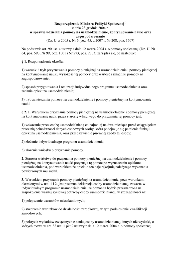 Rozporządzenie Ministra Polityki Społecznej 1) z dnia 23 grudnia 2004 r. w sprawie udzielania pomocy na usamodzielnienie, kontynuowanie nauki oraz zagospodarowanie (Dz. U. z 2005 r. Nr 6, poz. 45, z 2007 r. Nr 208, poz. 1507) Na podstawie art. 90 ust. 4 ustawy z dnia 12 marca 2004 r. o pomocy społecznej (Dz. U. Nr 64, poz. 593, Nr 99, poz. 1001 i Nr 273, poz. 2703) zarządza się, co następuje: § 1. Rozporządzenie określa: 1) warunki i tryb przyznawania pomocy pieniężnej na usamodzielnienie i pomocy pieniężnej na kontynuowanie nauki, wysokość tej pomocy oraz wartość i składniki pomocy na zagospodarowanie; 2) sposób przygotowania i realizacji indywidualnego programu usamodzielnienia oraz zadania opiekuna usamodzielnienia; 3) tryb zawieszania pomocy na usamodzielnienie i pomocy pieniężnej na kontynuowanie nauki. § 2. 1. Warunkiem przyznania pomocy pieniężnej na usamodzielnienie i pomocy pieniężnej na kontynuowanie nauki przez starostę właściwego do przyznania tej pomocy jest: 1) wskazanie przez osobę usamodzielnianą co najmniej na dwa miesiące przed osiągnięciem przez nią pełnoletności danych osobowych osoby, która podejmuje się pełnienia funkcji opiekuna usamodzielnienia, oraz przedstawienie pisemnej zgody tej osoby; 2) złożenie indywidualnego programu usamodzielnienia; 3) złożenie wniosku o przyznanie pomocy. 2. Starosta właściwy do przyznania pomocy pieniężnej na usamodzielnienie i pomocy pieniężnej na kontynuowanie nauki przyznaje tę pomoc po wyznaczeniu opiekuna usamodzielnienia, pod warunkiem że opiekun ten daje rękojmię należytego wykonania powierzonych mu zadań. 3. Warunkiem przyznania pomocy pieniężnej na usamodzielnienie, poza warunkami określonymi w ust. 1 i 2, jest pisemna deklaracja osoby usamodzielnianej, zawarta w indywidualnym programie usamodzielnienia, że pomoc ta będzie przeznaczona na zaspokojenie ważnej życiowej potrzeby osoby usamodzielnianej, w szczególności na: 1) polepszenie warunków mieszkaniowych; 2) stworzenie warunków do działalności zarobkowej, w tym podniesienie kwalifikacji zawodowych; 3) pokrycie wydatków związanych z nauką osoby usamodzielnianej, innych niż wydatki, o których mowa w art. 88 ust. 1 pkt 2 ustawy z dnia 12 marca 2004 r. o pomocy społecznej. 4. Warunkiem przyznania pomocy pieniężnej na kontynuowanie nauki, poza warunkami określonymi w ust. 1 i 2, jest: 1) określenie w indywidualnym programie usamodzielnienia planu kontynuowania nauki; 2) przedłożenie na początku każdego semestru zaświadczenia stwierdzającego kontynuowanie nauki w gimnazjum, szkole ponadgimnazjalnej, szkole ponadpodstawowej lub szkole wyższej. 5. Pomoc pieniężna na kontynuowanie nauki jest przyznawana na czas trwania roku szkolnego i roku akademickiego. 6. W przypadku gdy po ukończeniu nauki w szkole ponadgimnazjalnej osoba została przyjęta w tym samym roku kalendarzowym na studia wyższe, pomoc pieniężna na kontynuowanie nauki przysługuje do dnia 31 sierpnia. 7. W przypadku gdy po ukończeniu studiów pierwszego stopnia osoba została przyjęta w tym samym roku kalendarzowym na studia drugiego stopnia, pomoc pieniężna na kontynuowanie nauki przysługuje do dnia 30 września. § 3. 1. Dyrektor lub kierownik placówki opiekuńczo-wychowawczej typu rodzinnego i socjalizacyjnego, domu pomocy społecznej dla dzieci i młodzieży niepełnosprawnych intelektualnie, domu dla matek z małoletnimi dziećmi i kobiet w ciąży, zakładu poprawczego, schroniska dla nieletnich, specjalnego ośrodka szkolno-wychowawczego, specjalnego ośrodka wychowawczego, młodzieżowego ośrodka socjoterapii zapewniającego całodobową opiekę i młodzieżowego ośrodka wychowawczego, zwany dalej "dyrektorem lub kierownikiem", albo rodzina zastępcza informuje właściwe powiatowe centrum pomocy rodzinie, nie później jednak niż do dnia 10 grudnia roku poprzedzającego, o wychowankach, którzy w danym roku kalendarzowym osiągną pełnoletność. 2. Dyrektor lub kierownik albo rodzina zastępcza informuje właściwe powiatowe centrum pomocy rodzinie o zamiarze usamodzielnienia się wychowanka, co najmniej na trzy miesiące przed terminem opuszczenia przez niego placówki lub rodziny zastępczej. 3. Dyrektor lub kierownik albo rodzina zastępcza przekazuje dokumentację dotyczącą osoby usamodzielnianej powiatowemu centrum pomocy rodzinie, nie później niż na miesiąc przed terminem opuszczenia przez tę osobę placówki lub rodziny zastępczej. § 4. 1. Wniosek o przyznanie pomocy pieniężnej na usamodzielnienie i pomocy pieniężnej na kontynuowanie nauki osoba usamodzielniana składa do starosty właściwego do przyznania tej pomocy za pośrednictwem kierownika powiatowego centrum pomocy rodzinie właściwego ze względu na miejsce pobytu osoby usamodzielnianej. 2. Wniosek osoby usamodzielnianej rozpatruje kierownik powiatowego centrum pomocy rodzinie właściwego do przyznania pomocy w porozumieniu z opiekunem usamodzielnienia. § 5. 1. Wysokość pomocy pieniężnej na usamodzielnienie dla osoby usamodzielnianej, opuszczającej rodzinę zastępczą niespokrewnioną z dzieckiem i zawodową niespokrewnioną z dzieckiem rodzinę zastępczą, placówkę opiekuńczo-wychowawczą typu socjalizacyjnego, rodzinnego lub dom pomocy społecznej dla dzieci i młodzieży niepełnosprawnych intelektualnie, dom dla matek z małoletnimi dziećmi i kobiet w ciąży, ustala się w kwocie odpowiadającej: 1) 400 % podstawy, o której mowa w art. 78 ust. 2 ustawy z dnia 12 marca 2004 r. o pomocy społecznej, zwanej dalej "podstawą" - w przypadku gdy osoba usamodzielniana przebywała w rodzinie zastępczej niespokrewnionej z dzieckiem i zawodowej niespokrewnionej z dzieckiem rodzinie zastępczej, placówce opiekuńczo-wychowawczej typu socjalizacyjnego, rodzinnego lub w domu pomocy społecznej dla dzieci i młodzieży niepełnosprawnych intelektualnie przez okres powyżej trzech lat; 2) 400 % podstawy - w przypadku gdy os