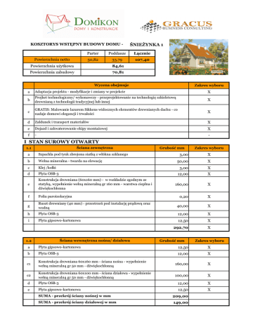 KOSZTORYS WSTĘPNY BUDOWY DOMU - Powierzchnia netto ŚNIEŻYNKA 1 Parter Poddasze Łącznie 50,82 33,79 107,40 Powierzchnia użytkowa 84,61 Powierzchnia zabudowy 70,81 Wycena obejmuje Zakres wyboru a Adaptacja projektu - modyfikacje i zmiany w projekcie X b Projket technologiczny/ wykonawczy - przeprojektowanie na technologię szkieletową drewnianą z technologii tradycyjnej lub innej X c GRATIS: Malowanie lazurem Sikkens widocznych elementów drewnianych dachu - co nadaje domowi elegancji i trwałości X d Załdunek i transport materiałów X e Dojazd i zakwaterowanie ekipy montażowej X f - - I STAN SUROWY OTWARTY Ściana zewnętrzna 1.1 a Szpachla pod tynk zbrojona siatką z włókna szklanego b Wełna mineralna - twarda na elewację c Klej /kołki d Płyta OSB-3 e Konstrukcja drewniana (60x160 mm) - w rozkładzie zgodnym ze statyką, wypełnienie wełną mineralną gr 160 mm - warstwa cieplna i dźwiękochłonna f Folia paroizolacyjna g Grubość mm Zakres wyboru 3,00 X 50,00 X 3,00 X 12,00 X 160,00 X 0,20 X Ruszt drewniany (40 mm) - przestrzeń pod instalację prądową oraz wodną 40,00 X h Płyta OSB-3 12,00 X i Płyta gipsowo-kartonowa 12,50 X 292,70 X Ściana wewnętrzna nośna/ działowa 1.2 Grubość mm Zakres wyboru a Płyta gipsowo-kartonowa 12,50 X b Płyta OSB-3 12,00 X c1 Konstrukcja drewniana 60x160 mm - ściana nośna - wypełnienie wełną mineralną gr 50 mm - dźwiękochłonną 160,00 X c2 Konstrukcja drewniana 60x100 mm - ściana działowa - wypełnienie wełną mineralną gr 50 mm - dźwiękochłonną 100,00 X d Płyta OSB-3 12,00 X e Płyta gipsowo-kartonowa 12,50 X SUMA - przekrój ściany nośnej w mm 209,00 SUMA - przekrój ściany działowej w mm 149,00 1.3A Strop - Budynek z użytkowym poddaszem a Płyta OSB-3 b Konstrukcja drewniana wypełniona wełną mineralną gr 50 mm izolującą - dźwiękochłonną c Folia paroizolacyjna d e 1.4A Grubość mm Zakres wyboru 22,00 X 200,00 X 0,20 X Ruszt drewniany 20,00 X Płyta gipsowo-kartonowa 12,50 X 254,70 X Konstrukcja dachu - Budynek z użytkowym poddaszem Grubość mm Zakres wyboru a Łaty dachowe (30x50 mm) 30,00 X b Kontrłaty dachowe (30x50mm) 30,00 X c Folia wiatroizolacyjna 0,20 X d Konstrukcja dachu - krokwie wypełnione wełną mineralną gr 200 mm - izolacja cieplna i dźwiękochłonna 200,00 X e Folia paroizolacyjna 0,20 X f Ruszt drewniany 20,00 X g Płyta gipsowo-kartonowa 12,50 X 292,90 X II STAN SUROWY ZAMKNIĘTY - DOM Z ZEWNĄTRZ GOTOWY Dach 2.1 Zakres wyboru a Dachówka cementowa - Brass Celtycka w kolorze standardowym (bez elementów dodatkowych: kominków wentylacyjnych oraz płotków przeciwśniegowych), X b Obróbki blacharskie X c Rynny i rury spustowe PCV Marley w kolorze brązowym lub białym, X d Podbitka dachu wykonana z szalówki drewnianej X Elewacja 2.2 a Ściany - tynk silikatowy firmy Knauf biały baranek 1,5mm Zakres wyboru X 2.3 Kominy Zakres wyboru a Komin do kominka + stopnie + ławeczka (bez odbioru kominiarza) wykończony tynkiem ponad dachem, X 2.4 Stolarka Zakres wyboru a Okna PCV Salamander 3D w obustronnej okleinie bez szprosów i okiennic wg projektu wraz z parapetami zewnętrznymi aluminiowymi w kolorze standartowym, X b Parapety zewnętrzne aluminiowe X c Drzwi wejściowe w cenie zakupu do 2tys. netto, X d Okna dachowe drewniane Roto 74x118cm typ 435H w kolorze naturalnym – szt.3, X e Balkon – podest drewniany ażurowy wraz z odwodnieniem, barierka drewniana lakierowana Sikkens X Schody 2.5 a Schody trapowe ocieplone na poddasze nieużytkowe, (I + II) RAZEM: DOMIKON - DOM Z ZEWNĄTRZ GOTOWY (NETTO) 2 Cena za 1 metr netto - powierzchnia po podłodze Zakres wyboru X 171 600,00 zł 1 597,77 zł III STANDARD DEWELOPERSKI - INSTALACJE + DODATKI WYLEWKI 3.1 a Zakres wyboru Wylewki na 5 cm styropianu na parterze i piętrze X Razem: 6 100,00 zł 3.2 Instalacja elektryczna i niskoprądowa Zakres wyboru a Instalacja elektryczna 100 punktów bez osprzętu, z tablicą z rozszerzeniem, dodatkowo 1 punkt telefoniczny, 2 punkty 3-fazowe i 1 punkt antenowy; montaż rozdzielni X Razem: 12 500,00 zł Instalacja i osprzęt C.O. 3.3 a Zakres wyboru CO podłogowe wodne bez kotłowni X Razem: 12 900,00 zł Instalacja wod-kan 3.4 a Zakres wyboru Instalacja wodno-kanalizacyjna wg projektu (wraz z geberitami bez przycisków), bez podgrzewacza X Razem: 10 600,00 zł Instalacja wentylacji grawitacyjnej 3.5 a Zakres wyboru Instalacja wentylacji grawitacyjnej X Razem: 2 000,00 zł (I + II + III) RAZEM: DOMIKON - STAN DEWELOPERSKI (NETTO) 215 700,00 zł 2 Cena za 1 metr netto - powierzchnia po podłodze 2 008,38 zł IV STANDARD DEWELOPERSKI Z INSTALACJAMI + FUNDAMENT Fundament 4 a Płyta fundamentowa pod budynkiem wraz z izolacją pionową i poziomą oraz z rozprowadzeniem instalacji (bez wykończenia cokołu) b Schody wejściowe (7m2) Razem: (I + II + III + IV) RAZEM: DOMIKON STAN DEWELOPERSKI Z FUNDAMENTEM (NETTO) Cena za 1 metr2 netto - powierzchnia po podłodze 21 600,00 zł 2 000,00 zł 23 600,00 zł 239 300,00 zł 2 228,12 zł V STANDARD POD KLUCZ LP ELEMENTY WYKOŃCZENIA POD KLUCZ 1 Szpachlowanie, tapetowanie, malowanie na biało 14 100,00 zł 2 Schody wewnętrzne z podstopnicami, sosnowe 10 500,00 zł 3 Parapety wewnętrzne z płyty wiórowej 4 Osprzęt elektryczny Ułożenie wykładziny podłogowej w sypialniach (wykładzina w cenie zakupu do 5 40zł/m2) 6 Hydroizolacje, glazura, terakota (w cenie zakupu do 40zł/m2) 7 Drzwi wewnętrzne Porta Minimax 2 400,00 zł 17 600,00 zł 8 800,00 zł Kocioł gazowy kondensacyjny Vaillant ecoTec VC120 + zasobnik c.w.u. VIH 120l. + 8 regulator pokojowy CalorMatic 430 12 400,00 zł Biały montaż – WC + bidet Cersanit Arena, umywalki Merida 60 + wanna a 9 obudową Santana 170x70, baterie Deante seria VANILLA BDL SUMA (I + II + III + IV+V) RAZEM: DOMIKON STAN POD KLUCZ (NETTO) Cena za 1 metr2 netto - powierzchnia po podłodze 5 a b c d d KOSZT netto Po stronie Inwestora Woda i prąd na budowie Możliwość wjazdu ciężkim sprzętem Wytyczenie budynk