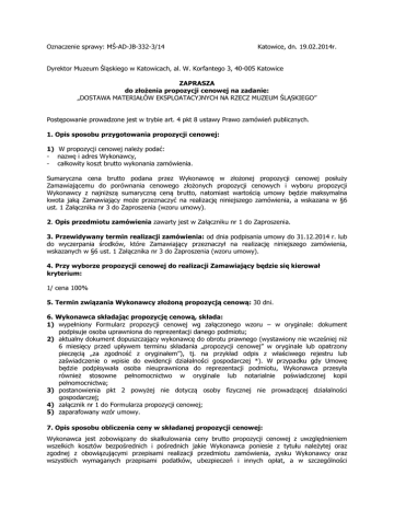 Oznaczenie sprawy: MŚ-AD-JB-332-3/14 Katowice, dn. 19.02.2014r. Dyrektor Muzeum Śląskiego w Katowicach, al. W. Korfantego 3, 40-005 Katowice ZAPRASZA do złożenia propozycji cenowej na zadanie: „DOSTAWA MATERIAŁÓW EKSPLOATACYJNYCH NA RZECZ MUZEUM ŚLĄSKIEGO” Postępowanie prowadzone jest w trybie art. 4 pkt 8 ustawy Prawo zamówień publicznych. 1. Opis sposobu przygotowania propozycji cenowej: 1) W propozycji cenowej należy podać: - nazwę i adres Wykonawcy, - całkowity koszt brutto wykonania zamówienia. Sumaryczna cena brutto podana przez Wykonawcę w złożonej propozycji cenowej posłuży Zamawiającemu do porównania cenowego złożonych propozycji cenowych i wyboru propozycji Wykonawcy z najniższą sumaryczną ceną brutto, natomiast wartością umowy będzie maksymalna kwota jaką Zamawiający może przeznaczyć na realizację niniejszego zamówienia, a wskazana w §6 ust. 1 Załącznika nr 3 do Zaproszenia (wzoru umowy). 2. Opis przedmiotu zamówienia zawarty jest w Załączniku nr 1 do Zaproszenia. 3. Przewidywany termin realizacji zamówienia: od dnia podpisania umowy do 31.12.2014 r. lub do wyczerpania środków, które Zamawiający przeznaczył na realizację niniejszego zamówienia, wskazanych w §6 ust. 1 Załącznika nr 3 do Zaproszenia (wzoru umowy). 4. Przy wyborze propozycji cenowej do realizacji Zamawiający będzie się kierował kryterium: 1/ cena 100% 5. Termin związania Wykonawcy złożoną propozycją cenową: 30 dni. 6. Wykonawca składając propozycję cenową, składa: 1) wypełniony Formularz propozycji cenowej wg załączonego wzoru – w oryginale: dokument podpisuje osoba uprawniona do reprezentacji danego podmiotu; 2) aktualny dokument dopuszczający wykonawcę do obrotu prawnego (wystawiony nie wcześniej niż 6 miesięcy przed upływem terminu składania „propozycji cenowej” w oryginale lub opatrzony pieczęcią „za zgodność z oryginałem”), tj. na przykład odpis z właściwego rejestru lub zaświadczenie o wpisie do ewidencji działalności gospodarczej *). W przypadku gdy Umowę będzie podpisywała osoba nieuprawniona do reprezentacji podmiotu, Wykonawca przesyła również stosowne pełnomocnictwo w oryginale lub notarialnie poświadczonej kopii pełnomocnictwa; 3) postanowienia pkt 2 powyżej nie dotyczą osoby fizycznej nie prowadzącej działalności gospodarczej; 4) załącznik nr 1 do Formularza propozycji cenowej; 5) zaparafowany wzór umowy. 7. Opis sposobu obliczenia ceny w składanej propozycji cenowej: Wykonawca jest zobowiązany do skalkulowania ceny brutto propozycji cenowej z uwzględnieniem wszelkich kosztów bezpośrednich i pośrednich jakie Wykonawca poniesie z tytułu należytej oraz zgodnej z obowiązującymi przepisami realizacji przedmiotu zamówienia, zysku Wykonawcy oraz wszystkich wymaganych przepisami podatków, ubezpieczeń i innych opłat, a w szczególności prawidłowego podatku VAT [jeżeli dotyczy]. Cena podana przez Wykonawcę w propozycji cenowej jest obowiązująca przez okres ważności umowy i nie będzie podlegała waloryzacji w okresie jej trwania, z zastrzeżeniem postanowienia §6 ust. 3 Załącznika nr 3 do Zaproszenia (wzoru umowy). Jeżeli Wykonawca jest osobą fizyczną nieprowadzącą działalności gospodarczej, wówczas cena brutto propozycji cenowej = cenie netto. 8. Miejsce i termin złożenia przez wykonawcę propozycji cenowej. Propozycję cenową opatrzoną nazwą i adresem Wykonawcy należy złożyć osobiście lub przesłać (za pośrednictwem poczty tradycyjnej/poczty kurierskiej) do Zamawiającego na adres: Muzeum Śląskie, al. W. Korfantego 3, 40-005 Katowice, Sekretariat – I piętro w terminie do dnia 27.02.2014 r. do godziny 10.00. PROPOZYCJE CENOWE ZŁOŻONE PO TYM TERMINIE NIE BĘDĄ ROZPATRYWANE. 9. Miejsce i termin otwarcia propozycji cenowych. Otwarcie złożonych do ww. terminu propozycji cenowych nastąpi w dniu 27.02.2014r. o godz. 10.30 w Muzeum Śląskim w Katowicach, przy al. W. Korfantego 3, piętro IV, pokój nr 404. 10. Osobą uprawnioną do kontaktów ze Wykonawcami jest: Katarzyna Szędzielorz, nr tel.: 32/779-93-27, Joanna Bogocz, nr tel.: 32/779-93-344. 11. Informacje dotyczące zawarcia umowy: 1) Po poprawieniu przez Zamawiającego ewentualnych omyłek rachunkowych i wyborze najkorzystniejszej propozycji cenowej, Zamawiający poinformuje o wyborze na stronie internetowej Zamawiającego: BIP – zakładka/zamówienia do 14 tys. euro, wskazując wybranego Wykonawcę i zaoferowaną przez niego cenę zł brutto za wykonanie przedmiotu zamówienia. 2) W terminie do 5 dni roboczych od dnia zamieszczenia informacji o wyborze, nastąpi zawarcie umowy z wybranym Wykonawcą na warunkach określonych we wzorze umowy (w Załączniku nr 3 do Zaproszenia). 3) W sprawach zawarcia umowy należy kontaktować się z osobą wskazaną w pkt 10 Zaproszenia. Zamawiający zastrzega sobie 30 dniowy termin płatności. Zamawiający nie zwraca Wykonawcom kosztów związanych z przygotowaniem i złożeniem przez Wykonawców propozycji cenowych. Zamawiający zastrzega sobie prawo odstąpienia od udzielenia zamówienia bez podania przyczyn, co nie może być podstawą ewentualnych roszczeń zaproszonego wykonawcy wobec zamawiającego. UWAGA! Odrzuceniu podlegają propozycje cenowe wskazujące inny termin realizacji zamówienia niż określony w pkt 3 niniejszego Zaproszenia; propozycje cenowe bez podpisu; propozycje cenowe podpisane przez osobę nieuprawnioną do reprezentacji podmiotu, a nie zawierające stosownego Pełnomocnictwa w odpowiedniej formie. Wszelkie skreślenia, dopiski i poprawki muszą być zaparafowane przez osoby podpisujące ofertę. Załączniki do Zaproszenia: 1. Opis przedmiotu zamówienia. 2. Wzór formularza propozycji cenowej + Załącznik nr 1 do propozycji cenowej. 3. Wzór Umowy. W dniu 19.02.2014r. zatwierdził Dyrektor Muzeum Śląskiego dr Dominik Abramowicz Załącznik nr 1 Zaproszenie do złożenia propozycji cenowej na zadanie: „DOSTAWA