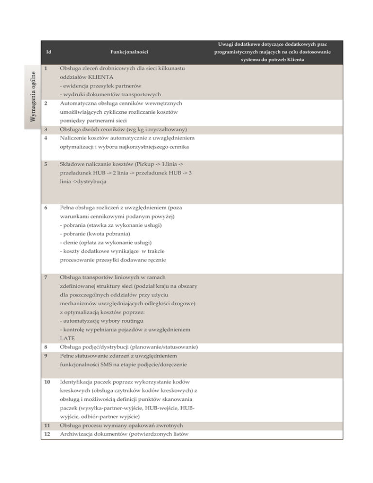 Uwagi dodatkowe dotyczące dodatkowych prac Id Funkcjonalności programistycznych mających na celu dostosowanie systemu do potrzeb Klienta Wymagania ogólne 1 Obsługa zleceń drobnicowych dla sieci kilkunastu oddziałów KLIENTA - ewidencja przesyłek partnerów - wydruki dokumentów transportowych 2 Automatyczna obsługa cenników wewnętrznych umożliwiających cykliczne rozliczanie kosztów pomiędzy partnerami sieci 3 Obsługa dwóch cenników (wg kg i zryczałtowany) 4 Naliczenie kosztów automatycznie z uwzględnieniem optymalizacji i wyboru najkorzystniejszego cennika 5 Składowe naliczanie kosztów (Pickup -> 1.linia -> przeładunek HUB -> 2 linia -> przeładunek HUB -> 3 linia ->dystrybucja 6 Pełna obsługa rozliczeń z uwzględnieniem (poza warunkami cennikowymi podanym powyżej) - pobrania (stawka za wykonanie usługi) - pobranie (kwota pobrania) - clenie (opłata za wykonanie usługi) - koszty dodatkowe wynikające w trakcie procesowanie przesyłki dodawane ręcznie 7 Obsługa transportów liniowych w ramach zdefiniowanej struktury sieci (podział kraju na obszary dla poszczególnych oddziałów przy użyciu mechanizmów uwzględniających odległości drogowe) z optymalizacją kosztów poprzez: - automatyzację wybory routingu - kontrolę wypełniania pojazdów z uwzględnieniem LATE 8 Obsługa podjęć/dystrybucji (planowanie/statusowanie) 9 Pełne statusowanie zdarzeń z uwzględnieniem funkcjonalności SMS na etapie podjęcie/doręczenie 10 Identyfikacja paczek poprzez wykorzystanie kodów kreskowych (obsługa czytników kodów kreskowych) z obsługą i możliwością definicji punktów skanowania paczek (wysyłka-partner-wyjście, HUB-wejście, HUBwyjście, odbiór-partner wyjście) 11 Obsługa procesu wymiany opakowań zwrotnych 12 Archiwizacja dokumentów (potwierdzonych listów przewozowych) 13 Obsługa procesu zwrotu dokumentów 14 Obsługa usług specjalnych - clenie - ADR - dostawy do godziny 9 - dostawy w soboty 15 EDI – obsługa wymiany danych z partnerami w Zespół CS zaimplementował i wdrożył z sukcesem w ramach sieci oraz partnerami zagranicznymi 2012 proces komunikacji poprzez EDIFACT do (EDIFACT, FORTRAS) wymiany danych pomiędzy partnerami w sieci TP/Orange 16 Pełne raportowanie – tworzenie i udostępnienie Zaawansowane mechanizmy do raportowania są raportów zarówno dla Partnerów KLIENTA jak i dostępne w ramach środowiska Apollo Transport 2.0 klientów korzystających z webbooking (modyfikacja raportów nie wymaga angażowania specjalisty IT). Dodatkowo w ramach partnerstwa z Oracle, w 2012 zintegrowano Apollo wersji 2.0 z najmocniejszym na rynku silnikiem analitycznym Funkcjonalność dot. tras Oracle Business Intelligence 15 Ofertowanie pozwalające na oszacowanie kosztów 16 Aplikacja ma umożliwić tworzenie dowolnych Komfort pracy dyspozytora jest jednym z połączeń z uwzględnieniem trasy domyślnej podczas krytycznym elementów projektowania Apollo wprowadzania danych przez użytkownika Transport 2.0 – dlatego duży nacisk jest położony aby zarządzanie trasami i wprowadzanie danych było możliwe z poziomu jednego widoku-pulpitu dyspozytora a dynamiczne tworzenie tras możliwe m.in. dzięki wykorzystaniu mechanizmów drag&drop na obiekcie mapy 17 Struktura routingu nie powinna być ograniczona do tabeli 18 Procedura dodawania i usuwania tras jest definiowana Funkcjonalność dot.opakowań z poziom administratora systemu 19 Routing jest powiązany bezpośrednio z cennikami 20 System ma mieć możliwość zarządzania opakowaniami, obsługę katalogu, cenników w ujęciu opakowań zryczałtowanych: REP: 1,20 x 0,80 x 2,00 do jednej palety 1000KG RKP: 1,20 x 1,20 x 2,00 do jednej palety 1500KG RPP: 0,80 x 0,60 x 1,50 do jednej palety 1000KG PPP: 1,20 x 1,00 x 2,20 do jednej palety 1200KG REP: 1,20 x 0,80 x 2,00 do jednej palety 1000KG 21 Kalkulacja rozliczeń za przesyłki wg schematu: - Pickup Pełne spełnienie wymagania z dostosowaniem do - 1 Linia realiów KLIENTA wymaga ograniczonych prac - Przeładunek HUP/RUP deweloperskich. - 2 Linia - Przeładunek HUP/RUP - 3 linia - Dystrybucja 22 Kalkulacja przesyłki ma być widoczna na poziomie Wybrane szczegóły funkcji wprowadzania przesyłki natychmiast po wprowadzanie podstawowych parametrów przesyłki 23 Rozliczenia mają być w pełni zautomatyzowane, to znaczy kalkulacja w systemie generowane bez ingerencji użytkownika celem wyeliminowania błędów przy ręcznych wprowadzania danych (powiązania z cennikami, optymalizacja kosztowa) 24 System ma umożliwić rozliczanie poza kosztami: - podjęcia - LH - przeładunków - dystrybucji z uwzględnieniem: - pobrania (stawka za wykonanie usługi) - pobranie (kwota pobrania) celnie (opłata za wykonanie usługi) - koszty dodatkowe wynikające w trakcie procesowania przesyłki dodawane ręcznie - koszty ubezpieczenia 25 26 Elastyczny model wprowadzania kosztów w systemie (Oddział Zlecający, Oddział Nadania, Oddział Pełne spełnienie funkcjonalności dostosowanej do Odbioru, HUB) z mechanizmem akceptacji kosztów realiów KLIENTA wymaga ograniczonych prac przez OZ. deweloperskich System zapewni mechanizm do odrzucenia kosztów Pełne spełnienie funkcjonalności dostosowanej do dodatkowych z podaniem przyczyny realiów KLIENTA wymaga ograniczonych prac deweloperskich 27 Mechanizm zapewniający akceptację kosztów Pełne spełnienie funkcjonalności dostosowanej do automatycznie po 3 dniach realiów KLIENTA wymaga ograniczonych prac deweloperskich. 28 Mechanizm kontrolny zapewniający brak możliwości automatycznej akceptacji odrzuconych kosztów. 29 Zarządzanie w systemie cennikami (obecnie są dwa rodzaje cenników do wdrożenia w systemie: zryczałtowany i wagowy) 30 Zarządzanie w systemie procesem rozliczania świadczeń partnerów i Centrali wewnątrz KLIENTA w tym zachowanie logiki procesu wg której uzależnione od przesyłki rozliczenie wewnątrz KLIENTA pomiędzy Partnerami jak również Partnerami i Centralą nast