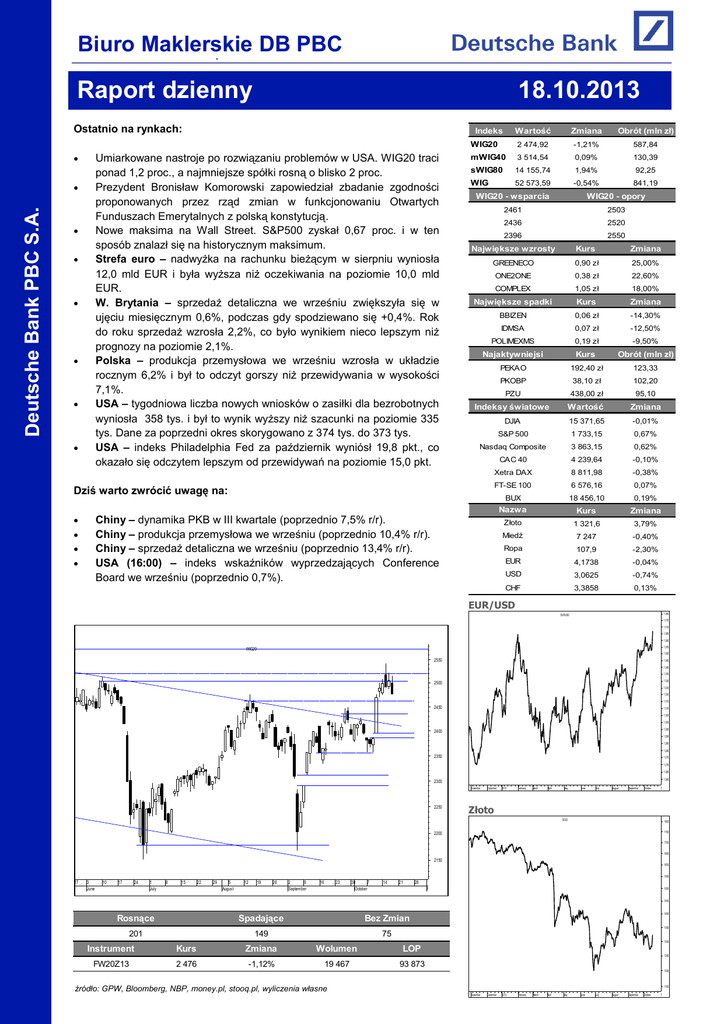 Biuro Maklerskie DB PBC f Raport dzienny 18.10.2013 Ostatnio na rynkach: Deutsche Bank PBC S.A. Zmiana Obrót (mln zł) 2 474,92 -1,21% 587,84 mWIG40 3 514,54 0,09% 130,39 sWIG80 14 155,74 1,94% 92,25 WIG 52 573,59 -0,54% 841,19 Indeks Umiarkowane nastroje po rozwiązaniu problemów w USA. WIG20 traci ponad 1,2 proc., a najmniejsze spółki rosną o blisko 2 proc. Prezydent Bronisław Komorowski zapowiedział zbadanie zgodności proponowanych przez rząd zmian w funkcjonowaniu Otwartych Funduszach Emerytalnych z polską konstytucją. Nowe maksima na Wall Street. S&P500 zyskał 0,67 proc. i w ten sposób znalazł się na historycznym maksimum. Strefa euro – nadwyżka na rachunku bieżącym w sierpniu wyniosła 12,0 mld EUR i była wyższa niż oczekiwania na poziomie 10,0 mld EUR. W. Brytania – sprzedaż detaliczna we wrześniu zwiększyła się w ujęciu miesięcznym 0,6%, podczas gdy spodziewano się +0,4%. Rok do roku sprzedaż wzrosła 2,2%, co było wynikiem nieco lepszym niż prognozy na poziomie 2,1%. Polska – produkcja przemysłowa we wrześniu wzrosła w układzie rocznym 6,2% i był to odczyt gorszy niż przewidywania w wysokości 7,1%. USA – tygodniowa liczba nowych wniosków o zasiłki dla bezrobotnych wyniosła 358 tys. i był to wynik wyższy niż szacunki na poziomie 335 tys. Dane za poprzedni okres skorygowano z 374 tys. do 373 tys. USA – indeks Philadelphia Fed za październik wyniósł 19,8 pkt., co okazało się odczytem lepszym od przewidywań na poziomie 15,0 pkt. Wartość WIG20 WIG20 - wsparcia WIG20 - opory 2461 2503 2436 2520 2396 Kurs Zmiana GREENECO 0,90 zł 25,00% ONE2ONE 0,38 zł 22,60% COMPLEX 1,05 zł 18,00% Największe spadki Kurs Zmiana BBIZEN 0,06 zł -14,30% IDMSA 0,07 zł -12,50% POLIMEXMS 0,19 zł -9,50% Najaktywniejsi Kurs Obrót (mln zł) PEKAO 192,40 zł 123,33 PKOBP 38,10 zł 102,20 PZU 438,00 zł 95,10 Indeksy światowe Wartość Zmiana DJIA 15 371,65 -0,01% S&P 500 1 733,15 0,67% Nasdaq Composite 3 863,15 0,62% CAC 40 4 239,64 -0,10% Xetra DAX 8 811,98 -0,38% FT-SE 100 6 576,16 0,07% BUX 18 456,10 0,19% Nazwa Kurs Zmiana Złoto 1 321,6 3,79% Miedź 7 247 -0,40% Ropa 107,9 -2,30% EUR 4,1738 -0,04% USD 3,0625 -0,74% CHF 3,3858 0,13% a Dziś warto zwrócić uwagę na: Chiny – dynamika PKB w III kwartale (poprzednio 7,5% r/r). Chiny – produkcja przemysłowa we wrześniu (poprzednio 10,4% r/r). Chiny – sprzedaż detaliczna we wrześniu (poprzednio 13,4% r/r). USA (16:00) – indeks wskaźników wyprzedzających Conference Board we wrześniu (poprzednio 0,7%). 2550 Największe wzrosty EUR/USD 1.380 EUR/USD 1.375 1.370 1.365 1.360 1.355 WIG20 1.350 2550 1.345 1.340 1.335 1.330 2500 1.325 1.320 1.315 2450 1.310 1.305 1.300 1.295 2400 1.290 1.285 1.280 2350 1.275 1.270 1.265 1.260 2300 November 2250 December 2013 February March April May June July August September October November Złoto GOLD 1800 1750 2200 1700 1650 2150 1600 1550 27 3 June 10 17 24 1 July 8 15 22 29 5 August 12 19 26 2 9 September 16 23 30 7 October 14 21 28 November 1500 1450 Rosnące Spadające Bez Zmian 201 149 75 1400 1350 1300 Instrument Kurs Zmiana Wolumen LOP FW20Z13 2 476 -1,12% 19 467 93 873 1250 1200 źródło: GPW, Bloomberg, NBP, money.pl, stooq.pl, wyliczenia własne 1150 November December 2013 February March April May June July August September October November S&P500 S&P500 Koniec „government shutdown”, giełdy bez euforii 1750 Deutsche Bank PBC S.A. 1700 Zakończenie government shutdown nie przyniosło wczoraj wzrostów na giełdzie. Zostały one zdyskontowane już wcześniej, stąd przez większość dnia rynek poruszał się w ruchu bocznym. W przypadku indeksu WIG20 ostatnie minuty notowań przyniosły spadek, który doprowadził ten wskaźnik do poziomu 2474 pkt. Blue chipy straciły 1,21 proc. a spośród tego indeksu najbardziej taniały walory BZWBK (-3,8 proc.) i JSW (-2,4). Inaczej zachowały się małe spółki zgrupowane we wskaźniku sWIG80, który wzrósł o 1,94 procent. Na krajowym rynku negatywnie zaskoczyła produkcja przemysłowa, której dynamika okazała się być niższa od rynkowego konsensusu. Mimo to odczyt na poziomie 6,2 proc. r/r należy traktować jako optymistyczną informacją z punktu widzenia realnej gospodarki, gdyż dynamika wskaźnika wyraźnie poprawiła się względem poprzedniego odczytu. Daje to podstawy do zwiększenia oczekiwań co wzrostu gospodarczego na koniec roku. 1650 1600 1550 1500 1450 1400 1350 October November December 2013 February March April May June July August September October November mWIG 40 MWIG40 3600 3550 3500 3450 3400 3350 3300 3250 3200 3150 Warto mieć na uwadze, że zgodnie z oczekiwaniami części rynku prezydent Bronisław Komorowski zapowiedział wczoraj zbadanie zgodności proponowanych przez rząd zmian w funkcjonowaniu Otwartych Funduszach Emerytalnych z polską konstytucją. Prezydent dodał ponadto, że chce zbadania jaki będzie wpływ zmian w OFE na sytuację przyszłych emerytów. To ważna informacja, gdyż w przypadku zgłoszenia niezgodności rząd będzie musiał wprowadzić poprawki, które mogą przedłużyć proces legislacyjny. 3100 3050 3000 2950 2900 2850 2800 2750 2700 2650 2600 2550 2500 2450 2400 2350 November Spór budżetowy zaszkodził USA, ale nie zniechęcił inwestorów December 2013 February March April May June July August September October November DAX DAX 9000 Emocje związane z limitem zadłużenia USA opadły po osiągnięciu porozumienia przez polityków, choć trzeba mieć świadomość, że temat nie został do końca zamknięty. Czwartkowe zachowanie amerykańskich giełd pokazało, że konsensus był już w sporym stopniu uwzględniony w cenach, a teraz uwaga rynków zaczyna skupiać się na innych czynnikach. Jednym z nich są wyniki finansowe spółek, co dało o sobie znać zwłaszcza na początku notowań. Przyniosły one bowiem zniżki najważniejszych indeksów, za którymi w dużym stopniu stały spadki takich firm jak IBM i Goldman Sachs