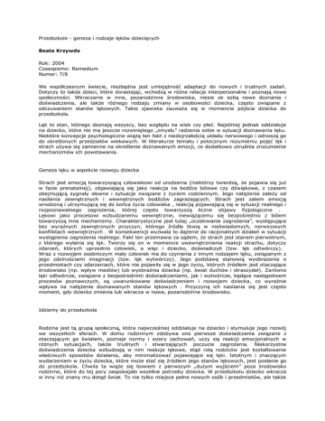 Przedszkole - geneza i rodzaje lęków dziecięcych Beata Krzywda Rok: 2004 Czasopismo: Remedium Numer: 7/8 We współczesnym świecie, niezbędna jest umiejętność adaptacji do nowych i trudnych zadań. Dotyczy to także dzieci, które dorastając, wchodzą w różne relacje interpersonalne i poznają nowe społeczności. Wkraczanie w inne, pozarodzinne środowiska, niesie ze sobą nowe doznania i doświadczenia, ale także różnego rodzaju zmiany w osobowości dziecka, często związane z odczuwaniem stanów lękowych. Takie zjawiska zauważa się w momencie pójścia dziecka do przedszkola. Lęk to stan, którego doznają wszyscy, bez względu na wiek czy płeć. Najsilniej jednak oddziałuje na dziecko, które nie ma jeszcze rozwiniętego „zmysłu” radzenia sobie w sytuacji doznawania lęku. Niektóre koncepcje psychologiczne wiążą ten fakt z niedojrzałością układu nerwowego i odnoszą go do określonych przedziałów wiekowych. W literaturze tematu i potocznym rozumieniu pojęć lęk i strach używa się zamienne na określenie doznawanych emocji, co dodatkowo utrudnia zrozumienie mechanizmów ich powstawania. Geneza lęku w aspekcie rozwoju dziecka Strach jest emocją towarzyszącą człowiekowi od urodzenia (niektórzy twierdzą, że pojawia się już w fazie prenatalnej), objawiającą się jako reakcja na bodźce bólowe czy dźwiękowe, z czasem obejmującą sygnały słowne i sytuacje związane z życiem codziennym. Jego natężenie zależy od nasilenia zewnętrznych i wewnętrznych bodźców zagrażających. Strach jest zatem emocją wrodzoną i utrzymującą się do końca życia człowieka , reakcją pojawiającą się w sytuacji realnego i rozpoznawalnego zagrożenia, której często towarzyszą liczne objawy fizjologiczne . Lękowi jako procesowi wzbudzanemu wewnętrznie, niewiążącemu się bezpośrednio z bólem towarzyszą inne mechanizmy. Charakterystyczne jest tutaj „oczekiwanie zagrożenia”, występujące bez wyraźnych zewnętrznych przyczyn, którego źródła tkwią w nieświadomych, nerwicowych konfliktach wewnętrznych . W konsekwencji wyzwala to dążenie do racjonalnych działań w sytuacji wystąpienia zagrożenia realnego. Fakt ten przemawia za sądem, że strach jest stanem pierwotnym, z którego wyłania się lęk. Tworzy się on w momencie uwewnętrznienia reakcji strachu, dotyczy zdarzeń, których uprzednio człowiek, a więc i dziecko, doświadczyli (tzw. lęk odtwórczy). Wraz z rozwojem osobniczym mały człowiek ma do czynienia z innym rodzajem lęku, związanym z jego zdolnościami imaginacji (tzw. lęk wytwórczy). Jego podstawę stanowią wyobrażenia o przedmiotach czy zdarzeniach, które nie pojawiły się w jego życiu, których źródłem jest otaczające środowisko (np. wpływ mediów) lub wyobraźnia dziecka (np. świat duchów i straszydeł). Zarówno lęki odtwórcze, związane z bezpośrednimi doświadczeniami, jak i wytwórcze, będące następstwem procesów poznawczych, są uwarunkowane doświadczeniem i rozwojem dziecka, co wyraźnie wpływa na natężenie doznawanych stanów lękowych . Przyczyną ich nasilania się jest często moment, gdy dziecko zmienia lub wkracza w nowe, pozarodzinne środowisko. Idziemy do przedszkola Rodzina jest tą grupą społeczną, która najwcześniej oddziałuje na dziecko i stymuluje jego rozwój we wszystkich sferach. W domu rodzinnym zdobywa ono pierwsze doświadczenia związane z otaczającym go światem, poznaje normy i wzory zachowań, uczy się reakcji emocjonalnych w różnych sytuacjach, także trudnych i stwarzających poczucie zagrożenia. Niekorzystne doświadczenia dziecka wzbudzają w nim reakcje lękowe, stąd rolą rodziców jest kształtowanie właściwych sposobów działania, aby minimalizować pojawiające się lęki. Istotnym i znaczącym wydarzeniem w życiu dziecka, które może stać się źródłem jego stanów lękowych, jest posłanie go do przedszkola. Chwila ta wiąże się bowiem z pierwszym „dużym wyjściem” poza środowisko rodzinne, które do tej pory zaspokajało wszelkie potrzeby dziecka. W przedszkolu dziecko wkracza w inny niż znany mu dotąd świat. To nie tylko miejsce pełne nowych osób i przedmiotów, ale także instytucja, w której musi sprostać różnym wyzwaniom np. czynnościom samoobsługowym, komunikacją z innymi, a także z wymaganiami dotyczącymi zabawy czy nauki . Lęk separacyjny i lęk przed porzuceniem Wszystkie wymienione zmiany w życiu dziecka – przedszkolaka - mogą wywołać stany emocjonalne, objawiające się tzw. lękiem separacyjnym, spowodowanym obawami przed długotrwałą rozłąką. Nowa sytuacja może być postrzegana jako stan zagrożenia naruszającego symbiotyczną więź z matką. Ta naturalna więź emocjonalna, nadwerężona z chwilą odseparowania od rodzica, występuje u wszystkich dzieci, które taką więź nawiązały. Zbyt wczesne posyłanie dzieci do przedszkola (nie mówiąc już o żłobku) potęguje odczuwanie tego rodzaju lęku, gdyż są one jeszcze niedojrzałe do zaakceptowania i znoszenia dłuższej nieobecności matki. Dziecko pozostawione w przedszkolu obawia się, że rodzice zapomną o nim i nie odbiorą na czas. Takim doznaniom towarzyszy przykry niepokój i przekonanie o tym, że na zawsze pozostanę w przedszkolu. Jest to tzw. lęk przed porzuceniem, który częściej występuje u dzieci z objawami zaburzonego funkcjonowania (w przeciwieństwie do lęku separacyjnego, którego doznają wszystkie dzieci – przypis aut.). Przyczyną wzmagającą poczucie lęku przed porzuceniem, może być obawa, że mama mnie już nie kocha, bo kazała mi tu być, spóźnia się, żeby mnie stąd zabrać, a może w ogóle o mnie zapomniała. Kolejnym powodem jest straszenie dzieci przedszkolem jako miejscem, do którego trafią za karę, bo były niegrzeczne. Przeżyte urazy z powodu zachowań rodziców sprawiają, że dziecko przedłuża rozstanie, marudzi przy porannej higienie, dłużej ni