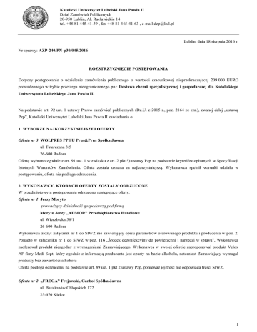 Katolicki Uniwersytet Lubelski Jana Pawła II Dział Zamówień Publicznych 20-950 Lublin, Al. Racławickie 14 tel. +48 81 445-41-59 , fax +48 81 445-41-63 , e-mail:[email protected] Lublin, dnia 18 sierpnia 2016 r. Nr sprawy: AZP-240/PN-p30/045/2016 ROZSTRZYGNIĘCIE POSTĘPOWANIA Dotyczy postępowanie o udzielenie zamówienia publicznego o wartości szacunkowej nieprzekraczającej 209 000 EURO prowadzonego w trybie przetargu nieograniczonego pn.: Dostawa chemii specjalistycznej i gospodarczej dla Katolickiego Uniwersytetu Lubelskiego Jana Pawła II. Na podstawie art. 92 ust. 1 ustawy Prawo zamówień publicznych (Dz.U. z 2015 r., poz. 2164 ze zm.), zwanej dalej „ustawą Pzp”, Katolicki Uniwersytet Lubelski Jana Pawła II zawiadamia o: 1. WYBORZE NAJKORZYSTNIEJSZEJ OFERTY Oferta nr 3 WOLPRES PPHU Prus&Prus Spółka Jawna ul. Tatarczana 3/5 26-600 Radom Ofertę wybrano zgodnie z art. 91 ust. 1 w związku z art. 2 pkt 5) ustawy Pzp na podstawie kryteriów opisanych w Specyfikacji Istotnych Warunków Zamówienia. Oferta została uznana za najkorzystniejszą. Wykonawca spełnił warunki udziału w postępowaniu, oferta nie podlega odrzuceniu. 2. WYKONAWCY, KTÓRYCH OFERTY ZOSTAŁY ODRZUCONE W przedmiotowym postępowaniu odrzucono następujące oferty: Oferta nr 1 Jerzy Moryto prowadzący działalność gospodarczą pod firmą Moryto Jerzy „ADMOR” Przedsiębiorstwo Handlowe ul. Wierzbicka 58/1 26-600 Radom Wykonawca złożył załącznik nr 1 do SIWZ nie zawierający opisu parametrów oferowanego produktu i producenta w poz. 2. Ponadto w załączniku nr 1 do SIWZ w poz. 116 „Środek dezynfekcyjny do powierzchni i narzędzi w sprayu”, Wykonawca zaoferował produkt niezgodny z wymaganiami Zamawiającego. Wykonawca w swojej ofercie zaproponował produkt Velox AF fimy Medi Sept, który zgodnie z informacją producenta jest oparty na bazie alkoholu, natomiast Zamawiający wymagał produkty bez zawartości alkoholu Oferta podlega odrzuceniu na podstawie art. 89 ust. 1 pkt 2 ustawy Pzp, ponieważ jej treść nie odpowiada treści SIWZ. Oferta nr 2 „FREGA” Frejowski, Garbol Spółka Jawna ul. Batalionów Chłopskich 172 25-670 Kielce 1 Katolicki Uniwersytet Lubelski Jana Pawła II Dział Zamówień Publicznych 20-950 Lublin, Al. Racławickie 14 tel. +48 81 445-41-59 , fax +48 81 445-41-63 , e-mail:[email protected] Wykonawca w załączniku nr 1 do SIWZ w poz. 81 „Preparat do zwalczania mrówek faraona”, Wykonawca zaoferował produkt niezgodny z wymaganiami Zamawiającego. Wykonawca w swojej ofercie zaproponował produkt proszek na mrówki fimy BROS, natomiast Zamawiający wymagał preparat służący do zwalczania mrówek faraona w postaci areozolu. Oferta podlega odrzuceniu na podstawie art. 89 ust. 1 pkt 2 ustawy Pzp, ponieważ jej treść nie odpowiada treści SIWZ 3. WYKONAWCACH, KTÓRZY ZOSTALI WYKLUCZENI Z POSTĘPOWANIA O UDZIELENIE ZAMÓWIENIA PUBLICZNEGO. W przedmiotowym postępowaniu nie wykluczono żadnego Wykonawcy. 4. UNIEWAŻNIENIU POSTĘPOWANIA O UDZIELENIE ZAMÓWIENIA Przedmiotowego postępowania nie unieważniono. Jednocześnie, informujemy że umowy zostaną podpisane zgodnie z zapisami art. 94 ust. 1 pkt 2) ustawy Pzp, a Wykonawcy o terminie zawarcia umowy zostaną powiadomieni drogą elektroniczną. Podpisano Prorektor ds. finansów i administracji Katolickiego Uniwersytetu Lubelskiego Jana Pawła II dr hab. Paweł Smoleń, prof. KUL 2 Katolicki Uniwersytet Lubelski Jana Pawła II Dział Zamówień Publicznych 20-950 Lublin, Al. Racławickie 14 tel. +48 81 445-41-59 , fax +48 81 445-41-63 , e-mail:[email protected] Załącznik nr 1 do informacji z dnia 18.08.2016 r. o rozstrzygnięciu postępowania STRESZCZENIE OCENY I PORÓWNANIA ZŁOŻONYCH OFERT Nr ofert y Nazwa i adres Wykonawcy 1 Jerzy Moryto prowadzący działalność gospodarczą pod firmą Moryto Jerzy „ADMOR” Przedsiębiorstwo Handlowe ul. Wierzbicka 58/1 26-600 Radom 2 „FREGA” Frejowski, Garbol Spółka Jawna ul. Batalionów Chłopskich 172 25-670 Kielce 3 WOLPRES PPHU Prus&Prus Spółka Jawna ul. Tatarczana 3/5 26-600 Radom Punktacja przyznana w kryterium cena 90% Punktacja przyznana w kryterium termin płatności 10% Łączna punktacja oferty Oferta nie podlega ocenie. Oferta podlega odrzuceniu na podstawie art. 89 ust. 1 pkt 2 ustawy Pzp, ponieważ jej treść nie odpowiada treści SIWZ Oferta nie podlega ocenie. Oferta podlega odrzuceniu na podstawie art. 89 ust. 1 pkt 2 ustawy Pzp, ponieważ jej treść nie odpowiada treści SIWZ 90,00 pkt 10,00 pkt 100,00 pkt Podpisano Prorektor ds. finansów i administracji Katolickiego Uniwersytetu Lubelskiego Jana Pawła II dr hab. Paweł Smoleń, prof. KUL 3