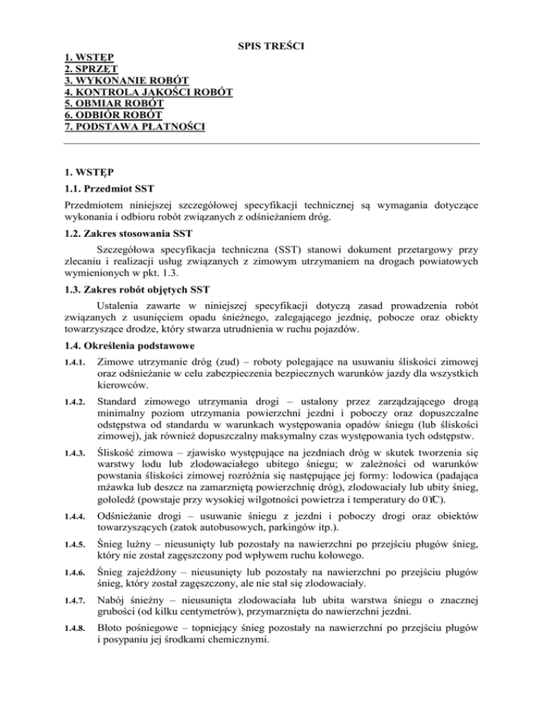 SPIS TREŚCI 1. WSTĘP 2. SPRZĘT 3. WYKONANIE ROBÓT 4. KONTROLA JAKOŚCI ROBÓT 5. OBMIAR ROBÓT 6. ODBIÓR ROBÓT 7. PODSTAWA PŁATNOŚCI 1. WSTĘP 1.1. Przedmiot SST Przedmiotem niniejszej szczegółowej specyfikacji technicznej są wymagania dotyczące wykonania i odbioru robót związanych z odśnieżaniem dróg. 1.2. Zakres stosowania SST Szczegółowa specyfikacja techniczna (SST) stanowi dokument przetargowy przy zlecaniu i realizacji usług związanych z zimowym utrzymaniem na drogach powiatowych wymienionych w pkt. 1.3. 1.3. Zakres robót objętych SST Ustalenia zawarte w niniejszej specyfikacji dotyczą zasad prowadzenia robót związanych z usunięciem opadu śnieżnego, zalegającego jezdnię, pobocze oraz obiekty towarzyszące drodze, który stwarza utrudnienia w ruchu pojazdów. 1.4. Określenia podstawowe 1.4.1. Zimowe utrzymanie dróg (zud) – roboty polegające na usuwaniu śliskości zimowej oraz odśnieżanie w celu zabezpieczenia bezpiecznych warunków jazdy dla wszystkich kierowców. 1.4.2. Standard zimowego utrzymania drogi – ustalony przez zarządzającego drogą minimalny poziom utrzymania powierzchni jezdni i poboczy oraz dopuszczalne odstępstwa od standardu w warunkach występowania opadów śniegu (lub śliskości zimowej), jak również dopuszczalny maksymalny czas występowania tych odstępstw. 1.4.3. Śliskość zimowa – zjawisko występujące na jezdniach dróg w skutek tworzenia się warstwy lodu lub zlodowaciałego ubitego śniegu; w zależności od warunków powstania śliskości zimowej rozróżnia się następujące jej formy: lodowica (padająca mżawka lub deszcz na zamarzniętą powierzchnię dróg), zlodowaciały lub ubity śnieg, gołoledź (powstaje przy wysokiej wilgotności powietrza i temperatury do 0°C). 1.4.4. Odśnieżanie drogi – usuwanie śniegu z jezdni i poboczy drogi oraz obiektów towarzyszących (zatok autobusowych, parkingów itp.). 1.4.5. Śnieg luźny – nieusunięty lub pozostały na nawierzchni po przejściu pługów śnieg, który nie został zagęszczony pod wpływem ruchu kołowego. 1.4.6. Śnieg zajeżdżony – nieusunięty lub pozostały na nawierzchni po przejściu pługów śnieg, który został zagęszczony, ale nie stał się zlodowaciały. 1.4.7. Nabój śnieżny – nieusunięta zlodowaciała lub ubita warstwa śniegu o znacznej grubości (od kilku centymetrów), przymarznięta do nawierzchni jezdni. 1.4.8. Błoto pośniegowe – topniejący śnieg pozostały na nawierzchni po przejściu pługów i posypaniu jej środkami chemicznymi. 1.4.9. Piaskarki – urządzenia służące do likwidacji śliskości zimowej. W piaskarkach możliwe jest dozowanie środków chemicznych w zależności od potrzeb w ilości od 8 do 261 g/m2. Dozowanie ustala się ręcznie w zależności od warunków panujących na drodze. Pług odśnieżny – urządzenie stanowiące osprzęt o różnej konstrukcji odkładnicy i lemiesza, nawieszone do nośnika pługa. Pługi odśnieżne (lemieszowe) dzielą się na: − lekkie – montowane na ciągnikach rolniczych i samochodach o ładowności do 6 t, − średnie – montowane na samochodach o ładowności od 6 do 8 t oraz na wszystkich samochodach o ładowności do 8 t z napędem na dwie lub więcej osi, − ciężkie – montowane na samochodach o ładowności ponad 8 t. 1.4.10. 1.4.11. Nośnik pługa – pojazd o napędzie spalinowym (samochód ciężarowy, ciągnik, maszyna drogowa), na którym zamontowano pług odśnieżny. 1.4.12. Odkładnica – urządzenie pługa, pozwalające na odsunięcie śniegu poza krawędź oczyszczonego pasa. 1.4.13. Lemiesz – część składowa pługu, należąca do korpusu płużnego, służąca do odspajania śniegu. Lemiesze mogą być stalowe oraz zakończone w dolnej części nakładkami z gumy lub tworzyw sztucznych. 1.4.14. Czołownica – płyta czołowa, stanowiąca element łączący odkładnicę i lemiesz pługa z ramą nośnika pługa. 1.4.15. Odśnieżanie interwencyjne – usuwanie śniegu na wybranych odcinkach drogi z dopuszczeniem pozostawienia na jezdni równomiernej, zajeżdżonej warstwy śniegu oraz dopuszczeniem odśnieżenia w trudnych warunkach atmosferycznych tylko jednego pasa ruchu (z mijankami co 200 - 300 m). 1.4.16. Odśnieżanie uzupełniające – odśnieżanie, polegające na usuwaniu zwałów śniegu z poboczy poza koronę drogi, pozostawionych przy odśnieżaniu patrolowym, patrolowo-interwencyjnym i interwencyjnym. 1.5. Ogólne wymagania dotyczące robót Wykonawca usług związanych z zimowym utrzymaniem dróg (zud) jest odpowiedzialny za jakość i terminowość ich wykonania, zgodność z niniejszą specyfikacją i poleceniami Zamawiającego. 1.5.1. Ochrona środowiska w czasie wykonywania robót Wykonawca ma obowiązek znać i stosować w czasie prowadzenia robót wszelkie przepisy dotyczące ochrony środowiska naturalnego. Opłaty i kary za przekroczenie w trakcie realizacji robót norm określonych w odpowiednich przepisach dotyczących ochrony środowiska obciążą Wykonawcę. 1.5.2. Ochrona własności publicznej i prywatnej Wykonawca jest zobowiązany do ochrony przed uszkodzeniem lub zniszczeniem własności publicznej lub prywatnej. W razie zniszczenia wszelkie konsekwencje ponosi Wykonawca. 1.5.3. Bezpieczeństwo i higiena pracy Podczas realizacji robót Wykonawca będzie przestrzegał przepisów dotyczących BHP. Wykonawca zapewni i będzie utrzymywał wszelkie urządzenia zabezpieczające sprzęt (piaskarki i pługi) i odpowiednią odzież dla ochrony życia i zdrowia osób zatrudnionych przy zud oraz dla bezpieczeństwa publicznego. 2. MATERIAŁY 2.1. Materiały do usuwania śliskości zimowej 2.1.1. Mieszanina piaskowo – solna – 20% 3. SPRZĘT 3.1. Ogólne wymagania dotyczące sprzętu Wykonawca jest zobowiązany do używania sprzętu zgodnie z ofertą Wykonawcy i powinien odpowiadać pod względem typów i ilości wskazaniom w SST. Pracujący sprzęt nie może mieć negatywnego wpływu na jako