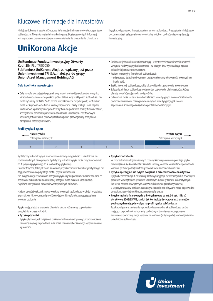 str. 1-2 Kluczowe informacje dla Inwestorów Niniejszy dokument zawiera Kluczowe informacje dla Inwestorów dotyczące tego subfunduszu. Nie są to materiały marketingowe. Dostarczanie tych informacji jest wymogiem prawnym mającym na celu ułatwienie zrozumienia charakteru i ryzyka związanego z inwestowaniem w ten subfundusz. Przeczytanie niniejszego dokumentu jest zalecane Inwestorowi, aby mógł on podjąć świadomą decyzję inwestycyjną. UniKorona Akcje UniFundusze Fundusz Inwestycyjny Otwarty Kod ISIN PLUITFI00050 Subfundusz UniKorona Akcje zarządzany jest przez Union Investment TFI S.A., należącą do grupy Union Asset Management Holding AG • Posiadacze jednostek uczestnictwa mogą – z zastrzeżeniem zawieszenia umorzeń w wyniku nadzwyczajnych okoliczności – w każdym dniu wyceny złożyć żądanie odkupienia jednostek uczestnictwa. • Poziom referencyjny (benchmark subfunduszu): – od początku działalności wzorcem służącym do oceny efektywności inwestycji jest indeks WIG. • Zyski z inwestycji subfunduszu, takie jak dywidendy, są ponownie inwestowane. • Zalecenie: niniejszy subfundusz może nie być odpowiedni dla Inwestorów, którzy planują wycofać swoje środki w ciągu 5 lat. • Subfundusz może także w swoich działaniach inwestycyjnych stosować instrumenty pochodne zarówno w celu ograniczenia ryzyka inwestycyjnego, jak i w celu zapewnienia sprawnego zarządzania portfelem inwestycyjnym. Cele i polityka inwestycyjna • Celem subfunduszu jest długoterminowy wzrost wartości jego aktywów w wyniku lokat subfunduszu w akcje polskich spółek. Udział akcji w aktywach subfunduszu nie może być niższy niż 60%. Są to przede wszystkim akcje dużych spółek, subfundusz może też kupować akcje firm o średniej kapitalizacji. Lokaty w akcje i inne papiery wartościowe są dokonywane przede wszystkim na podstawie analizy fundamentalnej, szczególnie w przypadku papierów o charakterze udziałowym. Podstawowym kryterium jest określenie rynkowej i technologicznej przewagi firmy oraz jakości zarządzania przedsiębiorstwem. Profil ryzyka i zysku Niższe ryzyko Wyższe ryzyko Potencjalnie niższy zysk Potencjalnie wyższy zysk 1 2 3 Syntetyczny wskaźnik ryzyka stanowi miarę zmiany ceny jednostki uczestnictwa na podstawie danych historycznych. Syntetyczny wskaźnik ryzyka może przybierać wartości od 1 (najmniej ryzykowny) do 7 (najbardziej ryzykowny). Dane historyczne, takie jak dane stosowane przy obliczaniu wskaźnika syntetycznego, nie dają pewności co do przyszłego profilu ryzyka subfunduszu. Nie ma gwarancji, że wskazana kategoria ryzyka i zysku pozostanie niezmienna oraz że przypisanie subfunduszu do określonej kategorii może z czasem ulec zmianie. Najniższa kategoria nie oznacza inwestycji wolnych od ryzyka. Nadany powyżej wskaźnik ryzyka wynika z inwestycji subfunduszu w akcje i w związku z tym faktem historyczna zmienność ceny jednostki subfunduszu pozostawała na wysokim poziomie. Ryzyka mające istotne znaczenie dla subfunduszu, które nie są odpowiednio uwzględnione przez wskaźnik: • Ryzyko płynności Ryzyko płynności jest związane z brakiem możliwości efektywnego przeprowadzenia transakcji mającej za przedmiot instrument finansowy bez istotnego wpływu na cenę jej realizacji. 4 5 6 7 • Ryzyko kontrahenta W przypadku transakcji zawieranych poza rynkiem regulowanym powstaje ryzyko niewywiązania się kontrahenta z zawartej umowy, co może w rezultacie spowodować wahania (w tym spadek) wartości jednostek uczestnictwa subfunduszu. • Ryzyko operacyjne lub ryzyko związane z przechowywaniem aktywów Ryzyko bezpośredniej lub pośredniej straty wynikającej z niewłaściwych lub zawodnych procesów wewnętrznych systemów kontrolnych, ludzi i systemów informatycznych lub też ze zdarzeń zewnętrznych. Aktywa subfunduszu przechowywane są u Depozytariusza i w bankach. Nienależyta kontrola nad aktywami może doprowadzić do wahania ceny jednostki uczestnictwa subfunduszu. • Ryzyko technik finansowych, o których mowa w art. 50 ust. 1 lit. g) dyrektywy 2009/65/WE, takich jak kontrakty dotyczące instrumentów pochodnych mających wpływ na profil ryzyka subfunduszu Ryzyka związane z zawieraniem przez fundusz na rachunek subfunduszu umów mających za przedmiot instrumenty pochodne, w tym niewystandaryzowane instrumenty pochodne, mogą wpływać na wahania (w tym spadki) wartości jednostek uczestnictwa subfunduszu. str. 2-2 Kluczowe informacje dla Inwestorów UniKorona Akcje Opłaty • Opłaty ponoszone przez Inwestora służą pokryciu kosztów związanych z działalnością subfunduszu, w tym kosztów dystrybucji i kosztów wprowadzenia do obrotu. • Opłaty te zmniejszają potencjalny wzrost inwestycji. • Wszystkie opłaty podawane są w wysokości maksymalnej. W niektórych przypadkach Inwestor może płacić niższą opłatę. Informacje dotyczące bieżącej wysokości opłat można uzyskać w placówkach dystrybutorów oraz w Punkcie Obsługi Klienta TFI. • Wartość liczbowa określająca wysokość opłat bieżących opiera się na wydatkach z roku 2012, w związku z czym wysokość opłat bieżących może co roku ulegać zmianie. • Szczegółowe zasady dotyczące opłat znajdują się w prospekcie informacyjnym UniFunduszeFIO w pkt. 40. Prospekt informacyjny jest dostępny na stronie internetowej www.union-investment.pl. • W przypadku tego subfunduszu opłata za wyniki nie jest pobierana. Opłaty jednorazowe pobierane przed lub po dokonaniu inwestycji Opłata za nabycie jednostek uczestnictwa 5% Opłata za odkupienie jednostek uczestnictwa 5% Jest to maksymalna kwota, jaka może zostać pobrana z Państwa środków przed zainwestowaniem/przed wypłaceniem zysków z inwestycji. Opłaty pobierane z funduszu w ciągu roku 4,03% Opłaty pobierane z funduszu w określonych warunkach szczególnych 0% Wyniki historyczne obliczone zostały na podstawie zmiany wartości aktywów netto na j