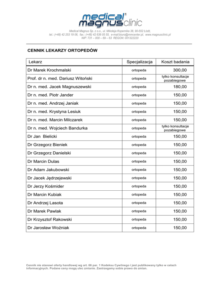 Medical Magnus Sp. z o.o., ul. Mikołaja Kopernika 38, 90-552 Łódź, tel.: (+48) 42 253 19 06, fax.: (+48) 42 636 05 55, e-mail:[email protected], www.magnusclinic.pl NIP: 731 – 000 – 69 – 63 REGON: 001322220 __________________________________________________________________________________ CENNIK LEKARZY ORTOPEDÓW Lekarz Specjalizacja Koszt badania Dr Marek Krochmalski ortopeda 300,00 Prof. dr n. med. Dariusz Witoński ortopeda Dr n. med. Jacek Magnuszewski ortopeda 180,00 Dr n. med. Piotr Jander ortopeda 150,00 Dr n. med. Andrzej Janiak ortopeda 150,00 Dr n. med. Krystyna Lesiuk ortopeda 150,00 Dr n. med. Marcin Milczarek ortopeda 150,00 Dr n. med. Wojciech Bandurka ortopeda Dr Jan Bielicki ortopeda 150,00 Dr Grzegorz Bieniek ortopeda 150,00 Dr Grzegorz Danielski ortopeda 150,00 Dr Marcin Dulas ortopeda 150,00 Dr Adam Jakubowski ortopeda 150,00 Dr Jacek Jędrzejewski ortopeda 150,00 Dr Jerzy Kośmider ortopeda 150,00 Dr Marcin Kubiak ortopeda 150,00 Dr Andrzej Lasota ortopeda 150,00 Dr Marek Pawlak ortopeda 150,00 Dr Krzysztof Rakowski ortopeda 150,00 Dr Jarosław Woźniak ortopeda 150,00 tylko konsultacje pozabiegowe tylko konsultacje pozabiegowe Cennik nie stanowi oferty handlowej wg art. 66 par. 1 Kodeksu Cywilnego i jest publikowany tylko w celach informacyjnych. Podane ceny mogą ulec zmianie. Zastrzegamy sobie prawo do zmian. Medical Magnus Sp. z o.o., ul. Mikołaja Kopernika 38, 90-552 Łódź, tel.: (+48) 42 253 19 06, fax.: (+48) 42 636 05 55, e-mail:[email protected], www.magnusclinic.pl NIP: 731 – 000 – 69 – 63 REGON: 001322220 __________________________________________________________________________________ CENNIK LEKARZY ORTOPEDÓW KONSULTACJE DO LECZENIA KOMÓRKAMI MACIERZYSTYMI Dr n. med. Marcin Milczarek ortopeda 200,00 Dr Jan Bielicki ortopeda 200,00 Po zabiegu podania komórek macierzystych dwie pierwsze konsultacje w cenie 100,00 zł. Wszystkie kolejne konsultacje według aktualnego cennika. Cennik nie stanowi oferty handlowej wg art. 66 par. 1 Kodeksu Cywilnego i jest publikowany tylko w celach informacyjnych. Podane ceny mogą ulec zmianie. Zastrzegamy sobie prawo do zmian.