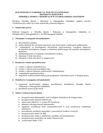 OGŁOSZENIE O NABORZE NA WOLNE STANOWISKO REFERENT KSIEGOWY OŚRODKA SPORTU I REKREACJI W STAROGARDZIE GDAŃSKIM Dyrektor Ośrodka Sportu i Rekreacji w Starogardzie Gdańskim ogłasza otwarty i konkurencyjny nabór na wolne stanowisko referent księgowy. 1. Stanowisko pracy: Referent księgowy w Ośrodku Sportu i Rekreacji w Starogardzie Gdańskim ul. Olimpijczyków Starogardzkich 1, 83-200 Starogard Gdański. 2. Niezbędne wymagania od kandydatów: 1) obywatelstwo polskie, 2) pełna zdolność do czynności prawnych oraz korzystanie z pełni praw publicznych, 3) niekaralność za przestępstwa stwierdzone prawomocnym wyrokiem sądowym za umyślne przestępstwo ścigane z oskarżenia publicznego lub umyślne przestępstwo skarbowe, 4) udokumentowane co najmniej wykształcenie średnie, 5) minimum 5 letni staż pracy, 6) minimum 3 letni staż pracy w księgowości. 3. Konieczna wiedza specjalistyczna: 1) 2) 3) 4) 5) wiedza z zakresu rachunkowości, wiedza z zakresu prawa podatkowego, wiedza z zakresu finansów publicznych i administracji, umiejętność organizacji pracy, znajomość wykorzystania biurowych programów informatycznych w bieżącej pracy. 4. Dodatkowe wymagania od kandydatów 1) znajomość problematyki będącej przedmiotem i Rekreacji w Starogardzie Gdańskim, 2) posiadanie prawa jazdy kat.B. działalności Ośrodka Sportu 5. Zakres wykonywanych zadań: przygotowanie dokumentów pod względem formalnym do księgowania, przygotowanie operacji bankowych, ujmowanie dekretów w system FK Symfonia, upinanie zaksięgowanych dokumentów, regularna weryfikacja kont rozrachunkowych w celu terminowej windykacji należności, prowadzenie ewidencji materiałów i pozostałych środków trwałych, przygotowanie umów do BIP, przygotowanie zmian w deklaracji o podatku od nieruchomości, przygotowanie materiałów do analiz finansowych, wystawianie faktur VAT. 6. Warunki pracy na danym stanowisku: 1) wymiar czasu pracy – 1 etat, 2) praca przy komputerze, 3) pierwsza umowa zawarta będzie na czas określony maksymalnie do 5 miesięcy w pełnym wymiarze czasu pracy – 40 godzin tygodniowo, 4) przewidywany termin zatrudnienia: czerwiec 2016 r. 7. Wnioski składane przez kandydatów muszą zawierać: 1) podanie z uzasadnieniem ubiegania się o stanowisko referent księgowy w Ośrodku Sportu i Rekreacji w Starogardzie Gdańskim, 2) podpisany życiorys (CV), 3) kwestionariusz osobowy, 4) kserokopie dokumentów potwierdzających wykształcenie i kwalifikacje zawodowe, 5) kserokopie świadectw pracy, 6) podpisane oświadczenie, że kandydat nie był skazany prawomocnym wyrokiem sądu za umyślne przestępstwo ścigane z oskarżenia publicznego lub umyślne przestępstwo skarbowe, 7) podpisane oświadczenie o braku przeciwwskazań zdrowotnych do wykonywania pracy na danym stanowisku, 8) podpisane oświadczenie o pełnej zdolności do czynności prawnych oraz korzystaniu w pełni praw publicznych, 9) podpisana klauzula o treści „Wyrażam zgodę na przetwarzanie moich danych osobowych zawartych w ofercie pracy dla potrzeb rekrutacji, zgodnie z ustawą z dnia 29 sierpnia 1997 r. o ochronie danych osobowych (Dz. U. z 2014 r. poz. 1182 z późn. zm.)”. 8. Wymagane dokumenty należy składać na adres: Ośrodek Sportu i Rekreacji ul. Olimpijczyków Starogardzkich 1 83-200 Starogard Gdański w zamkniętej kopercie z dopiskiem „Dotyczy naboru na stanowisko „Referent księgowy w Ośrodku Sportu i Rekreacji w Starogardzie Gdańskim” w nieprzekraczalnym terminie do dnia 01.06.2016 r. do godz. 1200 (decyduje data i godzina wpływu). Warunkiem dopuszczenia oferty do procedury konkursowej jest spełnienie wymagań określonych w ogłoszeniu o konkursie. 9. Osobą uprawnioną do udzielania informacji na temat konkursu jest Pani Iwona Trocha codziennie w godzinach pracy OSiR w siedzibie przy ul. Olimpijczyków Starogardzkich1 – Gł.Księgowa OSiR, pod nr tel. 58 56-221-20, lub drogą elektroniczną: [email protected] 10. Termin składania wniosków – od 18.05.2016 r. do 01.06.2016 r. 11. Dokumenty, które wpłyną do Ośrodka Sportu i Rekreacji po wyżej określonym terminie nie będą rozpatrywane. Dyrektor Ośrodka Sportu i Rekreacji w Starogardzie Gdańskim zastrzega sobie prawo przedłużenia terminu składania ofert. Informacja o wyniku naboru będzie umieszczona na stronie internetowej www.osir.com.pl oraz na tablicy informacyjnej Ośrodka Sportu i Rekreacji w Starogardzie Gdańskim.