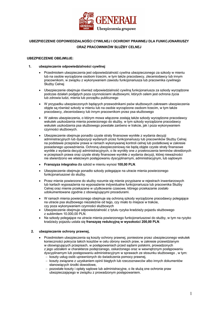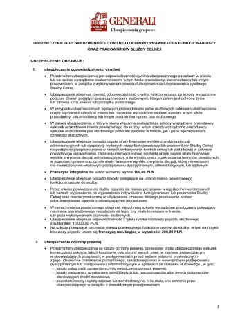 UBEZPIECZENIE ODPOWIEDZIALNOŚCI CYWILNEJ I OCHRONY PRAWNEJ DLA FUNKCJONARIUSZY ORAZ PRACOWNIKÓW SŁUŻBY CELNEJ UBEZPIECZENIE OBEJMUJE: 1. ubezpieczenie odpowiedzialności cywilnej · Przedmiotem ubezpieczenia jest odpowiedzialność cywilna ubezpieczonego za szkody w mieniu lub na osobie wyrządzone osobom trzecim, w tym także pracodawcy, zleceniodawcy lub innym pracownikom, w związku z wykonywaniem zawodu funkcjonariusza lub pracownika cywilnego Służby Celnej · Ubezpieczenie obejmuje również odpowiedzialność cywilną funkcjonariusza za szkody wyrządzone podczas działań podjętych poza czynnościami służbowymi, których celem jest ochrona życia lub zdrowia ludzi, mienia lub porządku publicznego · W przypadku ubezpieczonych będących przewodnikami psów służbowych zakresem ubezpieczenia objęte są również szkody w mieniu lub na osobie wyrządzone osobom trzecim, w tym także pracodawcy, zleceniodawcy lub innym pracownikom przez psa służbowego · W zakres ubezpieczenia, o którym mowa włączone zostają także szkody wyrządzone pracodawcy wskutek uszkodzenia mienia powierzonego do służby, w tym szkody wyrządzone pracodawcy wskutek uszkodzenia psa służbowego powstałe zarówno w trakcie, jak i poza wykonywaniem czynności służbowych. · Ubezpieczenie obejmuje ponadto czyste straty finansowe wynikłe z wydania decyzji administracyjnych lub dyspozycji wydanych przez funkcjonariuszy lub pracowników Służby Celnej na podstawie przepisów prawa w ramach wykonywanej kontroli celnej lub podatkowej w zakresie posiadanego upoważnienia. Ochroną ubezpieczeniową nie będą objęte czyste straty finansowe wynikłe z wydania decyzji administracyjnych, o ile wynikły one z przekroczenia terminów określonych w przepisach prawa oraz czyste straty finansowe wynikłe z wydania decyzji, której nieważności nie stwierdzono we właściwym postępowaniu dyscyplinarnym, administracyjnym, lub sądowym · Franszyza integralna dla szkód w mieniu wynosi 100,00 PLN. · Ubezpieczenie obejmuje ponadto szkody polegające na utracie mienia powierzonego funkcjonariuszowi do służby. · Przez mienie powierzone do służby rozumie się mienie przypisane w rejestrach inwentarzowych lub kartach wyposażenia na wyposażenie indywidualne funkcjonariusza lub pracownika Służby Celnej oraz mienie przekazane w użytkowanie czasowe, którego przekazanie zostało udokumentowane zgodnie z obowiązującymi procedurami. · W ramach mienia powierzonego obejmuje się ochroną szkody wyrządzone pracodawcy polegające na utracie psa służbowego niezależnie od tego, czy miało to miejsce w trakcie, czy poza wykonywaniem czynności służbowych Ubezpieczenie obejmuje odpowiedzialność z tytułu ryzyka kradzieży pojazdu służbowego z sublimitem 10.000,00 PLN. Na szkody polegające na utracie mienia powierzonego funkcjonariuszowi do służby, w tym na ryzyko kradzieży pojazdu ustala się franszyzę redukcyjną w wysokości 200,00 PLN. · · 2. ubezpieczenie ochrony prawnej, · Przedmiotem ubezpieczenia są koszty ochrony prawnej, poniesione przez ubezpieczonego wskutek konieczności pokrycia takich kosztów w celu obrony swoich praw, w zakresie przewidzianym w obowiązujących przepisach, w postępowaniach przed sądami polskimi, prowadzonych z jego udziałem w charakterze podejrzanego, oskarżonego oraz w wewnętrznym postępowaniu dyscyplinarnym lub postępowaniu administracyjnym w sprawach ze stosunku służbowego , w tym: - koszty usług osób uprawnionych do świadczenia pomocy prawnej, - koszty związane z uzyskaniem opinii biegłych lub rzeczoznawców albo innych dokumentów stanowiących środki dowodowe, - pozostałe koszty i opłaty sądowe lub administracyjne, o ile służą one ochronie praw ubezpieczającego w związku z prowadzonym postępowaniem. 1 3. ubezpieczenie na wypadek zawieszenia w czynnościach służbowych. · Ubezpieczenie obejmuje wypłatę funkcjonariuszowi świadczenia w przypadku zawieszenia go w pełnieniu czynności służbowych na skutek wszczęcia w okresie ubezpieczenia postępowania z jego udziałem w charakterze podejrzanego, oskarżonego oraz w wewnętrznym postępowaniu dyscyplinarnym lub administracyjnym ze stosunku służbowego, o ile wiązało się to z wstrzymaniem wypłaty wynagrodzenia w całości lub części. Świadczenie wypłacane jest w ratach miesięcznych równych wysokości wstrzymanego uposażenia. Świadczenie wypłacane jest przez cały okres zawieszenia do wyczerpania sumy ubezpieczenia przewidzianej na to ryzyko. W razie wszczęcia wobec ubezpieczonego postępowania karnego w związku z podejrzeniem popełnienia przez niego czynu niedozwolonego, Ubezpieczyciel w ramach udzielonej ochrony dotyczącej ubezpieczenia, , pokrywa koszty poręczenia majątkowego zastosowanego przez sąd lub prokuraturę, jako środek zapobiegawczy wobec ubezpieczonego na podstawie art. 257 kodeksu postępowania karnego, do kwoty 15.000,00 PLN. Ochrona ubezpieczeniowa, o której mowa w ust. 1 nie obejmuje kosztów poręczenia majątkowego, jeżeli zaistniały one w pierwszym miesiącu ochrony ubezpieczeniowej. · Sumy ubezpieczenia oraz składki WARIANT 1 WARIANT 2 10.000 zł 5.000 zł 10.000 zł 10,00 zł 15.000 zł 5.000 zł 10.000 zł 14,00 zł WARIANT 1 WARIANT 2 Adwokat Koszt poręcznia – kwota niezależna Składka 10.000 zł 15.000 zł 2,00 zł 20.000 zł 20.000 zł 4,00 zł Świadczenie w przypadku zawieszenia 10.000,- bezzwrotne UBEZPIECZENIE OC Suma gwarancyjna Ryzyko utraty mienia Ryzyko utraty pojazdu służbowego Składka OCHRONA PRAWNA 4,00 zł Składka *Warunkiem wykupienia opcji ochrony prawnej i świadczenia w przypadku zawieszenia jest wykupienie ubezpieczenia odpowiedzialności cywilnej. Ubezpieczenie może zostać rozszerzone o opcje NNW, w wariancie pełnym – całodobowym lub ograniczonym do czasu służby, wg poniższych warunków: SUMY UBEZPIECZENIA ZAKRES UBEZPIECZENIA PEŁNY WARIANT I WARIANT II OGRANICZONY WARIANT III WARIANT IV 