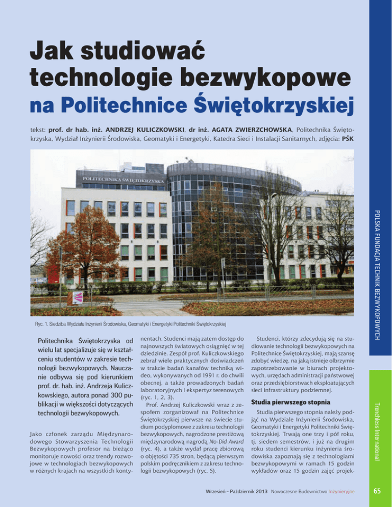 Materiały SOPOT Jak studiować technologie bezwykopowe na Politechnice Świętokrzyskiej tekst: prof. dr hab. inż. ANDRZEJ KULICZKOWSKI, dr inż. AGATA ZWIERZCHOWSKA, Politechnika Świętokrzyska, Wydział Inżynierii Środowiska, Geomatyki i Energetyki, Katedra Sieci i Instalacji Sanitarnych, zdjęcia: PŚK Jako członek zarządu Międzynarodowego Stowarzyszenia Technologii Bezwykopowych profesor na bieżąco monitoruje nowości oraz trendy rozwojowe w technologiach bezwykopowych w różnych krajach na wszystkich konty- nentach. Studenci mają zatem dostęp do najnowszych światowych osiągnięć w tej dziedzinie. Zespół prof. Kuliczkowskiego zebrał wiele praktycznych doświadczeń w trakcie badań kanałów techniką wideo, wykonywanych od 1991 r. do chwili obecnej, a także prowadzonych badań laboratoryjnych i ekspertyz terenowych (ryc. 1, 2, 3). Prof. Andrzej Kuliczkowski wraz z zespołem zorganizował na Politechnice Świętokrzyskiej pierwsze na świecie studium podyplomowe z zakresu technologii bezwykopowych, nagrodzone prestiżową międzynarodową nagrodą No-Did Award (ryc. 4), a także wydał pracę zbiorową o objętości 735 stron, będącą pierwszym polskim podręcznikiem z zakresu technologii bezwykopowych (ryc. 5). Studenci, którzy zdecydują się na studiowanie technologii bezwykopowych na Politechnice Świętokrzyskiej, mają szansę zdobyć wiedzę, na jaką istnieje olbrzymie zapotrzebowanie w biurach projektowych, urzędach administracji państwowej oraz przedsiębiorstwach eksploatujących sieci infrastruktury podziemnej. Studia pierwszego stopnia Studia pierwszego stopnia należy podjąć na Wydziale Inżynierii Środowiska, Geomatyki i Energetyki Politechniki Świętokrzyskiej. Trwają one trzy i pół roku, tj. siedem semestrów, i już na drugim roku studenci kierunku inżynieria środowiska zapoznają się z technologiami bezwykopowymi w ramach 15 godzin wykładów oraz 15 godzin zajęć projek- Wrzesień – Październik 2013 Nowoczesne Budownictwo Inżynieryjne Trenchless International Politechnika Świętokrzyska od wielu lat specjalizuje się w kształceniu studentów w zakresie technologii bezwykopowych. Nauczanie odbywa się pod kierunkiem prof. dr. hab. inż. Andrzeja Kuliczkowskiego, autora ponad 300 publikacji w większości dotyczących technologii bezwykopowych. Polska Fundacja TechNik Bezwykopowych Ryc. 1. Siedziba Wydziału Inżynierii Środowiska, Geomatyki i Energetyki Politechniki Świętokrzyskiej 65 SOPOT Materiały Ryc. 2. Studenci studium podyplomowego Technologie bezwykopowe w inżynierii środowiska w czasie pokazu technologii utwardzanych in situ powłok żywicznych Polska Fundacja TechNik Bezwykopowych Trenchless International 66 towych z przedmiotu techniki bezwykopowe. Natomiast w ramach przedmiotu infrastruktura podziemna miast prezentowane są zagadnienia bezwykopowych metod układania sieci i kabli w istniejącej infrastrukturze podziemnej oraz tuneli wieloprzewodowych. Dodatkowo studenci nabywają wiedzę z trzech przedmiotów powiązanych z technologiami bezwykopowej budowy, tj. hydrauliki, wodociągów, kanalizacji, na których to poznają zasady m.in. hydraulicznego projektowania przewodów podziemnych. W ramach przedmiotów mechanika gruntów oraz geotechnika studenci uczą się o pracy ośrodka gruntowego, m.in. do projektowania i budowy przewodów podziemnych. Z technologiami bezwykopowymi zapoznają się również studenci pierwszego stopnia studiów niestacjonarnych. Na specjalności sieci i instalacje sanitarne zagadnienia technologii bezwykopowych realizowane są w ramach przedmiotów: technologie bezwykopowe, budownictwo sanitarne, infrastruktura podziemna miast. Tu prezentowane są zagadnienia z zakresu bezwykopowej budowy i odnowy przewodów podziemnych, bezwykopowych metod układania kabli w istniejącej infrastrukturze podziemnej, tuneli wieloprzewodowych oraz budowy przepustów, tuneli drogowych, kolejowych i metra. Studenci wykonują również wybrane elementy projektu kanału sanitarnego wbudowanego bezwykopowo. Studia drugiego stopnia Po zakończeniu studiów pierwszego stopnia i uzyskaniu tytułu inżyniera inżynierii środowiska absolwenci mogą kontynuować naukę na tym samym wydziale na studiach drugiego stopnia. Na studia te mogą również aplikować absolwenci innych uczelni z odpowiednim tytułem inżyniera. Studia drugiego stopnia obejmują trzy semestry nauki i kończą się obroną pracy dyplomowej magisterskiej oraz egzaminem dyplomowym. Aby studiować zagadnienia związane z technologiami bezwykopowymi, należy wybrać specjalność sieci i instalacje sanitarne (na kierunku inżynieria środowiska). Wśród przedmiotów realizowanych na studiach magisterskich tejże specjalności i dotyczących technologii bezwykopowych są: bezwykopowa budowa sieci, odnowa sieci, metody badań rurociągów, tunelowanie i metody tarczowe, New Techniques and Materials in Trenchless Technology (nowe techniki i materiały w technologiach bezwykopowych). Bezwykopowa budowa sieci obejmuje 30 godzin wykładów, 15 godzin projektowania, 15 godzin ćwiczeń oraz 15 godzin laboratorium. Studenci zapoznają się z technologiami, urządzeniami, materiałami stosowanymi w bezwykopo- Nowoczesne Budownictwo Inżynieryjne Wrzesień Wrzesień––Październik Październik2013 2013 wej budowie przewodów podziemnych, a także z zasadami optymalnego doboru tych technologii oraz ekonomicznych aspektów ich stosowania. Na ćwiczeniach projektowych uczą się projektować przewody podziemne wbudowywane metodami bezwykopowymi, m.in. poznają zasady obliczania siły przecisku dla metod z grupy przecisków hydraulicznych oraz siły wciągania dla technologii horyzontalnych przewiertów sterowanych, a także zasady projektowania trajektorii przewiertów sterowanych. Tunelowanie i metody tarczowe realizowane są w wymiarze 15 godzin ćwiczeń, kiedy to studenci zapoznają się z bezwykopowymi technologiami budowy tuneli podziemnych