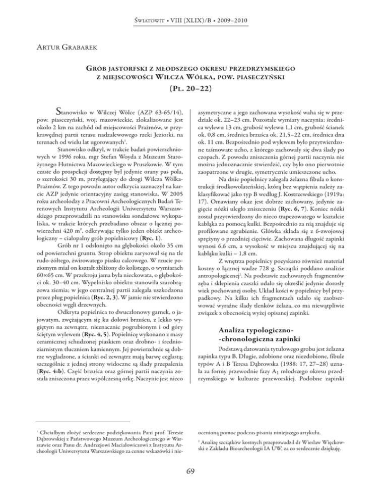 śWIAToWIT • VIII (XLIX)/B • 2009–2010 ARTUR GRABAREK GRóB JASToRfSKi Z MŁoDSZEGo oKRESu PRZEDRZyMSKiEGo Z MiEJSCoWośCi WiLCZA WóLKA , PoW. PiASECZyńSKi (PL. 20–22) S tanowisko w Wilczej Wólce (AZP 63-65/14), pow. piaseczyński, woj. mazowieckie, zlokalizowane jest około 2 km na zachód od miejscowości Prażmów, w przykrawędnej partii terasu nadzalewowego rzeki Jeziorki, na terenach od wielu lat ugorowanych1. Stanowisko odkrył, w trakcie badań powierzchniowych w 1996 roku, mgr Stefan Woyda z Muzeum Starożytnego hutnictwa Mazowieckiego w Pruszkowie. W tym czasie do prospekcji dostępny był jedynie orany pas pola, o szerokości 30 m, przylegający do drogi Wilcza WólkaPrażmów. Z tego powodu autor odkrycia zaznaczył na karcie AZP jedynie orientacyjny zasięg stanowiska. W 2005 roku archeolodzy z Pracowni Archeologicznych Badań Terenowych Instytutu Archeologii Uniwersytetu Warszawskiego przeprowadzili na stanowisku sondażowe wykopaliska, w trakcie których przebadano obszar o łącznej powierzchni 420 m², odkrywając tylko jeden obiekt archeologiczny – ciałopalny grób popielnicowy (Ryc. 1). Grób nr 1 odsłonięto na głębokości około 35 cm od powierzchni gruntu. Strop obiektu zarysował się na tle rudo-żółtego, żwirowatego piasku calcowego. W rzucie poziomym miał on kształt zbliżony do kolistego, o wymiarach 60×65 cm. W przekroju jama była nieckowata, o głębokości ok. 30–40 cm. Wypełnisko obiektu stanowiła szarobrązowa ziemia; w jego centralnej partii zalegała uszkodzona przez pług popielnica (Ryc. 2, 3). W jamie nie stwierdzono obecności węgli drzewnych. odkryta popielnica to dwuczłonowy garnek, o jajowatym, zwężającym się ku dołowi brzuścu, z lekko wygiętym na zewnątrz, nieznacznie pogrubionym i od góry ściętym wylewem (Ryc. 4, 5). Popielnicę wykonano z masy ceramicznej schudzonej piaskiem oraz drobno- i średnioziarnistym tłuczniem kamiennym. Jej powierzchnie są dobrze wygładzone, a ścianki od zewnątrz mają barwę ceglastą; szczególnie z jednej strony widoczne są ślady przepalenia (Ryc. 4:b). część brzuśca oraz górnej partii naczynia została zniszczona przez współczesną orkę. Naczynie jest nieco asymetryczne a jego zachowana wysokość waha się w przedziale ok. 22–23 cm. Pozostałe wymiary naczynia: średnica wylewu 13 cm, grubość wylewu 1,1 cm, grubość ścianek ok. 0,8 cm, średnica brzuśca ok. 21,5–22 cm, średnica dna ok. 11 cm. Bezpośrednio pod wylewem było przytwierdzone taśmowate ucho, z którego zachowały się dwa ślady po czopach. Z powodu zniszczenia górnej partii naczynia nie można jednoznacznie stwierdzić, czy było ono pierwotnie zaopatrzone w drugie, symetrycznie umieszczone ucho. Na dnie popielnicy zalegała żelazna fibula o konstrukcji środkowolateńskiej, którą bez wątpienia należy zaklasyfikować jako typ B według J. Kostrzewskiego (1919a: 17). omawiany okaz jest dobrze zachowany, jedynie zagięcie nóżki uległo zniszczeniu (Ryc. 6, 7). Koniec nóżki został przytwierdzony do nieco trapezowatego w kształcie kabłąka za pomocą kulki. Bezpośrednio za nią znajduje się profilowane zgrubienie. Główka składa się z 6-zwojowej sprężyny o przedniej cięciwie. Zachowana długość zapinki wynosi 6,6 cm, a wysokość w miejscu znajdującej się na kabłąku kulki – 1,8 cm. Z wnętrza popielnicy pozyskano również materiał kostny o łącznej wadze 728 g. Szczątki poddano analizie antropologicznej2. Na podstawie zachowanych fragmentów zęba i sklepienia czaszki udało się określić jedynie dorosły wiek pochowanej osoby. Układ kości w popielnicy był przypadkowy. Na kilku ich fragmentach udało się zaobserwować wyraźne ślady tlenków żelaza, co ma niewątpliwie związek z obecnością wyżej opisanej zapinki. Analiza typologiczno-chronologiczna zapinki Podstawą datowania tytułowego grobu jest żelazna zapinka typu B. Długie, zdobione oraz niezdobione, fibule typów A i B Teresa Dąbrowska (1988: 17, 27–28) uznała za formy przewodnie fazy A1 młodszego okresu przedrzymskiego w kulturze przeworskiej. Podobne zapinki 1 ocenioną pomoc podczas pisania niniejszego artykułu. chciałbym złożyć serdeczne podziękowania Pani prof. Teresie Dąbrowskiej z Państwowego Muzeum Archeologicznego w Warszawie oraz Panu dr. Andrzejowi Maciałowiczowi z Instytutu Archeologii Uniwersytetu Warszawskiego za cenne wskazówki i nie- 2 Analizę szczątków kostnych przeprowadził dr Wiesław Więckowski z Zakładu Bioarcheologii IA UW, za co serdecznie dziękuję. 69 ARTUR GRABAREK zespołu – autor publikacji sugeruje szersze ramy czasowe, obejmujące koniec LT c lub nawet początki LT D (BELJAVEc 2001: 49). Spośród przedstawionych przez Beljavca zabytków analogicznych dla fibuli z Radości Kamienieckiej, a wykazujących też podobieństwa do zapinki z Wilczej Wólki, na uwagę zasługują znaleziska z Drozdowa, pow. płoński, i Reginowa, pow. warszawski zachodni (BELJAVEc 2001: 50, ryc. 4:b,c). oba te okazy – podobnie jak zabytek z Białorusi – należy zaliczyć do wariantu 13c według Gebharda (1991: 15, ryc. 5). Wszystkie one wykazują podobieństwa do okazu z Wilczej Wólki w sposobie ukształtowania kabłąka (zbliżonego do trapezu) i mocowania odgiętej nóżki za pomocą dużej kulki, a także poprzez obecność wielozwojowej sprężyny. Natomiast odmienny jest charakter ich zdobienia, w postaci małej kulki bezpośrednio za dużą kulka (obejmą). Zapinki te, określone przez Beljavca jako typ Radość-Kujawki, produkowane były w oparciu o wzorce celtyckie, na obszarze objętym we wczesnej fazie młodszego okresu przedrzymskiego procesem kształtowania się kultury przeworskiej. Przy czym badacz ten nie odrzuca możliwości, że były one dziełem rzemieślników celtyckich. Podsumowując można stwierdzić, że długie, zdobione zapinki typu B według Kostrzewskiego, odpowiadające definicji wariantu 13b według Gebharda, wywodzą si