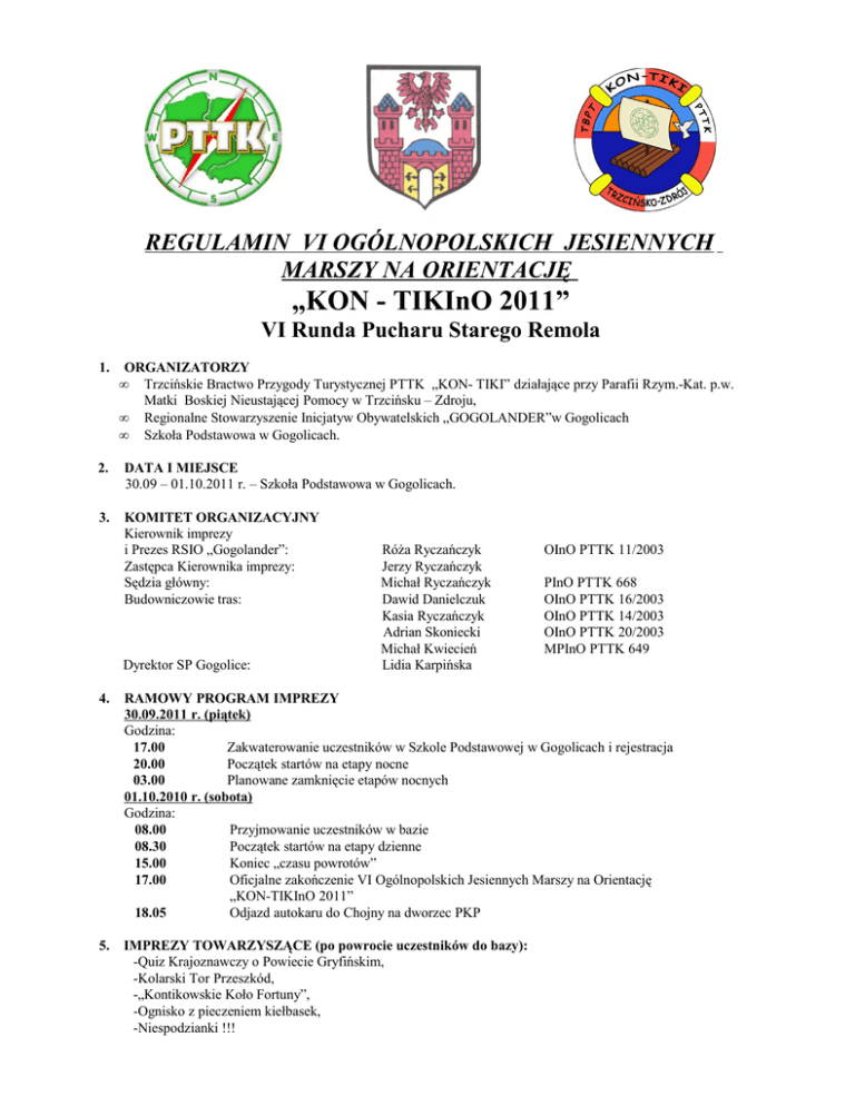 REGULAMIN VI OGÓLNOPOLSKICH JESIENNYCH MARSZY NA ORIENTACJĘ „KON - TIKInO 2011” VI Runda Pucharu Starego Remola 1. ORGANIZATORZY • Trzcińskie Bractwo Przygody Turystycznej PTTK „KON- TIKI” działające przy Parafii Rzym.-Kat. p.w. Matki Boskiej Nieustającej Pomocy w Trzcińsku – Zdroju, • Regionalne Stowarzyszenie Inicjatyw Obywatelskich „GOGOLANDER”w Gogolicach • Szkoła Podstawowa w Gogolicach. 2. DATA I MIEJSCE 30.09 – 01.10.2011 r. – Szkoła Podstawowa w Gogolicach. 3. KOMITET ORGANIZACYJNY Kierownik imprezy i Prezes RSIO „Gogolander”: Zastępca Kierownika imprezy: Sędzia główny: Budowniczowie tras: Dyrektor SP Gogolice: Róża Ryczańczyk Jerzy Ryczańczyk Michał Ryczańczyk Dawid Danielczuk Kasia Ryczańczyk Adrian Skoniecki Michał Kwiecień Lidia Karpińska OInO PTTK 11/2003 PInO PTTK 668 OInO PTTK 16/2003 OInO PTTK 14/2003 OInO PTTK 20/2003 MPInO PTTK 649 4. RAMOWY PROGRAM IMPREZY 30.09.2011 r. (piątek) Godzina: 17.00 Zakwaterowanie uczestników w Szkole Podstawowej w Gogolicach i rejestracja 20.00 Początek startów na etapy nocne 03.00 Planowane zamknięcie etapów nocnych 01.10.2010 r. (sobota) Godzina: 08.00 Przyjmowanie uczestników w bazie 08.30 Początek startów na etapy dzienne 15.00 Koniec „czasu powrotów” 17.00 Oficjalne zakończenie VI Ogólnopolskich Jesiennych Marszy na Orientację „KON-TIKInO 2011” 18.05 Odjazd autokaru do Chojny na dworzec PKP 5. IMPREZY TOWARZYSZĄCE (po powrocie uczestników do bazy): -Quiz Krajoznawczy o Powiecie Gryfińskim, -Kolarski Tor Przeszkód, -„Kontikowskie Koło Fortuny”, -Ognisko z pieczeniem kiełbasek, -Niespodzianki !!! 6. KOMUNIKACJA A. Dojazd do Chojny pociągiem ze Szczecina o godz. 08.12, skąd organizatorzy zapewniają nieodpłatny transport na miejsce imprezy (i z powrotem do Chojny na pociąg w kierunku Szczecina o godzinie 18:39) Zainteresowanych prosimy o kontakt telefoniczny pod numerem 606 45 23 17 lub 692 39 02 84, oraz w przypadku rejestracji internetowej określenie, którym pociągiem się przyjedzie. B. Osoby zainteresowane dojazdem na InO z Trzcińska – Zdroju będą miały zapewniony darmowy transport (tam i z powrotem). Miejsce zbiórki – przystanek PKS przy ulicy Ceglanej godz. 07:45. C. W przypadku zgłoszeń szkół z terenu Gminy Trzcińsko-Zdrój będzie również zapewniony nieodpłatny transport, po wcześniejszych uzgodnieniach z organizatorami (pod ww. numerami tel.).Trasy przejazdu autokaru zostaną ustalone w zależności od potrzeb i zgłoszeń uczestników VI OJMnO „KON-TIKInO 2011”. D. Dojazd osób w ramach kat. TJ, TS i TN w piątek. Wyjazd PKP ze Szczecina o godz. 17.42 do Chojny, skąd organizatorzy zapewniają bezpłatny transport do Gogolic. Zainteresowanych prosimy o kontakt pod ww. numerami telefonów. 7. KATEGORIE I ZESPOŁY kat. TP (1 etap dzienny) – zawodnicy początkujący (każdy, kto ma mniej, niż 5 imprez na koncie), startujący w zespołach 3 osobowych (obowiązkowo). kat. TM (1 etap dzienny) – zawodnicy w wieku do 16 lat włącznie, startujący w zespołach 1-2 osobowych kat. TJ (2 etapy dzienne + 1 etap nocny) – zawodnicy w wieku 17 – 19 lat włącznie, startujących w zespołach 1-2 osobowych kat. TS (2 etapy dzienne + 1 etap nocny) – zawodnicy w wieku ponad 19 lat, startujący w zespołach 1-2 osobowych kat. TN (1 etap nocny) – zawodnicy kategorii TP i TM, etap odbywać się będzie na zamkniętym terenie, poza klasyfikacją kategorii TP i TM, start w zespołach 2-5 osobowych. 8. KONTAKT I ZGŁOSZENIA Rejestracja drużyn jest możliwa na stronie internetowej TBPT PTTK „KON-TIKI” pod adresem: http://www.kon-tikino.pl/rejestracja.php. Dodatkowe informacje u Kierownika imprezy - Róży Ryczańczyk pod numerem telefonu +48 606 45 23 17, lub u Sędziego Głównego – Michała Ryczańczyka pod numerem telefonu: +48 692 39 02 84 Termin zgłoszeń: 28.09.2011 r. 9. OPŁATA STARTOWA TP – 5 zł od uczestnika TM – 5 zł od uczestnika TJ – 20 zł od uczestnika. TS – 20 zł od uczestnika TN – 5 zł od uczestnika Wpisowe należy wpłacić do dnia 28.09.2011 na konto: RSIO „Gogolander” Gogolice 39 74-510 Trzcińsko-Zdrój konto nr: 04 9370 1020 0406 5647 2000 0001 Wpisowe wpłacone po terminie lub na starcie wzrasta o 50% i nie gwarantuje wszystkich świadczeń! 10. ŚWIADCZENIA: - materiały startowe, - punkty na OTP, OInO PTTK (ranga imprezy: ogólnopolska), - medale i nagrody dla zwycięzców w poszczególnych kategoriach, - kiełbaska do pieczenia na ognisku + pieczywo + coś do picia, - posiłek regeneracyjny na półmetku - puchary, m.in. dla najlepszej szkoły/klubu, - pamiątkowy znaczek z imprezy. 11. POSTANOWIENIA KOŃCOWE - Impreza odbędzie się bez względu na pogodę. - Uczestnicy ubezpieczają się we własnym zakresie. - Organizatorzy nie odpowiadają za szkody poniesione i spowodowane przez uczestników, za które odpowiadają opiekunowie lub pełnoletni uczestnicy. - Podsumowanie odbędzie się w miejscu startu i mety imprezy. - Uczestnicy mogą korzystać tylko z wydzielonej i udostępnionej części bazy. - Wszystkich uczestników obowiązuje Karta Turysty i zalecenia organizatorów oraz inne przepisy prawne mające zastosowanie przy imprezach turystycznych dot. zasad ppoż., ruchu drogowego itp., - W trakcie trwania imprezy obowiązuje całkowity zakaz spożywania alkoholu oraz innych środków psychoaktywnych. Wspomniane artykuły będą konfiskowane przez organizatorów. - Ostateczna interpretacja regulaminu należy do organizatorów. - Organizatorzy zastrzegają sobie prawo do zmian w programie, o czym będą informować. - UWAGA! Możliwe jest również zapisanie się dopiero na starcie, ale organizatorzy nie gwarantują w takim przypadku wszystkich świadczeń. Zapraszamy!!! ORGANIZATORZY