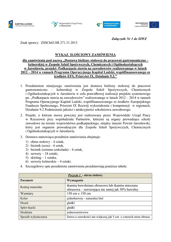 Załącznik Nr 1 do SIWZ Znak sprawy: ZSSChiO.SR.271.31.2013 WYKAZ ILOŚCIOWY ZAMÓWIENIA dla zamówienia pod nazwą „Dostawa bielizny stołowej do pracowni gastronomiczno – kelnerskiej w Zespole Szkół Spożywczych, Chemicznych i Ogólnokształcących w Jarosławiu, projekt: Podkarpacie stawia na zawodowców realizowanego w latach 2012 – 2014 w ramach Programu Operacyjnego Kapitał Ludzki, współfinansowanego ze środków EFS, Priorytet IX, Działanie 9.2.” 1. Przedmiotem niniejszego zamówienia jest dostawa bielizny stołowej do pracowni gastronomiczno – kelnerskiej w Zespole Szkół Spożywczych, Chemicznych i Ogólnokształcących w Jarosławiu w celu prawidłowej realizacji projektu systemowego pn. „Podkarpacie stawia na zawodowców” realizowanego w latach 2012 – 2014 w ramach Programu Operacyjnego Kapitał Ludzki, współfinansowanego ze środków Europejskiego Funduszu Społecznego, Priorytet IX Rozwój wykształcenia i kompetencji w regionach, Działanie 9.2 Podniesienie jakości i atrakcyjności szkolnictwa zawodowego. 2. Projekt, o którym mowa powyżej jest realizowany przez Wojewódzki Urząd Pracy w Rzeszowie przy współudziale Partnerów, którymi są organy prowadzące szkoły zawodowe na terenie województwa podkarpackiego, między innymi Powiat Jarosławski, który jest organem prowadzącym dla Zespołu Szkół Spożywczych, Chemicznych i Ogólnokształcących w Jarosławiu. 3. Dostawa stanowiąca przedmiot zamówienia obejmuje: 1) obrus stołowy – 6 sztuk, 2) bieżnik (ecru) – 6 sztuk, 3) bieżnik (ciemna czekolada) – 6 sztuk, 4) serwety – 24 sztuki, 5) skirting – 1 sztuka, 6) serwety kelnerskie – 4 sztuki. 4. Szczegółowy opis przedmiotu zamówienia przedstawiają poniższe tabele: Pozycja 1 - obrus stołowy Parametr Wymagania Wymiary tkanina bawełniana obrusowa lub tkanina mieszana obrusowa – zawierająca nie mniej jak 50% bawełny 150 cm x 150 cm Kolor Deseń Splot tkacki Struktura Sposób wykończenia jednobarwny - naturalna biel gładki gładki jednowarstwowa listwa o szerokości nie większej jak 5 cm z czterech stron obrusu Rodzaj materiału Pozycja 2 - bieżnik (ecru) Parametr Wymagania Rodzaj materiału tkanina bawełniana obrusowa lub tkanina mieszana obrusowa – zawierająca nie mniej jak 50% bawełny Wymiary 150 cm x 40 cm Kolor jednobarwny - écru Deseń Splot tkacki struktura gładki gładki jednowarstwowa Sposób wykończenia ozdobna szeroka listwa wykończeniowa z satynową bizą Pozycja 3 – bieżnik (ciemna czekolada) Parametr Wymagania Rodzaj materiału tkanina bawełniana obrusowa lub tkanina mieszana obrusowa – zawierająca nie mniej jak 50% bawełny Wymiary Kolor Deseń Splot tkacki Struktura 150 cm x 40 cm jednobarwne - czekolada ciemna gładki gładki jednowarstwowa Sposób wykończenia ozdobna szeroka listwa wykończeniowa z czterech stron bieżnika Pozycja 4– serwety Parametr Wymagania Rodzaj materiału tkanina bawełniana obrusowa lub tkanina mieszana obrusowa – zawierająca nie mniej jak 50% bawełny Wymiary Kolor Deseń Splot tkacki Struktura 50cm x 50cm jednobarwne - naturalna biel gładki gładki jednowarstwowa Sposób wykończenia obszycie z czterech stron serwety, rąb nie większy jak 5 milimetrów Pozycja 5 – skirting Parametr Wymagania Rodzaj materiału satyna błyszcząca Kolor Deseń Jednobarwny - écru układane w kontrafałdę, 1:3 w fałdę 0,75 metra 9 metrów gładki Splot tkacki Struktura gładki jednowarstwowa Sposób marszczenia Wysokość Długość Sposób wykończenia lamówka w kolorze écru o szerokości nie większej jak 5 milimetrów Grubość blatu stołu do mocowania 2,5 cm Sposób mocowania taśma mocująca lub klipsy mocujące Pozycja 6 – serwety kelnerskie Parametr Wymagania Rodzaj materiału 100% bawełny Wymiary Kolor Deseń Splot tkacki Struktura 40 cm x 60 cm jednobarwny – naturalna biel gładki gładki jednowarstwowa Sposób wykończenia obszycie z czterech stron serwety