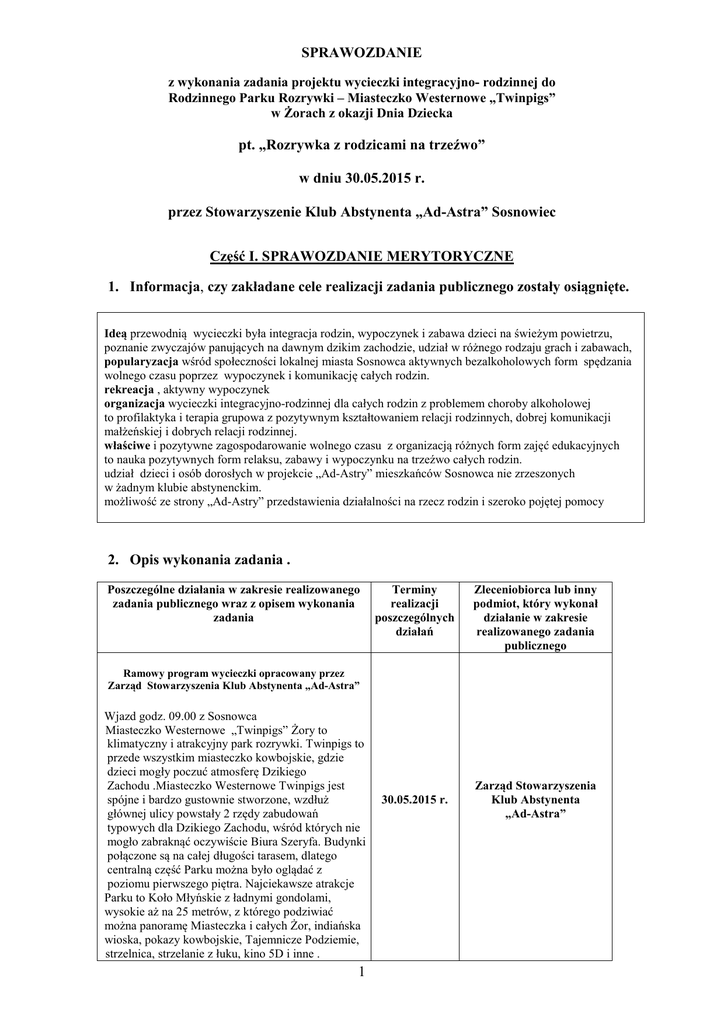 SPRAWOZDANIE z wykonania zadania projektu wycieczki integracyjno- rodzinnej do Rodzinnego Parku Rozrywki – Miasteczko Westernowe „Twinpigs” w Żorach z okazji Dnia Dziecka pt. „Rozrywka z rodzicami na trzeźwo” w dniu 30.05.2015 r. przez Stowarzyszenie Klub Abstynenta „Ad-Astra” Sosnowiec Część I. SPRAWOZDANIE MERYTORYCZNE 1. Informacja, czy zakładane cele realizacji zadania publicznego zostały osiągnięte. Ideą przewodnią wycieczki była integracja rodzin, wypoczynek i zabawa dzieci na świeżym powietrzu, poznanie zwyczajów panujących na dawnym dzikim zachodzie, udział w różnego rodzaju grach i zabawach, popularyzacja wśród społeczności lokalnej miasta Sosnowca aktywnych bezalkoholowych form spędzania wolnego czasu poprzez wypoczynek i komunikację całych rodzin. rekreacja , aktywny wypoczynek organizacja wycieczki integracyjno-rodzinnej dla całych rodzin z problemem choroby alkoholowej to profilaktyka i terapia grupowa z pozytywnym kształtowaniem relacji rodzinnych, dobrej komunikacji małżeńskiej i dobrych relacji rodzinnej. właściwe i pozytywne zagospodarowanie wolnego czasu z organizacją różnych form zajęć edukacyjnych to nauka pozytywnych form relaksu, zabawy i wypoczynku na trzeźwo całych rodzin. udział dzieci i osób dorosłych w projekcie „Ad-Astry” mieszkańców Sosnowca nie zrzeszonych w żadnym klubie abstynenckim. możliwość ze strony „Ad-Astry” przedstawienia działalności na rzecz rodzin i szeroko pojętej pomocy 2. Opis wykonania zadania . Poszczególne działania w zakresie realizowanego zadania publicznego wraz z opisem wykonania zadania Terminy realizacji poszczególnych działań Zleceniobiorca lub inny podmiot, który wykonał działanie w zakresie realizowanego zadania publicznego Ramowy program wycieczki opracowany przez Zarząd Stowarzyszenia Klub Abstynenta „Ad-Astra” Wjazd godz. 09.00 z Sosnowca Miasteczko Westernowe „Twinpigs” Żory to klimatyczny i atrakcyjny park rozrywki. Twinpigs to przede wszystkim miasteczko kowbojskie, gdzie dzieci mogły poczuć atmosferę Dzikiego Zachodu .Miasteczko Westernowe Twinpigs jest spójne i bardzo gustownie stworzone, wzdłuż głównej ulicy powstały 2 rzędy zabudowań typowych dla Dzikiego Zachodu, wśród których nie mogło zabraknąć oczywiście Biura Szeryfa. Budynki połączone są na całej długości tarasem, dlatego centralną część Parku można było oglądać z poziomu pierwszego piętra. Najciekawsze atrakcje Parku to Koło Młyńskie z ładnymi gondolami, wysokie aż na 25 metrów, z którego podziwiać można panoramę Miasteczka i całych Żor, indiańska wioska, pokazy kowbojskie, Tajemnicze Podziemie, strzelnica, strzelanie z łuku, kino 5D i inne . 1 30.05.2015 r. Zarząd Stowarzyszenia Klub Abstynenta „Ad-Astra” W Miasteczku Twinpigs nie brakuje też Kowbojów, uroczego i dowcipnego Więźnia oraz Szeryfa miasteczka. Są też oczywiście atrakcje dla smakoszy, działają tu bowiem restauracje, w tym "Panna Maria Teksas". Działa również Hotel. Ze wszystkich tych atrakcji korzystali uczestnicy wycieczki do godz. 17.00 Powrót do Sosnowca godz. 18.00 30.05.2015 r. Zarząd Stowarzyszenia Klub Abstynenta „Ad-Astra” 3. Opis osiągniętych rezultatów. Stowarzyszenie Klub Abstynenta „Ad-Astra” Sosnowiec realizując zadanie wycieczki integracyjno-rodzinnej dla całych rodzin zaproponował aktywny wypoczynek, edukację, poznanie ciekawych rozrywkowych miejsc dostępnych dla całych rodzin z możliwością wspólnej rekreacji, wypoczynku i zabawy. Wycieczka była formą terapii rodzinnej i integracji ze społecznością lokalną miasta Sosnowca. Rodziny członków klubu mogły zobaczyć jak wspaniale można spędzać czas bez alkoholu a dzieci biorąc udział w wycieczce miały możliwość uczenia się wspaniałego wypoczynku wraz z rodzicami bez używania alkoholu. 4. Liczbowe określenie skali działań zrealizowanych w ramach zadania. W realizacji projektu i wykonanego zadania wycieczki integracyjno – rodzinnej z okazji Dnia Dziecka do Miasteczka Westernowego „Twinpigs’ w Żorach w dniu 30.05.2015 r. udział łącznie wzięły 53 osoby członkowie klubu „Ad-Astra” Sosnowiec wraz z rodzinami oraz osoby nie zrzeszone w żadnym klubie abstynenckim – mieszkańcy Sosnowca ( w tym 27 dzieci ). Część II. Sprawozdanie z wykonania wydatków. 1. Rozliczenie ze względu na rodzaj kosztów ( w zł ). 2 Z tego pokryty z wkładu osobowego w tym pracy społecznej członków i świadczeń wolontariatu Z tego z finansowych środków własnychśrodków z innych źródeł,w tym wpłat i opłat adresatów zadania publicznego Z tego pokryty z dotacji Bieżący okres sprawozdawczy – za okres realizacji zadania projektu ( w zł). Koszt całkowity Z tego z finansowych środków własnych środków z innych źródeł w tym wpłat i opłat adresatów zadania publicznego Z tego pokryty z wkładu osobowego w tym pracy społecznej i świadczeń wolontariatu Z tego pokryty z dotacji Poprzedni okres sprawozdawczy (w zł) Z tego pokryty z wkładu osobowego w tym pracy społecznej członków klubu i świadczeń wolontariuszy Koszt całkowity Koszty merytoryczne z uwzględnieniem kosztów poniesionych przez Z tego pokryty z finansowych środków własnych , środków z innych źródeł, w tym wpłat i opłat adresatów zadania publiczn. I. Całość zadania zgodnie z projektem Z tego pokryty z dotacji Rodzaj kosztów Koszt całkowity Lp. Stowarzyszenie Klub Abstynenta „Ad-Astra” 1.Ubezpieczenie uczestników wycieczki z okazji Dnia Dziecka do Żor w dniu 30.05.2015 r. 2. Zakup słodyczy i napojów dla dzieci uczestników wycieczki w dniu 30.05.2015 3. Opłata za wynajem autokaru do przewozu uczestników wycieczki w dniu 30.05.2015 r. na trasie SosnowiecŻory- Sosnowiec 4. Opłata za bilety wstępu do Miasteczka Westernowego w Żorach dla uczestników wycieczki w dniu 30.05.2015 II. Ogółem 2. 102,00 0,00 102,00 0,00 0,00 0,00 0,00 0,00 1