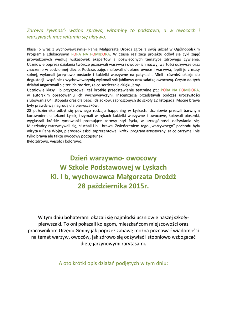 Zdrowa żywność- ważna sprawa, witaminy to podstawa, a w owocach i warzywach moc witamin się ukrywa. Klasa Ib wraz z wychowawczynią- Panią Małgorzatą Drożdż zgłosiła swój udział w Ogólnopolskim Programie Edukacyjnym PORA NA POMIDORA. W czasie realizacji projektu odbył się cykl zajęć prowadzonych według wskazówek ekspertów a poświęconych tematyce zdrowego żywienia. Uczniowie poprzez działania twórcze poznawali warzywa i owoce- ich nazwy, wartości odżywcze oraz znaczenie w codziennej diecie. Podczas zajęć malowali ulubione owoce i warzywa, lepili je z masy solnej, wykonali jarzynowe postacie i kukiełki warzywne na patykach. Mieli również okazje do degustacji- wspólnie z wychowawczynią wykonali sok jabłkowy oraz sałatkę owocową. Często do tych działań angażowali się tez ich rodzice, za co serdecznie dziękujemy. Uczniowie klasy I b przygotowali też krótkie przedstawienie teatralne pt.: PORA NA POMIDORA, w autorskim opracowaniu ich wychowawczyni. Inscenizację przedstawili podczas uroczystości ślubowania 04 listopada oraz dla babć i dziadków, zaproszonych do szkoły 12 listopada. Mocne brawa były prawdziwą nagrodą dla pierwszaków. 28 października odbył się pewnego rodzaju happening w Lyskach. Uczniowie przeszli barwnym korowodem uliczkami Lysek, trzymali w rękach kukiełki warzywne i owocowe, śpiewali piosenki, wygłaszali krótkie rymowanki promujące zdrowy styl życia, w szczególności odżywiania się. Mieszkańcy zatrzymywali się, słuchali i bili brawa. Zwieńczeniem tego „warzywnego” pochodu była wizyta u Pana Wójta, pierwszoklasiści zaprezentowali krótki program artystyczny, za co otrzymali nie tylko brawa ale także owocowy poczęstunek. Było zdrowo, wesoło i kolorowo. Dzień warzywno- owocowy W Szkole Podstawowej w Lyskach Kl. I b, wychowawca Małgorzata Drożdż 28 października 2015r. W tym dniu bohaterami okazali się najmłodsi uczniowie naszej szkołypierwszaki. To oni pokazali kolegom, mieszkańcom miejscowości oraz pracownikom Urzędu Gminy jak poprzez zabawę można poznawać wiadomości na temat warzyw, owoców, jak zdrowo się odżywiać i stopniowo wzbogacać dietę jarzynowymi rarytasami. A oto krótki opis działań podjętych w tym dniu: 1. Poznawanie własności zbiorów. 2. Poprzez działania praktyczne z użyciem warzyw i owoców ,uczniowie poznawali własności zbiorów. Wykonali zbiory owoców i warzyw, następnie ich podzbiory. Nazywali owoce i warzywa, rozróżniali przy tym te, które rosną w Polsce. Potem nadeszła chwila relaksu i drugiego śniadania- zbiory zostały puste. Było smacznie, zdrowo i kolorowo. 3. 100% sok jabłkowy! Po przerwie (wraz ze słoniem roślinożercą ) dzieci dowiedziały się o wartościach odżywczych wybranych warzyw i owoców. Następnie wspólnie wykonaliśmy sok jabłkowy- ach cóż to był za soczek zdrowy- stuprocentowy! To było autentyczne: NA ZDROWIE! 4. Happening Kiedy już brzuszki były pełne zorganizowaliśmy pewnego rodzaju happening w Lyskach- czyli miejscowości, w której mieści się nasza szkoła. . Uczniowie przeszli barwnym korowodem uliczkami Lysek, trzymali w rękach kukiełki warzywne i owocowe, które wykonali wspólnie z rodzicami. Śpiewali piosenki, wygłaszali krótkie rymowanki promujące zdrowy styl życia, w szczególności odżywiania się. Mieszkańcy zatrzymywali się, słuchali i bili brawa. Byliśmy dumni, że wszyscy nas podziwiają. 5. Happening c. d. Zwieńczeniem tego „warzywnego” pochodu była wizyta w Urzędzie Gminy. Pracownicy biura dowiedzieli się, że najważniejsza jest natura- a na kanapce zielone, czerwone jest po prostu niezastąpione . U Pana Wójta, pierwszoklasiści zaprezentowali krótki program artystyczny. Była to premiera przedstawienia teatralnego pt. : PORA NA POMIDORA . Mali aktorzy otrzymali nie tylko brawa ale także owocowy poczęstunek. W czasie realizacji projektu odbył się ponadto cykl zajęć prowadzonych według wskazówek ekspertów a poświęconych tematyce zdrowego żywienia. Uczniowie poprzez działania twórcze poznawali warzywa i owoce- ich nazwy, wartości odżywcze oraz znaczenie w codziennej diecie. Podczas zajęć malowali ulubione owoce i warzywa, lepili je z masy solnej, wykonali jarzynowe postacie i kukiełki warzywne na patykach. Mieli również okazję do degustacji- wykonali sok jabłkowy oraz sałatkę owocową. Rodziny uczniów wzięły udział w konkursie na najładniejszy owoc lub warzywo na patyku- stąd te piękne rekwizyty podczas parady. Często do działań podejmowanych podczas realizacji projektu angażowali się rodzice, za co serdecznie dziękuję. Z owocowym pozdrowieniem Małgorzata Drożdż Prezentacja dotyczącą realizacji projektu znajduje się pod adresem: https://prezi.com/nimf0ktxpnq4/pora-na-pomidora/