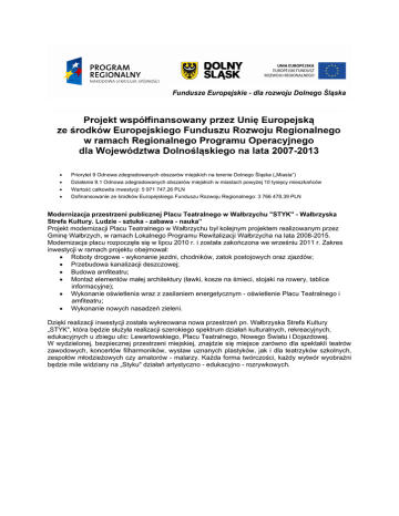• • • • Priorytet 9 Odnowa zdegradowanych obszarów miejskich na terenie Dolnego Śląska („Miasta”) Działanie 9.1 Odnowa zdegradowanych obszarów miejskich w miastach powyżej 10 tysięcy mieszkańców Wartość całkowita inwestycji: 5 971 747,26 PLN Dofinansowanie ze środków Europejskiego Funduszu Rozwoju Regionalnego: 3 766 478,39 PLN Modernizacja przestrzeni publicznej Placu Teatralnego w Wałbrzychu "STYK" - Wałbrzyska Strefa Kultury. Ludzie - sztuka - zabawa - nauka” Projekt modernizacji Placu Teatralnego w Wałbrzychu był kolejnym projektem realizowanym przez Gminę Wałbrzych, w ramach Lokalnego Programu Rewitalizacji Wałbrzycha na lata 2008-2015. Modernizacja placu rozpoczęła się w lipcu 2010 r. i została zakończona we wrześniu 2011 r. Zakres inwestycji w ramach projektu obejmował: • Roboty drogowe - wykonanie jezdni, chodników, zatok postojowych oraz zjazdów; • Przebudowa kanalizacji deszczowej; • Budowa amfiteatru; • Montaż elementów małej architektury (ławki, kosze na śmieci, stojaki na rowery, tablice informacyjne); • Wykonanie oświetlenia wraz z zasilaniem energetycznym - oświetlenie Placu Teatralnego i amfiteatru; • Wykonanie nowych nasadzeń zieleni. Dzięki realizacji inwestycji została wykreowana nowa przestrzeń pn. Wałbrzyska Strefa Kultury „STYK", która będzie służyła realizacji szerokiego spektrum działań kulturalnych, rekreacyjnych, edukacyjnych u zbiegu ulic: Lewartowskiego, Placu Teatralnego, Nowego Światu i Dojazdowej. W wydzielonej, bezpiecznej przestrzeni miejskiej, znajdzie się miejsce zarówno dla spektakli teatrów zawodowych, koncertów filharmoników, wystaw uznanych plastyków, jak i dla teatrzyków szkolnych, zespołów młodzieżowych czy amatorów - malarzy. Każda forma twórczości, każdy wytwór wyobraźni będzie mile widziany na „Styku" działań artystyczno - edukacyjno - rozrywkowych.