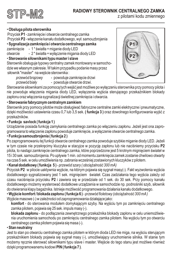 STP-M2 RADIOWY STEROWNIK CENTRALNEGO ZAMKA z pilotami kodu zmiennego • Obs³uga pilota sterownika Przycisk P1 - zamkniêcie i otwarcie centralnego zamka Przycisk P2 - w³¹czenie kana³u dodatkowego, wy³. samouzbrojenia • Sygnalizacja zamkniêcia i otwarcia centralnego zamka P1 zamkniêcie - 1 * œwiat³a + miganie diody LED otwarcie - 2 * œwiat³a + wy³¹czenie migania diody LED P2 • Sterowanie si³ownikami typu master i slave Sterownik obs³uguje typowy centralny zamek montowany w samochodzie we w³asnym zakresie. W takim przypadku podanie masy przez si³ownik "master" na wejœcie sterownika : przewód br¹zowy - powoduje zamkniêcie drzwi przewód bia³y - powoduje otwarcie drzwi. Sterowanie si³ownikami za pomoc¹ tych wejœæ jest mo¿liwe po wy³¹czeniu sterownika przy pomocy pilota i nie powoduje w³¹czenia migania diody LED, wy³¹czenia wyjœcia steruj¹cego przekaŸnikiem blokady zap³onu oraz w³¹czenia sygnalizacji œwietlnej zamkniêcia i otwarcia. • Sterowanie fabrycznym centralnym zamkiem Sterownik przy pomocy pilotów mo¿e obs³ugiwaæ fabryczne centralne zamki elektryczne i pneumatyczne, dziêki mo¿liwoœci ustawienia czasu 0,7 lub 3,5 sek. ( funkcja 3 ) oraz dowolnego konfigurowania wyjœæ z przekaŸników. • Funkcja savlock ( funkcja 1 ) Urz¹dzenie posiada funkcjê zamykania centralnego zamka po w³¹czeniu zap³onu. Je¿eli jest ona zaprogramowana to w³¹czenie zap³onu powoduje zamkniêcie, a wy³¹czenie otwarcie centralnego zamka. • Funkcja samouzbrojenia ( funkcja 2 ) Po zaprogramowaniu tej funkcji otwarcie centralnego zamka powoduje szybkie miganie diody LED. Je¿eli w tym czasie nie przekrêcimy kluczyka w stacyjce w pozycjê zap³onu lub nie naciœniemy przycisku P2 pilota, to nast¹pi zamkniêcie centralnego zamka, które poprzedzone jest 5 krotnym migniêciem œwiate³ w 15 i 30 sek. samouzbrojenia. Po up³ywie 1 min. od momentu zamkniêcia zamek zostanie chwilowo otwarty na czas 5 sek. w celu umo¿liwienia np. zabrania wczeœniej zostawionych kluczyków z pilotem. • Kana³ dodatkowy ( funkcja 5 ) - przewód szary ( obci¹¿alnoœæ 300 mA) Przycisk P2 w pilocie uaktywnia wyjœcie, na którym pojawia siê sygna³ masy(-). Fakt wyzwolenia wyjœcia dodatkowego sygnalizowany jest 1 sek. migniêciem œwiate³. Czas zadzia³ania tego wyjœcia zale¿y od czasu naciœniêcia przycisku P2 i zawiera siê w przedziale od 1 sek. do 30 sek. Przy pomocy kana³u dodatkowego mo¿emy wysterowaæ dodatkowe urz¹dzenia w samochodzie np. podnoœniki szyb, si³ownik do otwierania klapy baga¿nika. Istnieje mo¿liwoœæ programowania dzia³ania kana³u dodatkowego. • Wyjœcie komfort / blokada zap³onu ( funkcja 6 ) - przewód fioletowy (obci¹¿alnoœæ 300 mA ) Wyjœcie masowe (-) w zale¿noœci od zaprogramowania dzia³aj¹ce jako: komfort - do sterowania modu³em domykaj¹cym szyby. Na wyjœciu tym po zamkniêciu centralnego zamka pilotem, pojawia siê 25 sek. impuls masy (-). blokada zap³onu - do pod³¹czenia zewnêtrznego przekaŸnika blokady zap³onu w celu uniemo¿liwienia uruchomienia samochodu po zamkniêciu centralnego zamka pilotem. Na wyjœciu tym po otwarciu centralnego zamka pilotem pojawia siê masa (-). • Stan neutralny Jest to stan po otwarciu centralnego zamka pilotem w którym dioda LED nie miga, na wyjœciu steruj¹cym przekaŸnikiem blokady pojawia siê sygna³ masy (-), umo¿liwiaj¹cy uruchomienie silnika. W stanie tym mo¿emy rêcznie sterowaæ si³ownikami typu slave i master. Wejœcie do tego stanu jest mo¿liwe równie¿ dziêki programowanemu kodowi PIN ( funkcja 7 ). PROGRAMOWANIE DZIA£ANIA STEROWNIKA Funkcje do zaprogramowania w sterowniku : • Funkcja savelock • Funkcja samoczynnego uzbrojenia • Czas dzia³ania sterownika 0,7 lub 3,5 sek. • Funkcja podwójnego impulsu do zamykania zamka • Dzia³anie kana³u dodatkowego • Dzia³anie wyjœcia dodatkowego • Programowanie kodu ustawienia fabryczne ( wy³¹czona) ( wy³¹czona) ( 0,7 sek.) ( wy³¹czona) ( po otwarciu centr. zamka) ( komfort ) ( 1) Programowanie funkcji sterownika : • Wejœcie w stan programowania odbywa siê po jednoczesnym (5 sek.) naciœniêciu przycisków P1 i P2 pilota w stanie neutralnym co bêdzie zasygnalizowane 2 migniêciami diody LED. Wejœcie w stan programowania umo¿liwia zaprogramowanie jednej funkcji. • Przyciskiem P2 wybieramy funkcjê do zaprogramowania wg tabelki. Ka¿de naciœniêcie przycisku P2 jest zasygnalizowane migniêciem diody LED. • Przyciskiem P1 dokonujemy ustawieñ wybranej funkcji. • Wyjœcie ze stanu programowania odbywa siê samoczynnie po 5 sek. od dokonania ustawieñ przyciskiem P1 pilota i jest zasygnalizowane 4 migniêciami diody LED. Wybór funkcji - P2 Programowanie funkcji - P1 Rodzaj funkcji Iloœæ naciœniêæ dioda LED 1 migniêcie dioda LED 2 migniêcia Funkcja savelock 1 Jest [ Nie ma ] Funkcja samoczynnego uzbrojenia 2 Jest [ Nie ma ] Czas impulsów steruj¹cych 3 3,5 sek. [ 0,7 sek. ] Podwójny impuls do zamkniêcia 4 Jest [ Nie ma ] Dzia³anie kana³u dodatkowego 5 po otwarciu i zamkniêciu [Tylko po otwarciu] Dzia³anie wyjœcia dodatkowego 6 [ Komfort ] Blokada zap³onu Programowanie kodu PIN 7 Wprowadziæ liczbê od 1 do 20 Uwaga: drukiem wyt³uszczonym i w [ ] zaznaczono ustawienia fabryczne funkcji • • Kod PIN jest liczb¹ przekrêceñ kluczyka w stacyjce w pozycjê zap³onu ( w czasie 60 sek. ) w celu przejœcia urz¹dzenia ze stanu po zamkniêciu pilotem do stanu neutralnego. Czas 60 sek. do wprowadzenia kodu sygnalizowany jest sta³ym œwieceniem diody LED. Programowanie pilotów odbywa siê po pod³¹czeniu zasilania przy w³¹czonym zap³onie. Stan ten zasygnalizowany jest 5 sek. zapaleniem siê diody LED. W tym czasie naciœniêcie P1 - wpisuje pilota (1 przygaœniêcie diody LED) P2 - kasuje piloty ( 2 przygaœniêcia diody LED ) KONFIGURACJA WYJŒÆ PR¥DOWYCH schemat 1 schemat 2 schemat 3 niebieski zielony niebieski zielony pola programuj¹ce wyjœcia pr¹dowe sterow