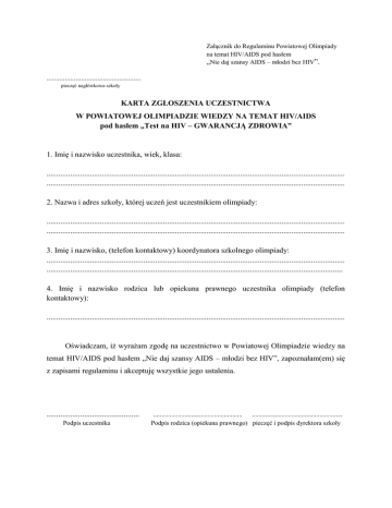 Załącznik do Regulaminu Powiatowej Olimpiady na temat HIV/AIDS pod hasłem „Nie daj szansy AIDS – młodzi bez HIV”. .................................................... pieczęć nagłówkowa szkoły KARTA ZGŁOSZENIA UCZESTNICTWA W POWIATOWEJ OLIMPIADZIE WIEDZY NA TEMAT HIV/AIDS pod hasłem „Test na HIV – GWARANCJĄ ZDROWIA” 1. Imię i nazwisko uczestnika, wiek, klasa: ....................................................................................................................................................... ....................................................................................................................................................... 2. Nazwa i adres szkoły, której uczeń jest uczestnikiem olimpiady: ....................................................................................................................................................... ....................................................................................................................................................... 3. Imię i nazwisko, (telefon kontaktowy) koordynatora szkolnego olimpiady: ....................................................................................................................................................... ...................................................................................................................................................... 4. Imię i nazwisko rodzica lub opiekuna prawnego uczestnika olimpiady (telefon kontaktowy): ....................................................................................................................................................... Oświadczam, iż wyrażam zgodę na uczestnictwo w Powiatowej Olimpiadzie wiedzy na temat HIV/AIDS pod hasłem „Nie daj szansy AIDS – młodzi bez HIV”, zapoznałam(em) się z zapisami regulaminu i akceptuję wszystkie jego ustalenia. ............................................... Podpis uczestnika ...................................................... ....................................................... Podpis rodzica (opiekuna prawnego) pieczęć i podpis dyrektora szkoły