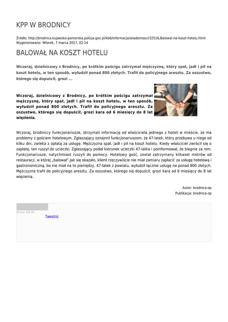 KPP W BRODNICY Źródło: http://brodnica.kujawsko-pomorska.policja.gov.pl/kb6/informacje/wiadomosci/32516,Balowal-na-koszt-hotelu.html Wygenerowano: Wtorek, 7 marca 2017, 02:14 BALOWAŁ NA KOSZT HOTELU Wczoraj, dzielnicowy z Brodnicy, po krótkim pościgu zatrzymał mężczyznę, który spał, jadł i pił na koszt hotelu, w ten sposób, wyłudził ponad 800 złotych. Trafił do policyjnego aresztu. Za oszustwo, którego się dopuścił, grozi ... Wczoraj, dzielnicowy z Brodnicy, po krótkim pościgu zatrzymał mężczyznę, który spał, jadł i pił na koszt hotelu, w ten sposób, wyłudził ponad 800 złotych. Trafił do policyjnego aresztu. Za oszustwo, którego się dopuścił, grozi kara od 6 miesięcy do 8 lat więzienia. Wczoraj, brodniccy funkcjonariusze, otrzymali informację od właściciela jednego z hoteli w mieście, że ma problemy z gościem hotelowym. Zgłaszający oznajmił funkcjonariuszom, że 47-latek, który przebywa u niego od kilku dni, zwleka z opłatą za usługę. Mężczyzna spał, jadł i pił na koszt hotelu. Kiedy właściciel zwrócił się o zapłatę, ten ruszył do ucieczki. Zgłaszający podał kierunek ucieczki 47-latka i poinformował, że biegnie za nim. Funkcjonariusze, natychmiast ruszyli do pomocy. Hotelowy gość, został zatrzymany kilkaset metrów od restauracji, w której „balował”.Jak się okazało, klient rzeczywiście nie miał zamiaru zapłacić za usługę hotelową i gastronomiczną, bo nie miał na to pieniędzy. 47-latek z powiatu, wyłudził łącznie usługę na ponad 800 złotych. Mężczyzna trafił do policyjnego aresztu. Za oszustwo, którego się dopuścił, grozi kara od 6 miesięcy do 8 lat więzienia. Autor: brodnica-op Publikacja: brodnica-op Ocena: 0/5 (0) Tweetnij