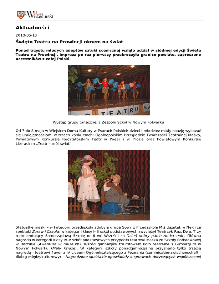 Aktualności 2010-05-13 Święto Teatru na Prowincji oknem na świat Ponad trzystu młodych adeptów sztuki scenicznej wzięło udział w siódmej edycji Święta Teatru na Prowincji. Impreza po raz pierwszy przekroczyła granice powiatu, zaproszono uczestników z całej Polski. Występ grupy tanecznej z Zespołu Szkół w Nowym Folwarku Od 7 do 8 maja w Wiejskim Domu Kultury w Psarach Polskich dzieci i młodzież miały okazję wykazać się umiejętnościami w trzech konkursach: Ogólnopolskim Przeglądzie Twórczości Teatralnej Maska, Powiatowym Konkursie Recytatorskim Teatr w Poezji i w Prozie oraz Powiatowym Konkursie Literackim „Teatr – mój świat”. Statuetkę maski – w kategorii przedszkola zdobyła grupa Sowy z Przedszkola Miś Uszatek w Nekli za spektakl Żuraw i Czapla, w kategorii klasy I-III szkół podstawowych zwyciężył Teatrzyk Raz, Dwa, Trzy reprezentujący Samorządową Szkołę nr 6 we Wrześni za Dzień dobry panie Andersenie. Główna nagroda w kategorii klasy IV-V szkół podstawowych przypadła teatrowi Maska ze Szkoły Podstawowej w Barcinie (Awantura w muzeum). Wśród gimnazjów triumfowało koło teatralne z Gimnazjum w Nowym Folwarku (Mały książę). W kategorii szkoły ponadgimnazjalne przyznano tylko trzecią nagrodę - teatrowi 4ever z IV Liceum Ogólnokształcącego z Poznania (cominicationzwischenschaft dialog międzykulturowy) – Nagrodzone spektakle opowiadały o sprawach dotyczących współczesnej młodzieży, miały perfekcyjnie przygotowaną, a zarazem oszczędną scenografię, adekwatne kostiumy – komentuje werdykt jury Sławomira Czarnecka, organizator przedsięwzięcia i jednocześnie dyrektor Zespołu Szkół w Nowym Folwarku. Spektakl Witaj wiosno w wykonaniu grupy Pszczółki z przedszkola Pszczółka Maja we Wrześni – Wykonawcy ponadto prezentowali nieprzeciętne umiejętności aktorskie. Poziom tegorocznej imprezy kształtował się na wyjątkowo wysokim poziomie. Każdy uczestnik, a wielu z nich przyjechało spoza regionu, wniósł do przeglądu coś nowego, czego nie było wcześniej. Ogólnopolska formuła Święta Teatru na Prowincji to nie jedyna zmiana. – W bieżącym roku zrezygnowaliśmy z konkursu plastycznego, fotograficznego i edytorskiego na rzecz literackiego i recytatorskiego – informuje Sławomir Czarnecka.- Do przeglądu teatralnego wprowadziliśmy nową kategorię – przedszkola, by dać szansę zaistnienia na scenie najmłodszym. Równolegle odbywały się zajęcia warsztatowe. Prowadzili je aktorzy znanego w Polsce i za granicą animatora sceny alternatywnej Ośrodka Praktyk Teatralnych Gardzienice oraz Andrzej Malicki, aktor teatru im. A. Fredry w Gnieźnie. – Aktorów z Gardzienic gościliśmy u siebie po raz pierwszy – relacjonuje Sławomira Czarnecka . – Zarówno dla nich jak i dla nas było to nowe doświadczenie. Podczas warsztatów starano się rozszerzyć środki artystycznego wyrazu młodzieży. Pracowano nad ciałem z wykorzystaniem śpiewu i słowa. Uczestnicy warsztatów obejrzeli film z jednym ze spektakli ośrodka. Nie obyło się bez premiery. Teatr Fakt 3 z Gimnazjum nr 3 w Nowym Folwarku z udziałem przedstawicieli władz lokalnych wystawił entuzjastycznie przyjętą Moralność pani Dulskiej Gabrieli Zapolskiej w wykonaniu Elżbiety Górczyńskiej i Andrzeja Malickiego. Jako narrator wystąpił Paweł Guzik, wicestarosta wrzesiński, w rolę Dulskiego wcielił się Waldemar Grześkowiak, wiceburmistrz Wrześni, Dulską zagrała Milena Antczak, emerytowana dyrektor Zespołu Szkolno-Przedszkolnego w Gutowie Małym, a Juliasiewiczową Krzysztofa Przybylska, nauczycielka Samorządowej Szkoły Podstawowej nr 6 we Wrześni. Pozostałe role zagrali uczniowie z teatru Fakt3 Jakub Kucza (Zbyszko), Kinga Choroś (Hanka), Izabela Roszyk (Hesia), Kinga Kwiatkowska (Mela). Święto Teatru na Prowincji nadal będzie się rozwijać. – Myślę o warsztatach dziennikarskich dla uczestników konkursu literackiego – Sławomira Czarnecka mówi o planach na przyszłość. – Dobrze byłoby, gdyby wszystkie zespoły teatralne mogły skorzystać z noclegu i szybciej się integrowały. Marzę również o tym, by na gali laureatów obok amatorów mógł wystąpić profesjonalny teatr lub zespół muzyczny. W przyszłym roku wprowadzimy też motyw przewodni przeglądu teatralnego. Będzie on brzmiał Nasze sprawy. Organizatorami imprezy były Zespół Szkół w Nowym Folwarku, Starostwo Powiatowe, Urząd Miasta i Gminy we Wrześni i Kuratorium Oświaty w Poznaniu. Ewa Konarzewska-Michalak