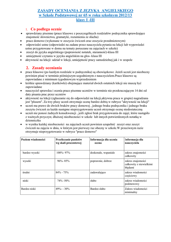 ZASADY OCENIANIA Z JĘZYKA ANGIELSKIEGO w Szkole Podstawowej nr 65 w roku szkolnym 2012/13 klasy I -III 1. Co podlega ocenie sprawdziany pisemne (prace klasowe z poszczególnych rozdziałów podręcznika sprawdzające znajomość słownictwa, gramatyki, rozumienia ze słuchu) prace domowe (wykonane w zeszycie ćwiczeń oraz zeszycie przedmiotowym) odpowiedzi ustne (odpowiedzi na zadane przez nauczyciela pytania na lekcji lub wypowiedzi ustne przygotowane w domu na tematy poruszane na zajęciach w szkole) zeszyt do języka angielskiego (poprawność notatek, staranność)-klasa III umiejętność czytania w języku angielskim na głos- klasa III aktywność na lekcji: udział w lekcji, umiejętność pracy samodzielnej jak i w zespole 2. Zasady oceniania prace klasowe (po każdym rozdziale w podręczniku) są obowiązkowe .Jeżeli uczeń jest nieobecny powinien pisać w terminie późniejszym uzgodnionym z nauczycielem.Prace klasowe są zapowiadane z minimum tygodniowym wyprzedzeniem krótkie sprawdziany (kartkówki) obejmujące materiał dwóch ostatnich lekcji nie muszą być zapowiadane nauczyciel sprawdza i ocenia prace pisemne uczniów w terminie nie przekraczającym 14 dni od daty pisania prac przez uczniów aktywność na lekcji (zgłaszanie się do odpowiedzi na lekcji,aktywna praca w grupie) nagradzana jest ''plusem''. Za trzy plusy uczeń otrzymuje ocenę bardzo dobrą w rubryce ''aktywność na lekcji'' uczeń ma prawo do dwóch braków pracy domowej , jednego braku podręcznika i jednego braku zeszytu ćwiczeń za każde następne nieprzygotowanie uczeń otrzymuje ocenę niedostateczną uczeń nie ponosi żadnych konsekwencji , jeśli zgłosi brak przygotowania do zajęć, które nastąpiło z ważnych przyczyn; dłuższej nieobecności w szkole lub innych potwierdzonych notatką w dzienniczku w wyniku każdej nieobecności na zajęciach uczeń powinien uzupełnić zeszyt oraz zeszyt ćwiczeń na zajęcia w dniu, w którym jest pierwszy raz obecny w szkole.W przeciwnym razie otrzymuje nieprzygotowanie w rubryce ''prace domowe'' Poziom wiadomości bardzo wysoki wysoki średni niski Bardzo niski Przeliczanie punktów wg skali procentowej Informacja dla ucznia ocena Informacja dla nauczyciela 100%- 97% doskonale, wspaniale zakres znajomości całkowity poprawnie, dobrze zakres znajomości całkowity z niewielkimi błędami zadawalająco zakres wiadomości częściowy słabo zakres wiadomości podstawowy Bardzo słabo Zakres wiadomości minimalny 96%- 85% 84% - 75% 74% -50% 49%- - 30% WYMAGANIA EDUKACYJNE Z JĘZYKA ANGIELSKIEGO DLA UCZNIÓW KLAS I Poziom bardzo wysoki posiada wysoką motywację do nauki języka angielskiego posiada wiadomości wykraczające poza program nauczania języka angielskiego reaguje werbalnie i niewerbalnie na wszystkie polecenia nauczyciela uważnie słucha wypowiedzi innych uczniów i nauczyciela rozumie sens historyjek i bajek bezbłędnie używa słownictwa, które było wprowadzone i utrwalane na lekcjach potrafi odpowiedzieć na pytanie, samodzielnie formułuje proste odpowiedzi recytuje wierszyki i rymowanki, śpiewa piosenki czyta pojedyncze wyrazy i proste zdania przepisuje pojedyncze wyrazy systematycznie i prawidłowo odrabia prace domowe uzyskuje najwyższą ilość punktów na testach podsumowujących każdy rozdział podręcznika chętnie bierze udział w lekcji bierze udział w konkursach i podejmuje się zadań dodatkowych posiada umiejętność pracy w zespole, łatwo komunikuje się z rówieśnikami Poziom wysoki bezbłędnie opanował wiadomości objęte programem nauczania języka angielskiego reaguje werbalnie i niewerbalnie na polecenia nauczyciela uważnie słucha wypowiedzi uczniów i nauczyciela zna większość słownictwa i dobrze się nim posługuje recytuje większość wierszyków i rymowanek, śpiewa piosenki czyta wyrazy i proste zdania popełniając nieliczne błędy przepisuje pojedyncze wyrazy systematycznie odrabia prace domowe popełnia sporadyczne błędy w testach podsumowujących każdy rozdział podręcznika chętnie bierze udział w lekcjach posiada umiejętność pracy w zespole i łatwo komunikuje się z rówieśnikami Poziom średni poprawnie opanował wiadomości objęte programem nauczania języka angielskiego ma niewielkie problemy ze zrozumieniem poleceń wydawanych przez nauczyciela i reagowaniem na nie uważnie słucha wypowiedzi uczniów i nauczyciela zna podstawowe słownictwo recytuje niektóre rymowanki, używa kilku zwrotów i wyrażeń czyta pojedyncze wyrazy przepisuje pojedyncze wyrazy z błędami zazwyczaj odrabia prace domowe posiada umiejętność pracy w zespole i łatwo komunikuje się z rówieśnikami Poziom niski z trudem opanowuje wiadomości objęte programem nauczania języka angielskiego reaguje na polecenia nauczyciela popełniając liczne błędy często myli poznane słowa używa kilku zwrotów i wyrażeń popełniając liczne błędy recytuje niektóre wersy rymowanek i piosenek ma trudności z przepisaniem krótkich wyrazów rzadko odrabia prace domowe Poziom bardzo niski opanował wiadomości objęte programem nauczania języka angielskiego w stopniu minimalnym sporadycznie reaguje na polecenia nauczyciela zna podstawowe słownictwo ma trudności z przepisaniem krótkich wyrazów powtarza za nauczycielem lub nagraniem popełniając liczne błędy śpiewa niektóre wersy piosenek i rymowanek sporadycznie odrabia prace domowe WYMAGANIA EDUKACYJNE Z JĘZYKA ANGIELSKIEGO DLA UCZNIÓW KLAS II Poziom bardzo wysoki posiada wysoką motywację do nauki języka angielskiego umiejętności i wiadomości ucznia wykraczają poza program nauczania języka angielskiego reaguje werbalnie i niewerbalnie na wszystkie polecenia nauczyciela posługuje się słownictwem wykraczającym poza program nauczania języka angielskiego udziela odpowiedzi na pytania samodzielnie zadaje pytania recytuje wiersze, rymowanki, śpiewa piosenki potrafi wyróżnić proste informacje z tekstu słuchanego rozumie sens 