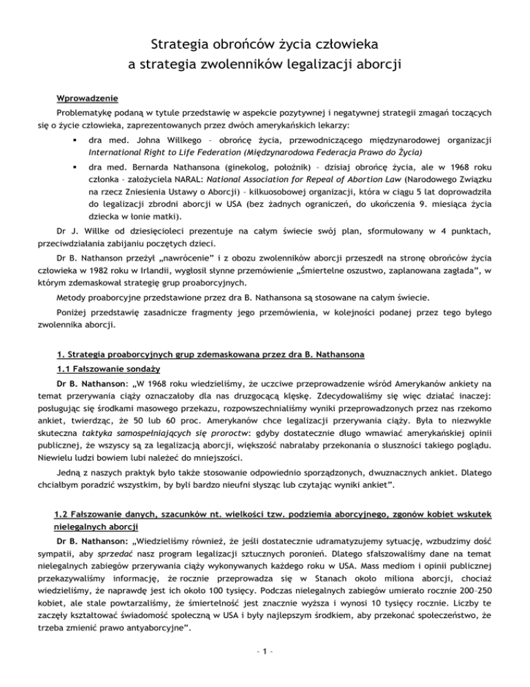 Strategia obrońców życia człowieka a strategia zwolenników legalizacji aborcji Wprowadzenie Problematykę podaną w tytule przedstawię w aspekcie pozytywnej i negatywnej strategii zmagań toczących się o życie człowieka, zaprezentowanych przez dwóch amerykańskich lekarzy: dra med. Johna Willkego – obrońcę życia, przewodniczącego międzynarodowej organizacji International Right to Life Federation (Międzynarodowa Federacja Prawo do Życia) dra med. Bernarda Nathansona (ginekolog, położnik) – dzisiaj obrońcę życia, ale w 1968 roku członka – założyciela NARAL: National Association for Repeal of Abortion Law (Narodowego Związku na rzecz Zniesienia Ustawy o Aborcji) – kilkuosobowej organizacji, która w ciągu 5 lat doprowadziła do legalizacji zbrodni aborcji w USA (bez żadnych ograniczeń, do ukończenia 9. miesiąca życia dziecka w łonie matki). Dr J. Willke od dziesięcioleci prezentuje na całym świecie swój plan, sformułowany w 4 punktach, przeciwdziałania zabijaniu poczętych dzieci. Dr B. Nathanson przeżył „nawrócenie” i z obozu zwolenników aborcji przeszedł na stronę obrońców życia człowieka w 1982 roku w Irlandii, wygłosił słynne przemówienie „Śmiertelne oszustwo, zaplanowana zagłada”, w którym zdemaskował strategię grup proaborcyjnych. Metody proaborcyjne przedstawione przez dra B. Nathansona są stosowane na całym świecie. Poniżej przedstawię zasadnicze fragmenty jego przemówienia, w kolejności podanej przez tego byłego zwolennika aborcji. 1. Strategia proaborcyjnych grup zdemaskowana przez dra B. Nathansona 1.1 Fałszowanie sondaży Dr B. Nathanson: „W 1968 roku wiedzieliśmy, że uczciwe przeprowadzenie wśród Amerykanów ankiety na temat przerywania ciąży oznaczałoby dla nas druzgocącą klęskę. Zdecydowaliśmy się więc działać inaczej: posługując się środkami masowego przekazu, rozpowszechnialiśmy wyniki przeprowadzonych przez nas rzekomo ankiet, twierdząc, że 50 lub 60 proc. Amerykanów chce legalizacji przerywania ciąży. Była to niezwykle skuteczna taktyka samospełniających się proroctw: gdyby dostatecznie długo wmawiać amerykańskiej opinii publicznej, że wszyscy są za legalizacją aborcji, większość nabrałaby przekonania o słuszności takiego poglądu. Niewielu ludzi bowiem lubi należeć do mniejszości. Jedną z naszych praktyk było także stosowanie odpowiednio sporządzonych, dwuznacznych ankiet. Dlatego chciałbym poradzić wszystkim, by byli bardzo nieufni słysząc lub czytając wyniki ankiet”. 1.2 Fałszowanie danych, szacunków nt. wielkości tzw. podziemia aborcyjnego, zgonów kobiet wskutek nielegalnych aborcji Dr B. Nathanson: „Wiedzieliśmy również, że jeśli dostatecznie udramatyzujemy sytuację, wzbudzimy dość sympatii, aby sprzedać nasz program legalizacji sztucznych poronień. Dlatego sfałszowaliśmy dane na temat nielegalnych zabiegów przerywania ciąży wykonywanych każdego roku w USA. Mass mediom i opinii publicznej przekazywaliśmy informację, że rocznie przeprowadza się w Stanach około miliona aborcji, chociaż wiedzieliśmy, że naprawdę jest ich około 100 tysięcy. Podczas nielegalnych zabiegów umierało rocznie 200–250 kobiet, ale stale powtarzaliśmy, że śmiertelność jest znacznie wyższa i wynosi 10 tysięcy rocznie. Liczby te zaczęły kształtować świadomość społeczną w USA i były najlepszym środkiem, aby przekonać społeczeństwo, że trzeba zmienić prawo antyaborcyjne”. –1– 1.3 Tzw. „Karta katolicka” Dr B. Nathanson: „Najważniejszą i najskuteczniejszą z taktyk, które stosowaliśmy podczas naszej działalności w latach 1968–1973, była tak zwana karta katolicka (…). Unikaliśmy jednak tego, aby wszystkich katolików traktować jednakowo. Zdawaliśmy sobie sprawę, że taka postawa poważnie by nam zaszkodziła. Potrzebowaliśmy pewnego wsparcia ze strony tych, których nazywaliśmy oświeconymi katolikami. Zamiast tego posługiwaliśmy się zbiorowym pojęciem hierarchii kościelnej, wystarczająco niejasnym, by przekonać wszystkich liberalnych intelektualistów, przeciwników wojny i środki masowego przekazu, że to właśnie Kościół winien jest powstaniu oporu przeciw legalizacji aborcji (...). Z naszych słów można było wyciągnąć tylko jeden wniosek: Kościół katolicki jest zdecydowany narzucić krajowi swoje przekonania dotyczące aborcji. To, co stanie się w najbliższych latach z prawami człowieka w USA, zależy od tego, jak zostanie rozwiązany problem przerywania ciąży. Nie wolno dopuścić, aby dogmatyczny Kościół katolicki przejął kompetencje prawodawców i próbował każdą kobietę zmusić do urodzenia dziecka. Postępowanie hierarchii jest nieugięte, opór przeciwko ustawie zezwalającej na aborcję pochodzi właśnie od niej a nie od większości katolików. W ten sposób oddzielaliśmy katolickich intelektualistów, środowiska postępowe i liberalne od hierarchów i wbiliśmy klin w katolicki opór przeciw sztucznym poronieniom. Powołując się na sfałszowane ankiety twierdziliśmy, że większość katolików opowiada się za reformą ustawy... Jakie było znaczenie organizowanej przez nas nagonki? Przede wszystkim przekonała ona media, że każdy, kto był przeciw dopuszczalności aborcji, musiał być katolikiem lub ulegać silnemu wpływowi hierarchii kościelnej. Rozpowszechniliśmy przekonanie, że katolicy, którzy są zwolennikami legalizacji aborcji, to intelektualiści, światli, postępowi ludzie. Chodziło nam o to, aby za pośrednictwem mediów przekonać społeczeństwo, że nie ma grup niekatolickich, które byłyby przeciw przerywaniu ciąży. W rzeczywistości w owym czasie (podobnie jak i teraz) przeciw dopuszczalności aborcji wypowiadało się wiele Kościołów: wschodnie kościoły prawosławne, Churches of Christ, American Baptist Association, zielonoświątkowcy... luteranie, metodyści, mormoni, ortodoksyjni żydz