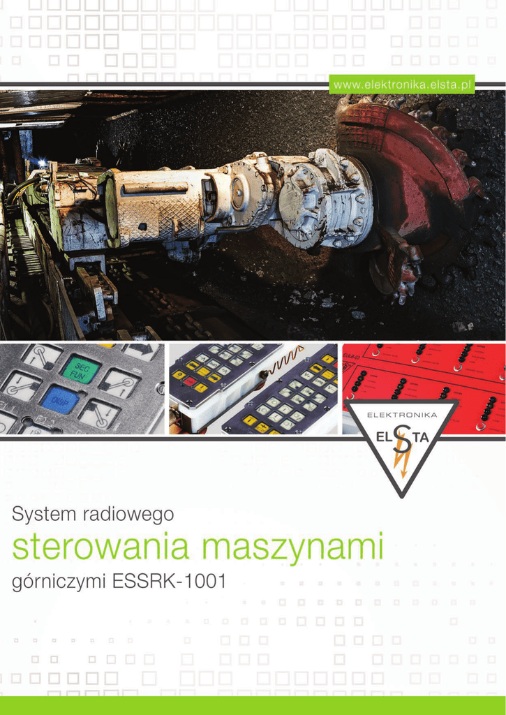 System radiowego sterowania maszynami górniczymi ESSRK-1001 Wstęp System Sterowania Radiowego Maszynami Górniczymi ESSRK-1001 to grupa urządzeń służących do zdalnego sterowania maszynami górniczymi. System występuje w wielu różnych wykonaniach i wersjach, które powstały w odpowiedzi na potrzeby czołowych producentów maszyn górniczych. System ESSRK-1001 zdobył uznanie użytkowników dzięki swojej niezawodności i jakości. Jest on obecnie najczęściej stosowanym układem zdalnego sterowania kombajnami ścianowymi w Polsce. System był wielokrotnie nagradzany - zdobył m.in. Złoty Medal Prezesa SEP w konkursie „Najwyższa Jakość MAŁOPOLSKA”. Poza rynkiem polskim urządzenia systemu ESSRK-1001 stosowane są również m.in. w kopalniach rosyjskich, ukraińskich, białoruskich, brytyjskich, czeskich, hiszpańskich, niemieckich, rumuńskich, węgierskich, a nawet argentyńskich, czy chińskich. Zastosowanie Podstawowym zastosowaniem systemu ESSRK-1001 są układy sterownia kombajnem ścianowym, ale system może być również wykorzystywany do pracy z kombajnami chodnikowymi, kolejkami spągowymi, tamami wentylacyjnymi, zwrotnicami, obudowami hydraulicznymi itp. Dodatkowo system ESSRK-1001 może być wzbogacony o układ sterowania oddalonego umożliwiający kontrolę zdalną maszyny z tzw. lokalizacji bezpiecznej (np. zdalnej dyspozytorni). Pozwala to na ciągłą eksploatację szczególnie niebezpiecznych odcinków ściany wydobywczej na których zabronione jest przebywanie operatorów maszyny. Podstawową zaletą opisywanego rozwiązania są jego duże możliwości konfiguracji i rozbudowy pozwalające na przystosowanie do indywidualnych wymagań producenta maszyny i końcowego użytkownika systemu. Uznanie zyskała również konstrukcja mechaniczna pilotów sterujących, które są po- • Stacja bazowa typu SBJ-433-20-01/* oraz wzmacniacz linii typu WLJ-433-16-01 - elementy systemu sterowania oddalonego z tzw. lokalizacji bezpiecznej wykorzystujące przewód promieniujący rozszerzający zasięg radiowy urządzeń ESSRK 1001 Podsumowanie Wybrane urządzenia systemu ESSRK-1001 spełniają zasadnicze wymagania Dyrektywy 94/9/WE (ATEX), co jest potwierdzone odpowiednimi certyfikatami badania typu WE. Urządzenia posiadają także certyfikaty rosyjskie pozwalające na sprzedaż i stosowanie wybranych elementów systemu na terenie Federacji Rosyjskiej. Więcej informacji można znaleźć w kartach katalogowych poszczególnych urządzeń oraz na stronie internetowej www.elektronika.elsta.pl strzegane jako urządzenia niezawodne i ergonomiczne. Elementy systemu ESSRK-1001 • Odbiornik sterowania radiowego typu EODB-01/*, EODBJ, EODBJ/7 - urządzenia odbiorcze montowane na maszynie służące do odbioru i przekazywania poleceń przesłanych przez piloty zdalnego sterowania • Pilot sterowania radiowego typu EPR-02/* - pilot sterowania radiowego wykorzystywany przez operatora maszyny • Bateria iskrobezpieczna typu EBIS-02 - bateria służąca do zasilania pilotów sterowania radiowego EPR-02/* • Pilot kablowy typu EPW-01 - dodatkowy pilot sterujący służący do realizacji sterowania kablowego • Adapter EADP-02/* - urządzenie pomocnicze służące do podłączania pilota radiowego EPR 02/* w trybie kablowym • Ładowarka typu EUŁB-03 - stacja obsługi baterii EBIS-02 wykorzystywanych do zasilania urządzeń przenośnych systemu Elsta Elektronika Sp. z o.o. S.K.A. 32-020 Wieliczka, ul. Janińska 32, e-mail: [email protected] tel.: +48 12 350 13 50, fax: +48 12 350 13 60 www.elektronika.elsta.pl