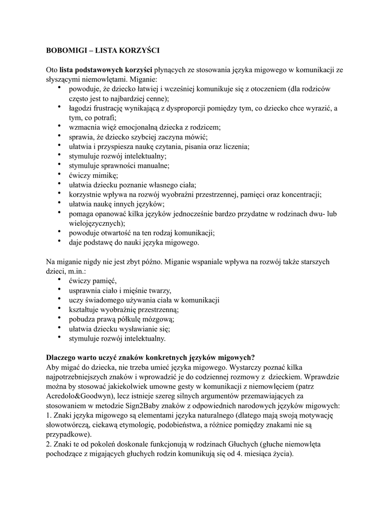 BOBOMIGI – LISTA KORZYŚCI Oto lista podstawowych korzyści płynących ze stosowania języka migowego w komunikacji ze słyszącymi niemowlętami. Miganie: • powoduje, że dziecko łatwiej i wcześniej komunikuje się z otoczeniem (dla rodziców często jest to najbardziej cenne); • łagodzi frustrację wynikającą z dysproporcji pomiędzy tym, co dziecko chce wyrazić, a tym, co potrafi; • wzmacnia więź emocjonalną dziecka z rodzicem; • sprawia, że dziecko szybciej zaczyna mówić; • ułatwia i przyspiesza naukę czytania, pisania oraz liczenia; • stymuluje rozwój intelektualny; • stymuluje sprawności manualne; • ćwiczy mimikę; • ułatwia dziecku poznanie własnego ciała; • korzystnie wpływa na rozwój wyobraźni przestrzennej, pamięci oraz koncentracji; • ułatwia naukę innych języków; • pomaga opanować kilka języków jednocześnie bardzo przydatne w rodzinach dwu- lub wielojęzycznych); • powoduje otwartość na ten rodzaj komunikacji; • daje podstawę do nauki języka migowego. Na miganie nigdy nie jest zbyt późno. Miganie wspaniale wpływa na rozwój także starszych dzieci, m.in.: • ćwiczy pamięć, • usprawnia ciało i mięśnie twarzy, • uczy świadomego używania ciała w komunikacji • kształtuje wyobraźnię przestrzenną; • pobudza prawą półkulę mózgową; • ułatwia dziecku wysławianie się; • stymuluje rozwój intelektualny. Dlaczego warto uczyć znaków konkretnych języków migowych? Aby migać do dziecka, nie trzeba umieć języka migowego. Wystarczy poznać kilka najpotrzebniejszych znaków i wprowadzić je do codziennej rozmowy z dzieckiem. Wprawdzie można by stosować jakiekolwiek umowne gesty w komunikacji z niemowlęciem (patrz Acredolo&Goodwyn), lecz istnieje szereg silnych argumentów przemawiających za stosowaniem w metodzie Sign2Baby znaków z odpowiednich narodowych języków migowych: 1. Znaki języka migowego są elementami języka naturalnego (dlatego mają swoją motywację słowotwórczą, ciekawą etymologię, podobieństwa, a różnice pomiędzy znakami nie są przypadkowe). 2. Znaki te od pokoleń doskonale funkcjonują w rodzinach Głuchych (głuche niemowlęta pochodzące z migających głuchych rodzin komunikują się od 4. miesiąca życia). 3. W związku z tym, że języki migowe wykorzystują ruch, przestrzeń, mimikę, dzieci ucząc się języka migowego rozwijają koordynację wzrokowo-ruchową, ćwiczą mimikę, pamięć przestrzenną i usprawniają małą i dużą motorykę. 4. Wysiłek włożony przez rodziców i dziecko w naukę znaków może być krokiem ku znajomości konkretnego języka migowego. Znajomość języka migowego staje się coraz bardziej ceniona i pożądana w związku z rosnącym zapotrzebowaniem na tłumaczy. 5. Migających dzieci jest coraz więcej istnieje szansa, że dzieci te będą mogły migać między sobą, a co jeszcze ciekawsze - rozmawiać z głuchymi rówieśnikami. 6. W Polsce BOBOMIGI mają dodatkowo spełniać funkcję promowania języka migowego i problemów społeczności Głuchych. SZEROKIE ZASTOSOWANIE SIGN2BABY 1. Miganie w rodzinach wielojęzycznych. 2. Miganie w żłobkach i przedszkolach. 3. Miganie w szpitalach dziecięcych. 4. Miganie jako element warsztatów terapeutycznych i samorozwojowych. 5. Miganie do dzieci z syndromem Downa, autyzmem, porażeniem mózgowym, apraksją mowy, afazją, upośledzeniem zdolności uczenia się czy dziedziczonym syndromem alkoholowym. 6. Miganie jako środek komunikacji dla dzieci przechodzących różne formy leczenia i znajdujących się w różnych sytuacjach zdrowotnych, np.: niemowlęta i dzieci po tracheotomii, stany pooperacyjne hamujące mowę, skutki uboczne chemioterapii powodujące niemożność mówienia.