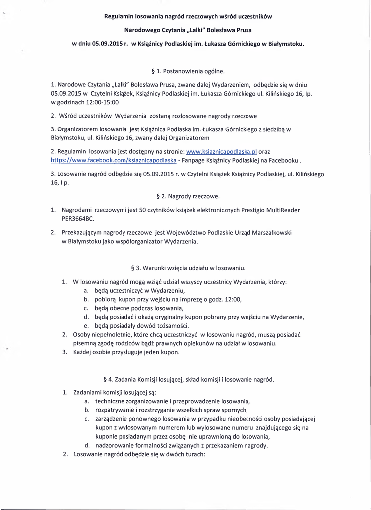 Regulamin losowania nagród rzeczowych wśród uczestników Narodowego Czytania „Lalki" Bolesława Prusa w dniu 05.09.2015 r. w Książnicy Podlaskiej im. Łukasza Górnickiego w Białymstoku. § 1. Postanowienia ogólne. 1. Narodowe Czytania „Lalki" Bolesława Prusa, zwane dalej Wydarzeniem, odbędzie się w dniu 05.09.2015 w Czytelni Książek, Książnicy Podlaskiej im. Łukasza Górnickiego ul. Kilińskiego 16, Ip. w godzinach 12:00-15:00 2. Wśród uczestników Wydarzenia zostaną rozlosowane nagrody rzeczowe 3. Organizatorem losowania jest Książnica Podlaska im. Łukasza Górnickiego z siedzibą w Białymstoku, ul. Kilińskiego 16, zwany dalej Organizatorem 2. Regulamin losowania jest dostępny na stronie: www.ksiaznicapodlaska.pl oraz https://www.facebook.com/ksiaznicapodlaska - Fanpage Książnicy Podlaskiej na Facebooku . 3. Losowanie nagród odbędzie się 05.09.2015 r. w Czytelni Książek Książnicy Podlaskiej, ul. Kilińskiego 16,1p. § 2. Nagrody rzeczowe. 1. Nagrodami rzeczowymi jest 50 czytników książek elektronicznych Prestigio MultiReader PER3664BC. 2. Przekazującym nagrody rzeczowe jest Województwo Podlaskie Urząd Marszałkowski w Białymstoku jako współorganizator Wydarzenia. § 3. Warunki wzięcia udziału w losowaniu. 1. W losowaniu nagród mogą wziąć udział wszyscy uczestnicy Wydarzenia, którzy: a. będą uczestniczyć w Wydarzeniu, b. pobiorą kupon przy wejściu na imprezę o godz. 12:00, c. będą obecne podczas losowania, d. będą posiadać i okażą oryginalny kupon pobrany przy wejściu na Wydarzenie, e. będą posiadały dowód tożsamości. 2. Osoby niepełnoletnie, które chcą uczestniczyć w losowaniu nagród, muszą posiadać pisemną zgodę rodziców bądź prawnych opiekunów na udział w losowaniu. 3. Każdej osobie przysługuje jeden kupon. § 4. Zadania Komisji losującej, skład komisji i losowanie nagród. 1. Zadaniami komisji losującej są: a. techniczne zorganizowanie i przeprowadzenie losowania, b. rozpatrywanie i rozstrzyganie wszelkich spraw spornych, c. zarządzenie ponownego losowania w przypadku nieobecności osoby posiadającej kupon z wylosowanym numerem lub wylosowane numeru znajdującego się na kuponie posiadanym przez osobę nie uprawnioną do losowania, d. nadzorowanie formalności związanych z przekazaniem nagrody. 2. Losowanie nagród odbędzie się w dwóch turach: a. po części oficjalnej, ok. godziny 12:15 - Marszałek Województwa Podlaskiego Mieczysław Kazimierz Baszko wylosuje 5 numerów, poprosi o wystąpienie osób posiadających kupony o wylosowanych numerach i uroczyście wręczy nagrody, b. po zakończeniu Wydarzenia , które przewidywane jest na godz. 15:00 zostaną wylosowanych pozostałych 45 numerów. 3. Organizatorami losowania w II turze będzie Dyrekcja Książnicy Podlaskiej oraz pracownicy Działu Naukowego, Promocji i Wydawnictw. 4. Po każdym losowaniu zostanie wyczytany wylosowany numer. Jeżeli po trzy krotnym wyczytaniu numeru osoba posiadająca kupon z tym numerem nie zgłosi się nagroda podlega kolejnemu losowaniu, a wyczytany już raz numer nie bierze udziału w kolejnych losowaniach. § 5. Warunki odbioru nagrody. 1. Warunkiem odbioru nagrody jest zgłoszenie się do komisji z oryginalnym kuponem oznaczonym wylosowanym numerem. 2. Posiadacz kuponu z wylosowanym numerem otrzymuje nagrodę rzeczową po podaniu danych osobowych, ich zweryfikowaniu przez członka komisji oraz poświadczenia odbioru nagrody własnoręcznym podpisem. 3. Osoby wylosowane w II turze, po złożeniu stosownych oświadczeń, za pokwitowaniem odbierają wylosowane nagrody - odbiór osobisty do 14.09.2015 r. do godz. 15:00. 4. Osoby, o których mowa w § 3 ust.2 Regulaminu mogą dostarczyć Organizatorowi zgodę na udział w losowaniu do dnia 14.09.2015 r. do godz. 15:00 Po złożeniu stosownych oświadczeń otrzymają, za pokwitowaniem, wylosowane nagrody. § 6. Postanowienia końcowe. 1. Dane osobowe przekazane Organizatorowi przez uczestników losowania będą przetwarzane tylko i wyłącznie w celu: realizacji losowania, wyłonienia zwycięzców i nie będą podlegały dalszemu przetwarzaniu, nie będą przechowywane dłużej niż będzie to niezbędne z uwagi na obowiązujące przepisy prawa oraz regulamin losowania. 2. Podanie danych osobowych jest dobrowolne i jest warunkiem uczestnictwa w losowaniu i otrzymaniu nagrody. 3. Przystąpienie do konkursu jest równoznaczne z akceptacją regulaminu losowania. 4. Ostateczna interpretacja regulaminu należy do Organizatora - Książnicy Podlaskiej im. Łukasza Górnickiego w Białymstoku. 5. Organizator zastrzega sobie prawo do przerwania lub odwołania losowania nagród bez podania przyczyn. Informacja o ewentualnych zmianach będzie publikowania wyłącznie na stronie internetowej Książnicy Podlaskiej www.ksiaznicapodlaska.pl oraz profilu Facebook Książnicy Podlaskiej https://www.facebook.com/ksiaznicapodlaska. 6. Udział w losowaniu nagród jest równoznaczny z podpisaniem oświadczenia o wyrażeniu zgody na przetwarzanie danych osobowych, a tym samym z wyrażeniem przez osoby uczestniczące (w przypadku osoby niepełnoletniej- przez rodzica lub opiekuna prawnego) zgody na przetwarzanie przez Organizatora ich danych osobowych na potrzeby Narodowego Czytania / ustawa z dnia 29.08.1997 r. o ochronie danych osobowych (Dz. U. Nr 101 poz. 926 z póź. zm .) oraz wykorzystania wizerunku na potrzeby promocji Książnicy Podlaskiej / art. 81 Ustawy o prawie autorskim i prawach pokrewnych. Z-ca D ds dr
