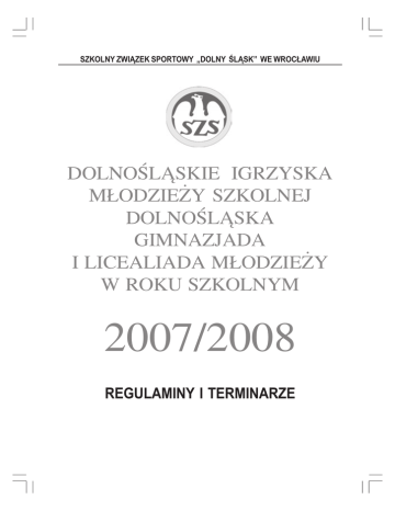 SZKOLNY ZWIĄZEK SPORTOWY „DOLNY ŚLĄSK” WE WROCŁAWIU DOLNOŒL¥SKIE IGRZYSKA M£ODZIE¯Y SZKOLNEJ DOLNOŒL¥SKA GIMNAZJADA I LICEALIADA M£ODZIE¯Y W ROKU SZKOLNYM 2007/2008 REGULAMINY I TERMINARZE © Copyright by Szkolny Zwi¹zek Sportowy – Dolny Œl¹sk Wroc³aw 2007 Redaktor: Adam Szymczak Opracowanie graficzne: Piotr Kurzyca ISSN 1641-0483 Druk: MULTIFORMAT 53-302 Wroc³aw ul. Œlê¿na 46 Panie i Panowie Burmistrzowie, Wójtowie, Prezydenci i Starostowie Dyrektorzy Szkó³ Nauczyciele Wychowania Fizycznego Uczniowie Szkó³ w województwie dolnoœl¹skim Nauczyciele i m³odzie¿ województwa dolnoœl¹skiego w sposób bardzo uroczysty rozpoczn¹ nowy rok szkolny. Spotkamy siê 14 wrzeœnia na Stadionie Olimpijskim we Wroc³awiu na Ogólnopolskiej Inauguracji Sportowego Roku Szkolnego 2007/2008. Przyznanie nam organizacji tej uroczystoœci to jeden z dowodów uznania dla wszystkich osób i instytucji pracuj¹cych dla dobra dzieci i m³odzie¿y, która pokocha³a sport i rekreacjê i która poprzez udzia³ w naszych imprezach chce poprawiæ swoj¹ tê¿yznê fizyczn¹. Poprzedni rok szkolny przyniós³ nam zwiêkszon¹ liczbê imprez sportowych, a co wa¿niejsze wiêksz¹ liczbê startuj¹cej w nich m³odzie¿y. To rok wielkich osi¹gniêæ sportowych naszych uczniów na imprezach ogólnopolskich i miêdzynarodowych. To w koñcu rok, gdy ustabilizowa³a siê w wielu powiatach i gminach sytuacja finansowo – organizacyjna Szkolnego Zwi¹zku Sportowego. Nie wszêdzie jest jeszcze tak jakbyœmy sobie tego ¿yczyli, ale mamy nadziejê, ¿e odpowiedzialne instytucje i osoby wezm¹ w tym roku przyk³ad z tych najlepszych. Zarz¹d SZS Dolny Œl¹sk w imieniu wszystkich uczniów i nauczycieli chcia³by serdecznie podziêkowaæ wszystkim tym osobom i instytucjom, które pomog³y nam w realizacji Kalendarza ; Ministerstwu Sportu i Urzêdowi Marsza³kowskiemu Województwa Dolnoœl¹skiego, samorz¹dom powiatowym i gminnym oraz sponsorom Szczególne s³owa podziêkowania kierujemy do nauczycieli wychowania fizycznego i innych przedmiotów, którzy pomagali we wszystkich naszych dzia³aniach; to dziêki Wam mo¿emy poszczyciæ siê piêknymi osi¹gniêciami Nowy rok szkolny przyniesie nowe wyzwania; chcemy spróbowaæ, oprócz utrzymania pozytywnych tendencji, pokusiæ siê o pozyskanie dodatkowych œrodków finansowych, przede wszystkim z Unii Europejskiej, na ciekawe przedsiêwziêcia zdecydowanie zwiêkszaj¹ce zakres dzia³ania naszego stowarzyszenia. Mamy nadziejê, ¿e pomo¿ecie nam w tych staraniach. ¯yczê zapa³u i optymizmu oraz spe³nienia wszelkich marzeñ, które macie Pañstwo rozpoczynaj¹c rok szkolny 2007/2008 Przewodnicz¹ca SZS Dolny Œl¹sk Dolnoœl¹ski Kurator Oœwiaty Beata Paw³owicz Wroc³aw, wrzesieñ 2007 KALENDARZ IMPREZ SPORTOWYCH 2007/2008 Półfinały strefowe i finały dolnośląskie imprez wchodzących w skład Dolnośląskich Igrzysk Młodzieży Szkolnej, Dolnośląskiej Gimnazjady Młodzieży i Dolnośląskiej Licealiady Młodzieży dofinansowywane są ze środków: Ministerstwa Sportu Urzędu Marszałkowskiego Województwa Dolnośląskiego Nagrody dla medalistów finałów Dolnośląskich Igrzysk Młodzieży Szkolnej, Dolnośląskiej Gimnazjady i Licealiady Młodzieży w roku 2007/2008 funduje firma POWERMAN Sport 4 KALENDARZ IMPREZ SPORTOWYCH 2007/2008 REGULAMIN OGÓLNY WOJEWÓDZKIEGO WSPÓŁZAWODNICTWA SZKÓŁ I. Cel Celem współzawodnictwa jest upowszechnianie sportu wśród młodzieży szkolnej, aktywne uczestnictwo dzieci i młodzieży w szkolnych i międzyszkolnych imprezach sportowych stanowiących kontynuację celów i zadań wychowania fizycznego i zdrowotnego, propagowanie zdrowego stylu życia , ocena pracy Szkolnych i Uczniowskich Klubów Sportowych oraz w wybranych dyscyplinach wyłonienie szkoły, która reprezentowała będzie nasze województwo w imprezach ogólnopolskich. II. Organizator Organizatorem współzawodnictwa na wszystkich szczeblach jest Szkolny Związek Sportowy III. Etapy Etap szkolny Etap ten przeprowadzany jest w poszczególnych szkołach zgodnie z programem ustalonym na posiedzeniu Szkolnego lub Uczniowskiego Klubu Sportowego. Organizator - Szkolny lub Uczniowski Klub Sportowy Etap gminny przeprowadzany według programu ustalonego przez właściwy Zarząd Szkolnego Związku Sportowego po konsultacjach z nauczycielami wychowania fizycznego. Organizator - Gminny Koordynator Imprez SZS współdziałający z władzami samorządowymi miast i gmin Etap powiatowy przeprowadzany wg regulaminów Igrzysk, Gimnazjady i Licealiady w dyscyplinach objętych ich programem, bądź według regulaminów ustalonych przez właściwy Powiatowy Szkolny Związek Sportowy w pozostałych dyscyplinach Organizator - Powiatowy Koordynator Imprez SZS współdziałający z właściwym Starostwem Etap wojewódzki przeprowadzany wg regulaminów zawartych w niniejszym wydawnictwie z udziałem w większości przypadków drużyn wyłonionych w finałach powiatowych lub strefowych Organizator - SZS DOLNY Śląsk we współpracy z właściwymi Dolnośląskimi Związkami Sportowymi, ogniwami SZS i najlepszymi szkołami 5 KALENDARZ IMPREZ SPORTOWYCH 2007/2008 Zawody na wszystkich szczeblach odbędą się w następujących kategoriach : Igrzyska Młodzieży Szkolnej Gimnazjada Licealiada - dla uczniów szkół podstawowych, klasy I – VI - dla uczniów gimnazjów - dla uczniów szkół ponadgimnazjalnych wszystkich typów IV. Uczestnictwo 1. Udział szkół w zawodach sportowych organizowanych przez Szkolny Związek Sportowy jest dobrowolny. Uznając jednak rolę sportu w kształtowaniu sprawności fizycznej i zdrowia młodzieży zachęcamy wszystkie szkoły do udziału w rozgrywkach sportowych. 2. W zawodach wojewódzkich mają prawo startu reprezentacje wg ustaleń regulaminów szczegółowych 3. O udziale w kolejnym etapie decyduje start w zawodach niższego szczebla 4. We wszystkich dyscyplinach drużynowych zespół składa się wyłącznie z uczni