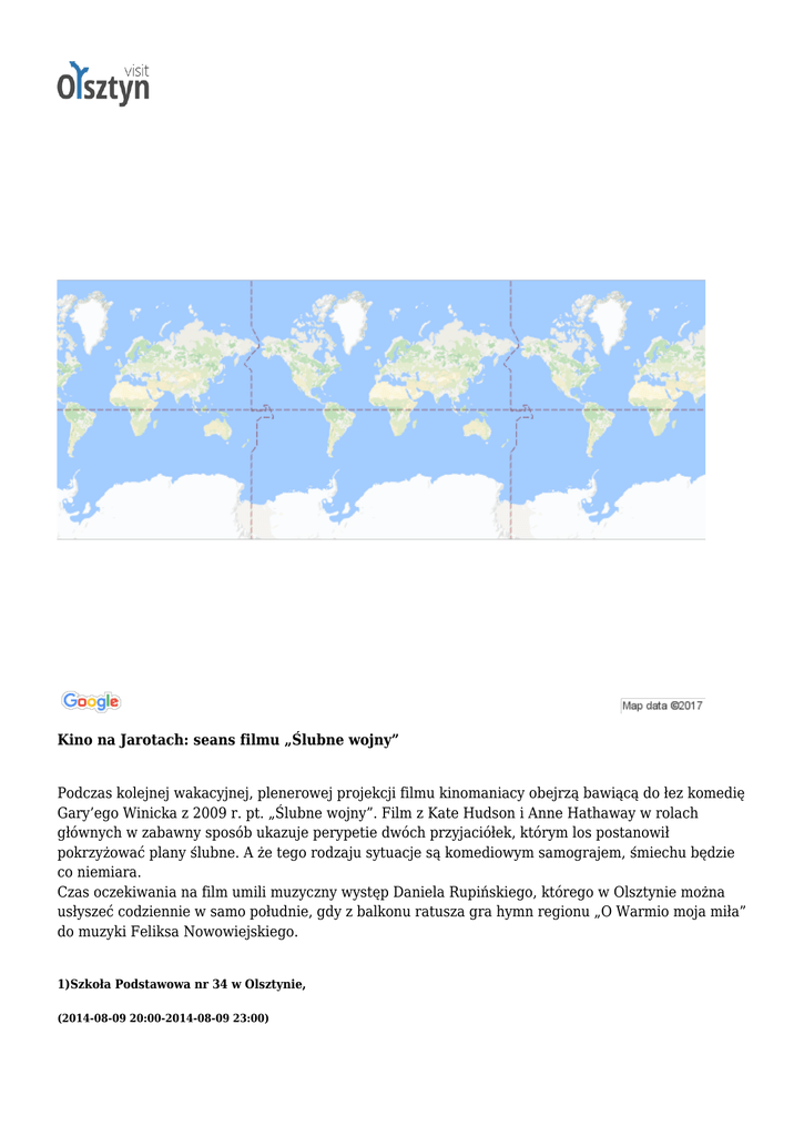 Kino na Jarotach: seans filmu „Ślubne wojny” Podczas kolejnej wakacyjnej, plenerowej projekcji filmu kinomaniacy obejrzą bawiącą do łez komedię Gary’ego Winicka z 2009 r. pt. „Ślubne wojny”. Film z Kate Hudson i Anne Hathaway w rolach głównych w zabawny sposób ukazuje perypetie dwóch przyjaciółek, którym los postanowił pokrzyżować plany ślubne. A że tego rodzaju sytuacje są komediowym samograjem, śmiechu będzie co niemiara. Czas oczekiwania na film umili muzyczny występ Daniela Rupińskiego, którego w Olsztynie można usłyszeć codziennie w samo południe, gdy z balkonu ratusza gra hymn regionu „O Warmio moja miła” do muzyki Feliksa Nowowiejskiego. 1)Szkoła Podstawowa nr 34 w Olsztynie, (2014-08-09 20:00-2014-08-09 23:00) www.visit.olsztyn.eu